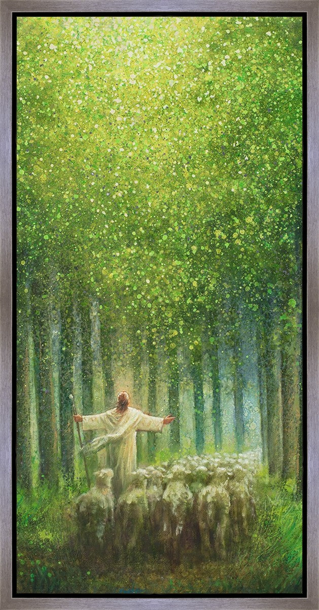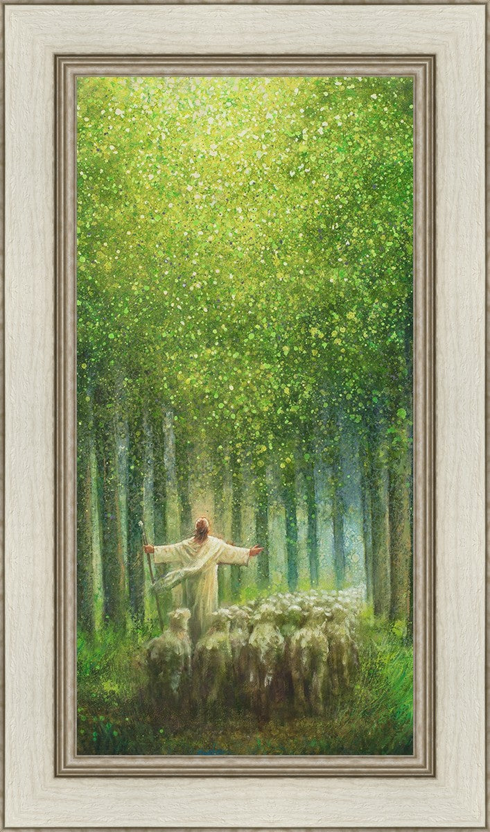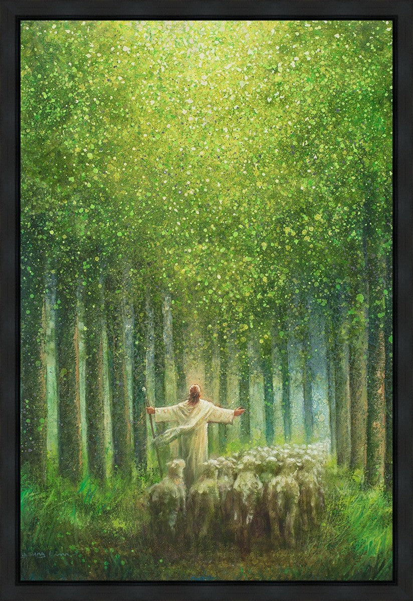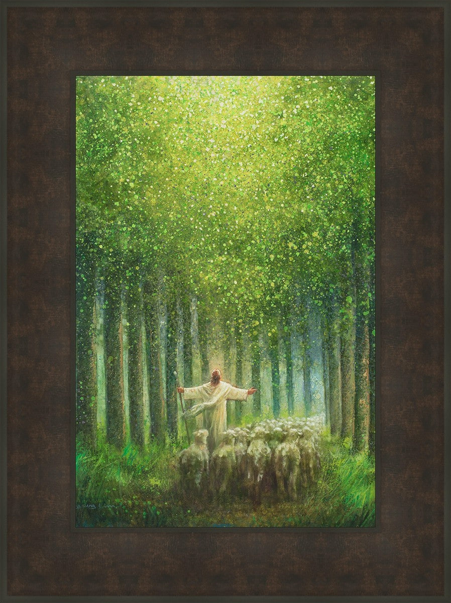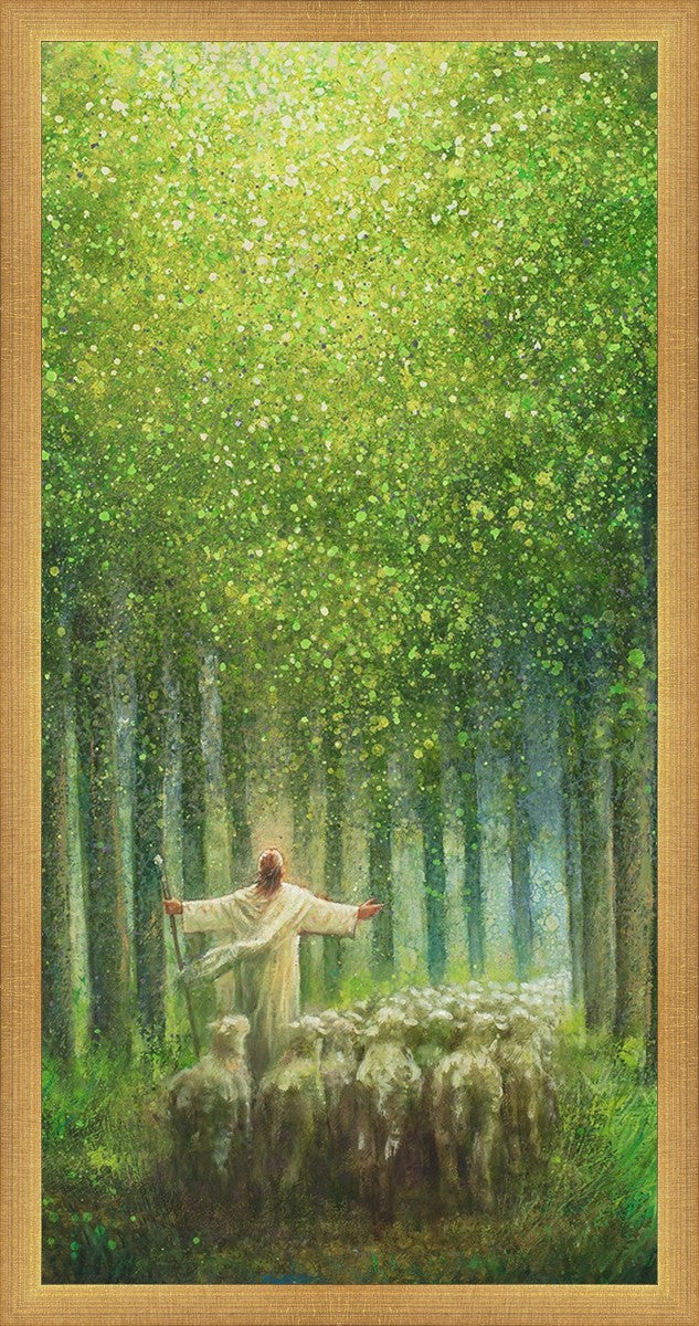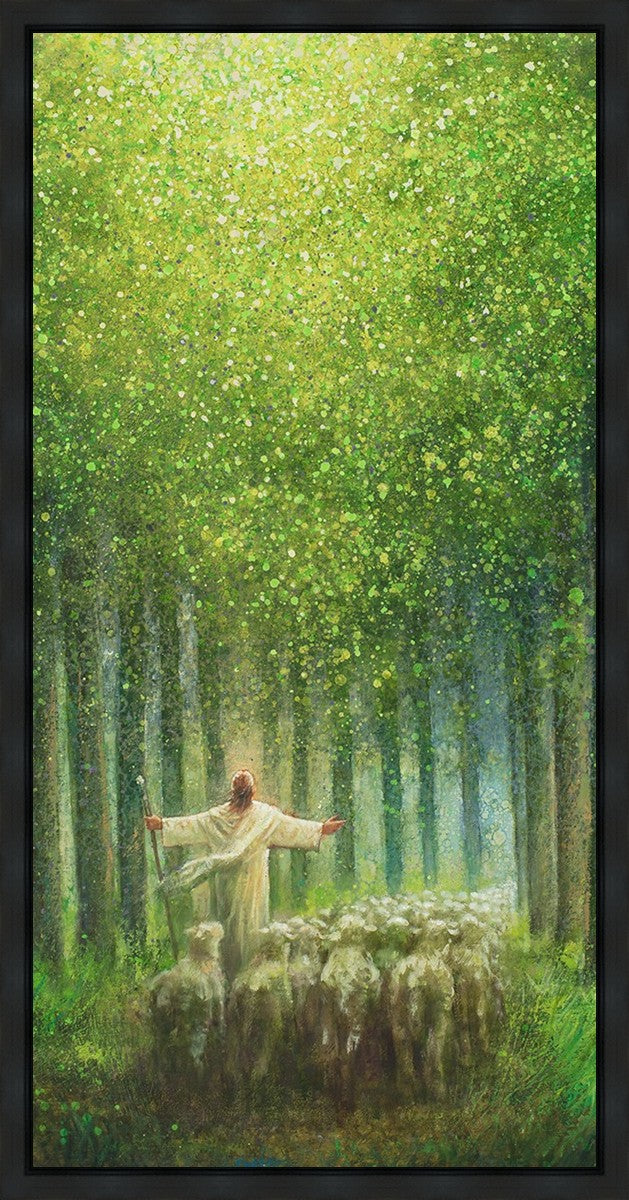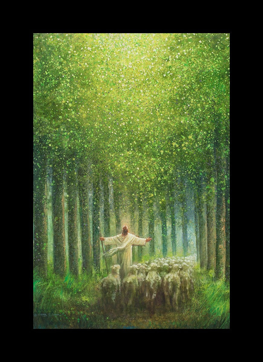 In the depths of a dark and mysterious forest the Good Shepherd guides a flock of sheep with gentle authority. The radiant light of God illuminates the way. The heavenly glow of God's light serves as a constant reminder that even in the most foreboding circumstances, Jesus will guide his beloved flock to the eternal pastures of peace and fulfillment.