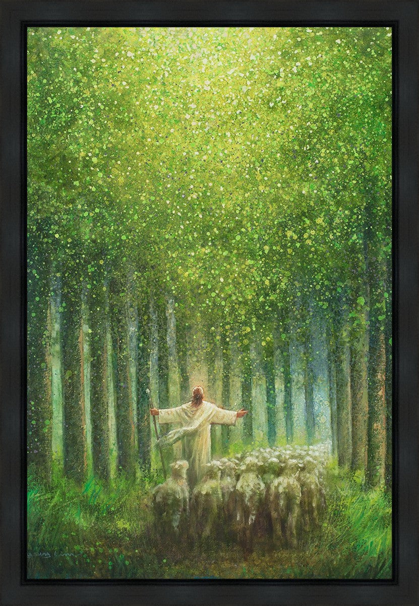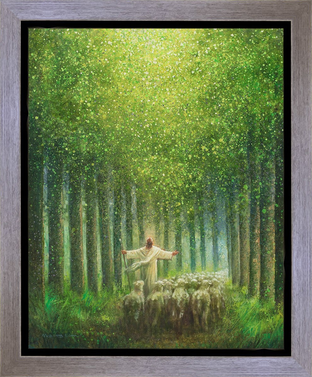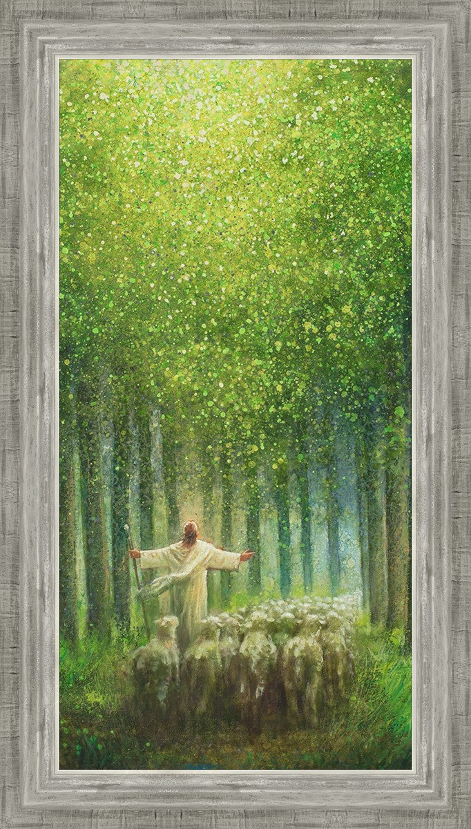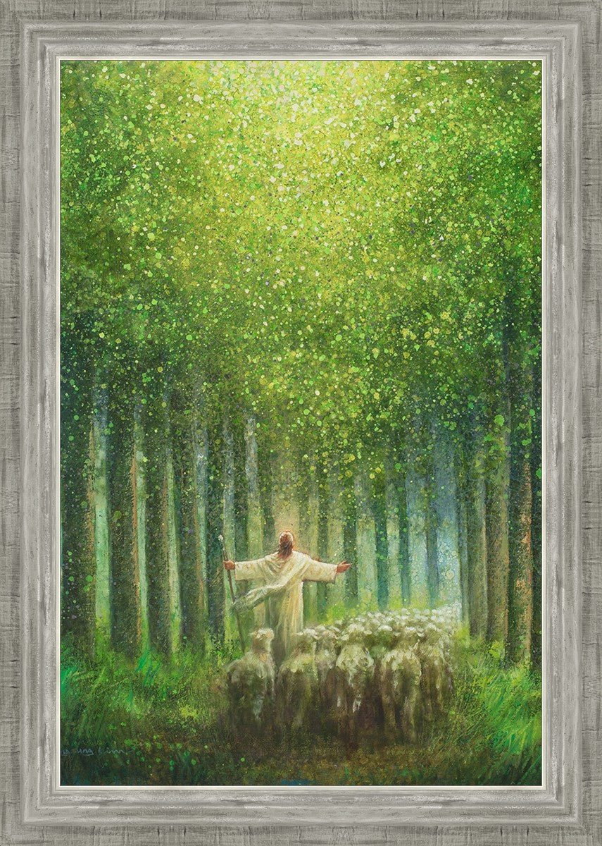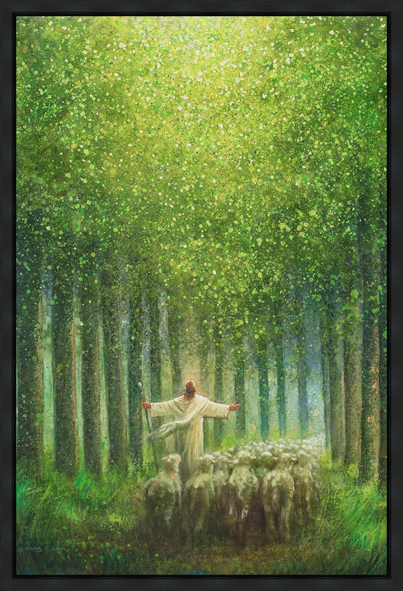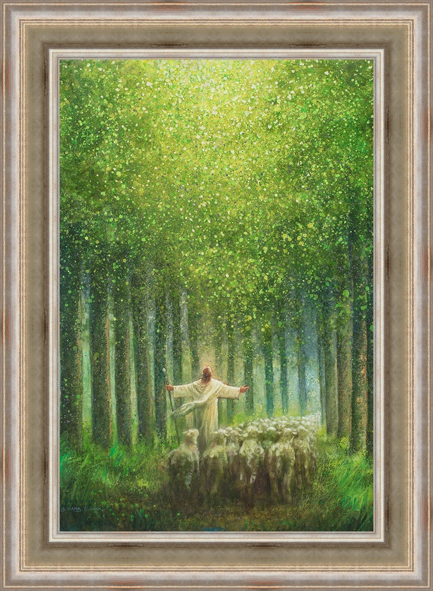 In the depths of a dark and mysterious forest the Good Shepherd guides a flock of sheep with gentle authority. The radiant light of God illuminates the way. The heavenly glow of God's light serves as a constant reminder that even in the most foreboding circumstances, Jesus will guide his beloved flock to the eternal pastures of peace and fulfillment.