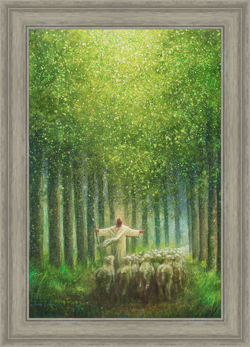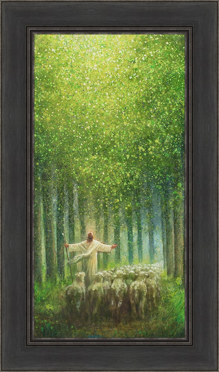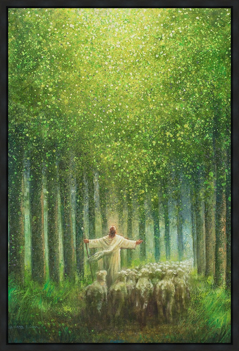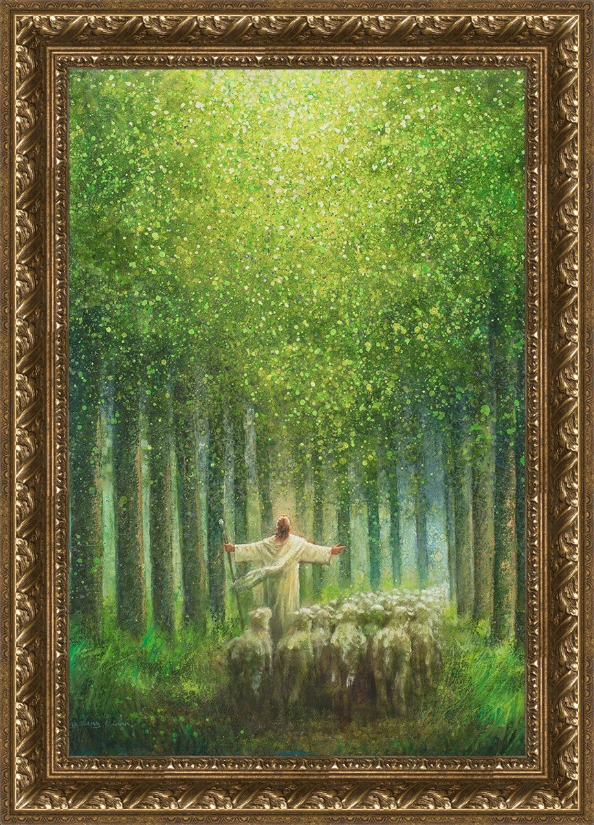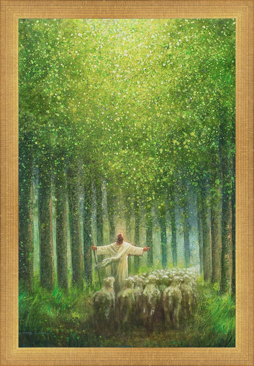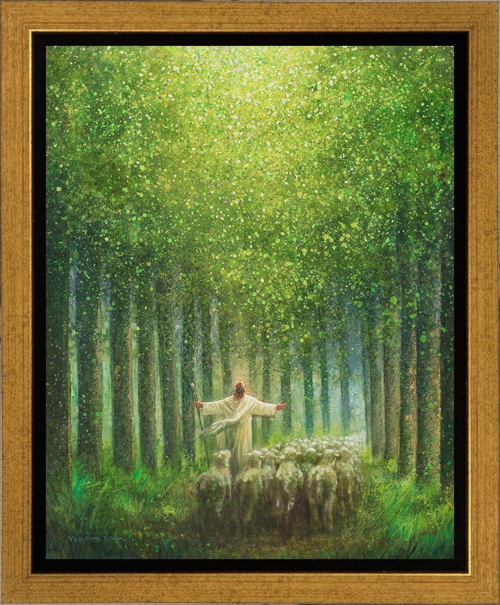 In the depths of a dark and mysterious forest the Good Shepherd guides a flock of sheep with gentle authority. The radiant light of God illuminates the way. The heavenly glow of God's light serves as a constant reminder that even in the most foreboding circumstances, Jesus will guide his beloved flock to the eternal pastures of peace and fulfillment.