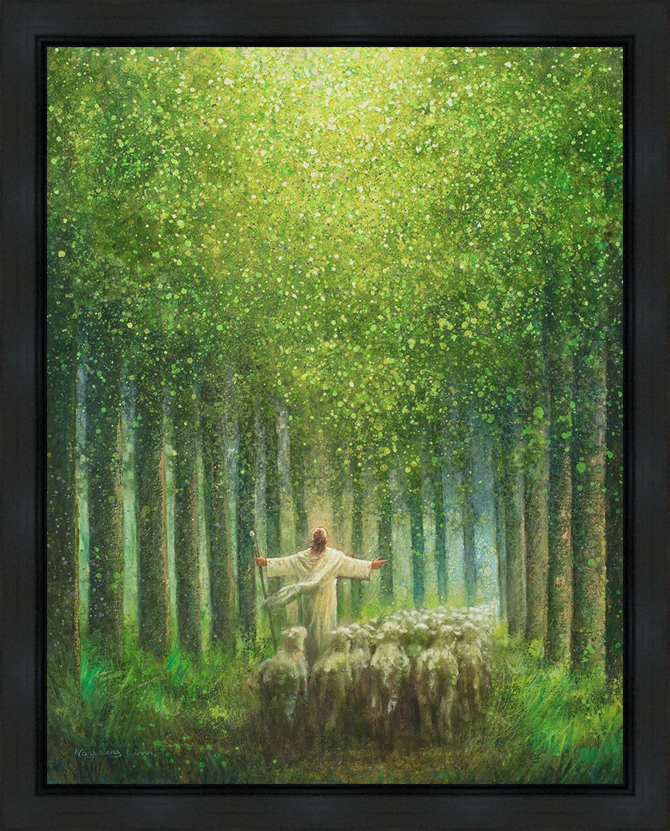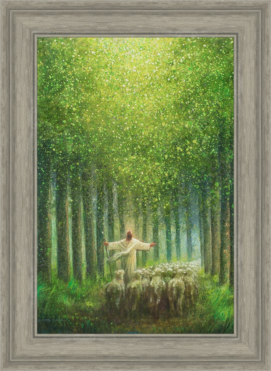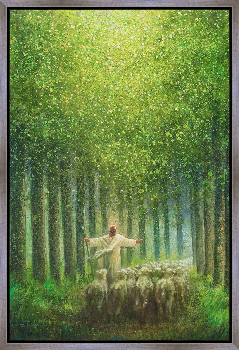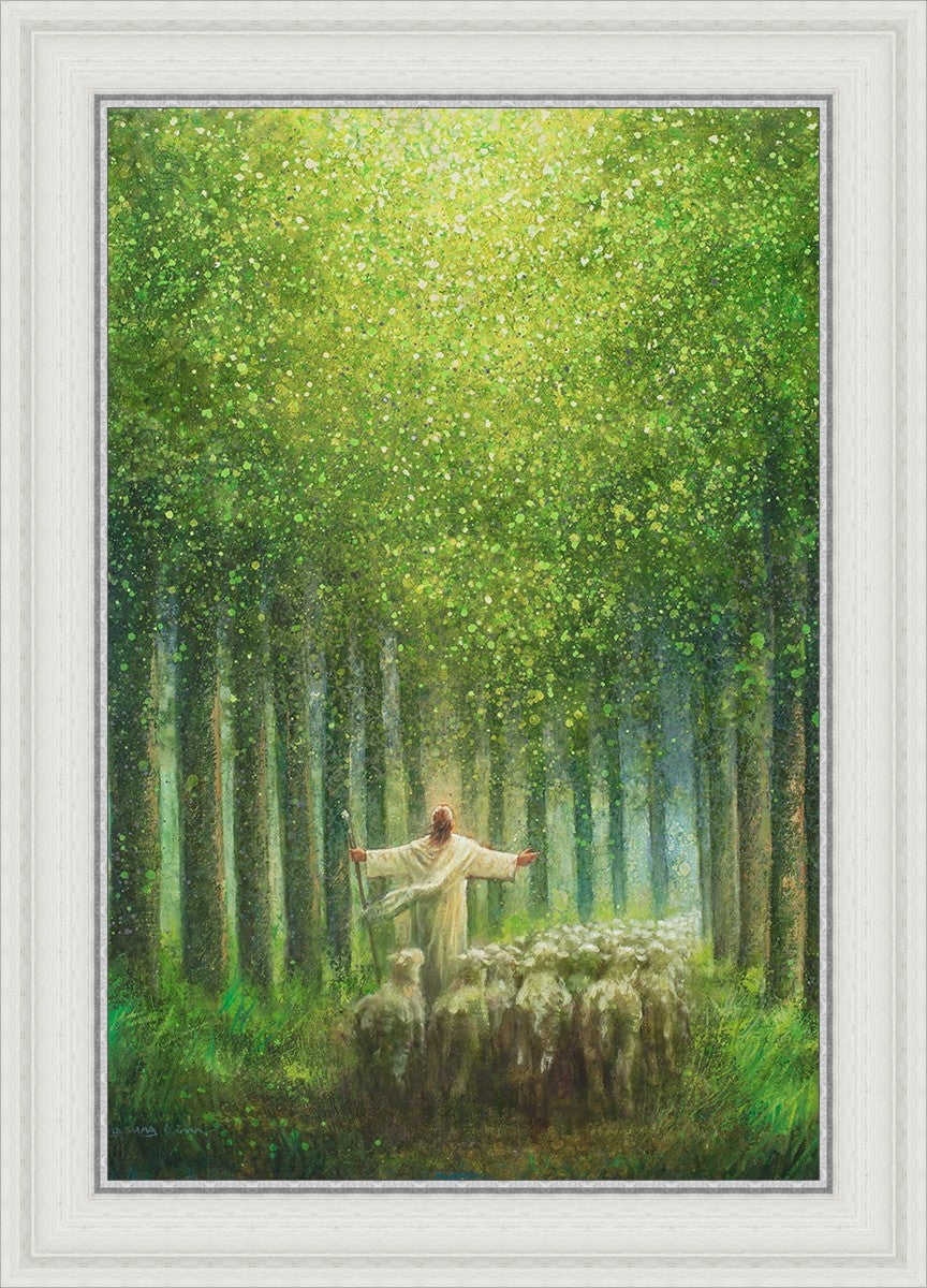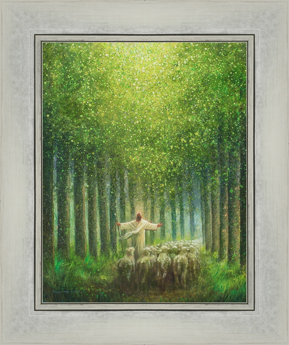 In the depths of a dark and mysterious forest the Good Shepherd guides a flock of sheep with gentle authority. The radiant light of God illuminates the way. The heavenly glow of God's light serves as a constant reminder that even in the most foreboding circumstances, Jesus will guide his beloved flock to the eternal pastures of peace and fulfillment.