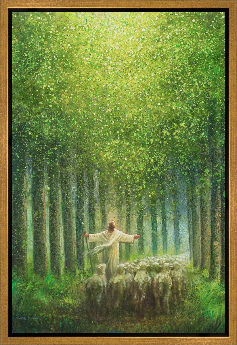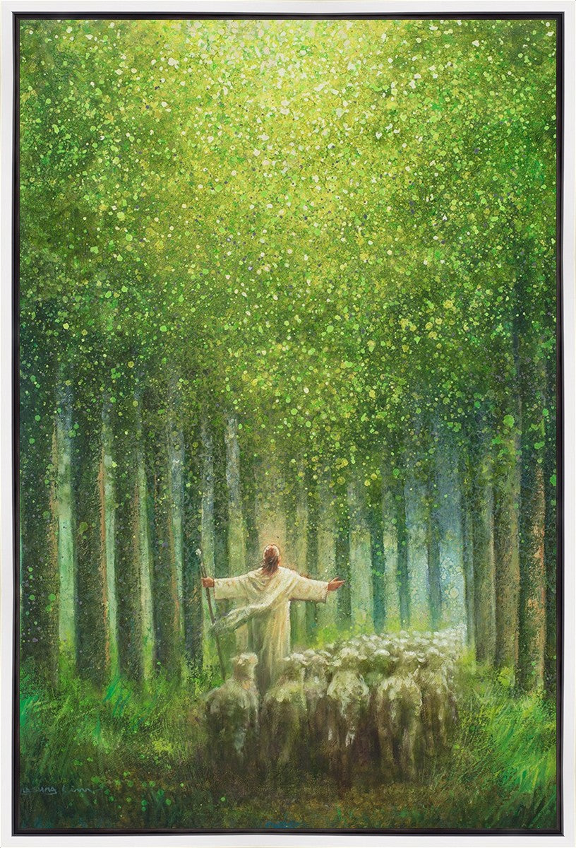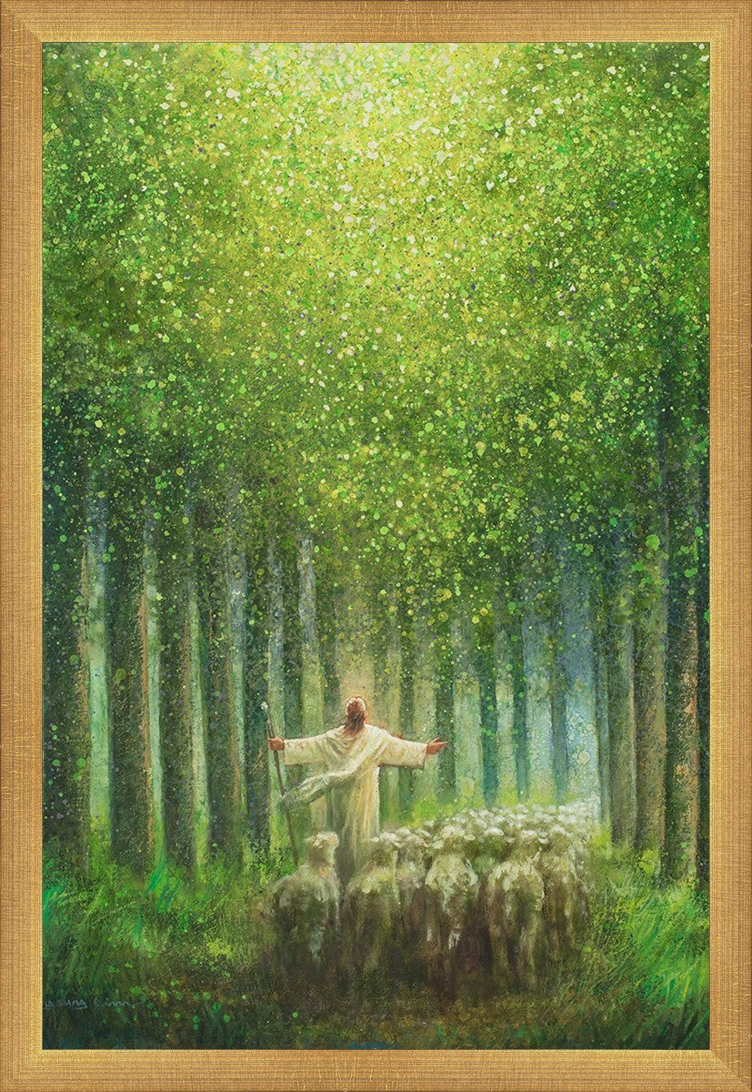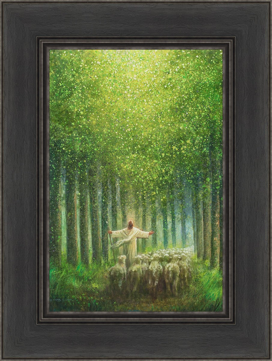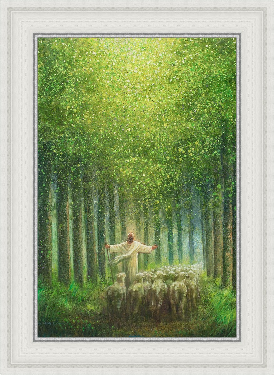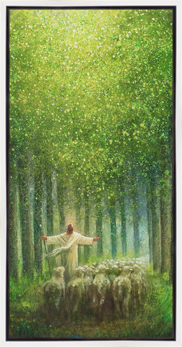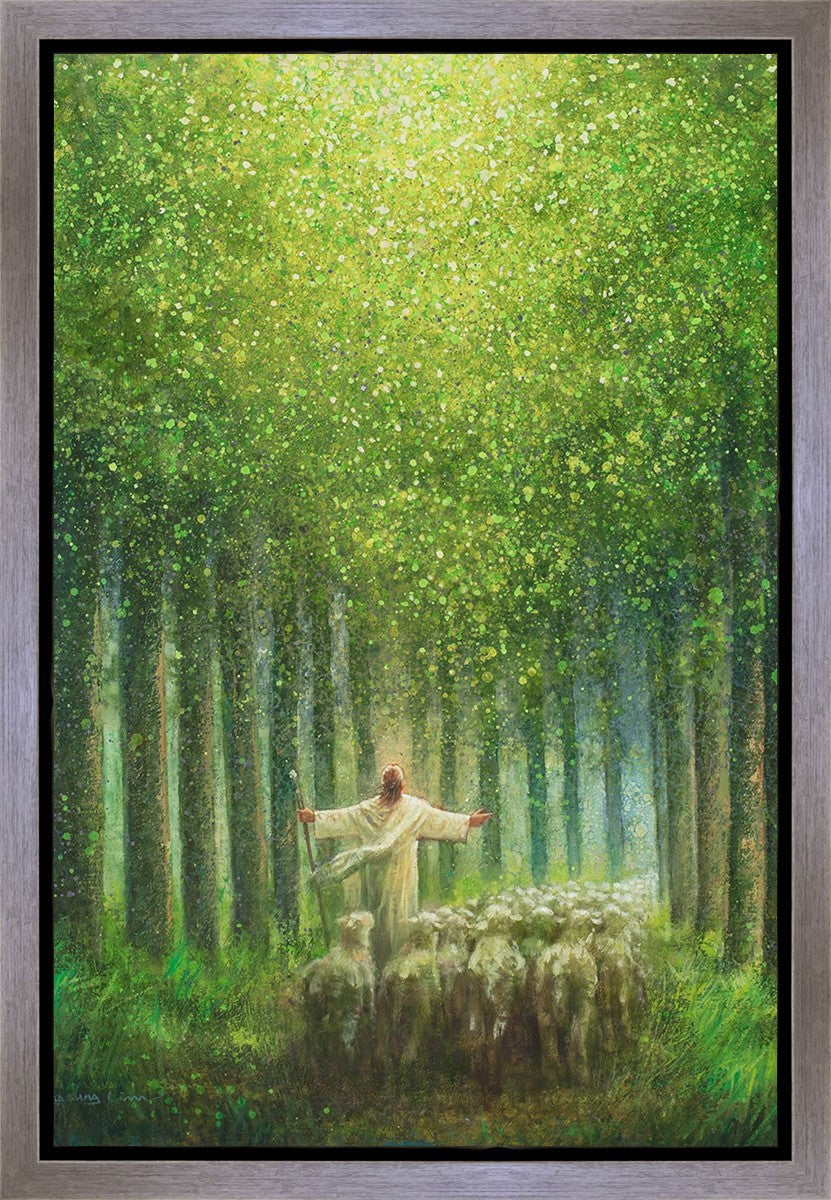 In the depths of a dark and mysterious forest the Good Shepherd guides a flock of sheep with gentle authority. The radiant light of God illuminates the way. The heavenly glow of God's light serves as a constant reminder that even in the most foreboding circumstances, Jesus will guide his beloved flock to the eternal pastures of peace and fulfillment.