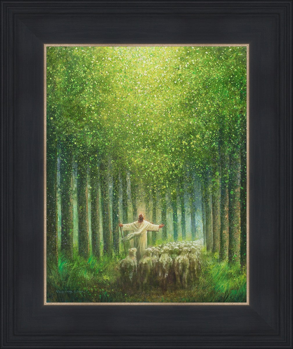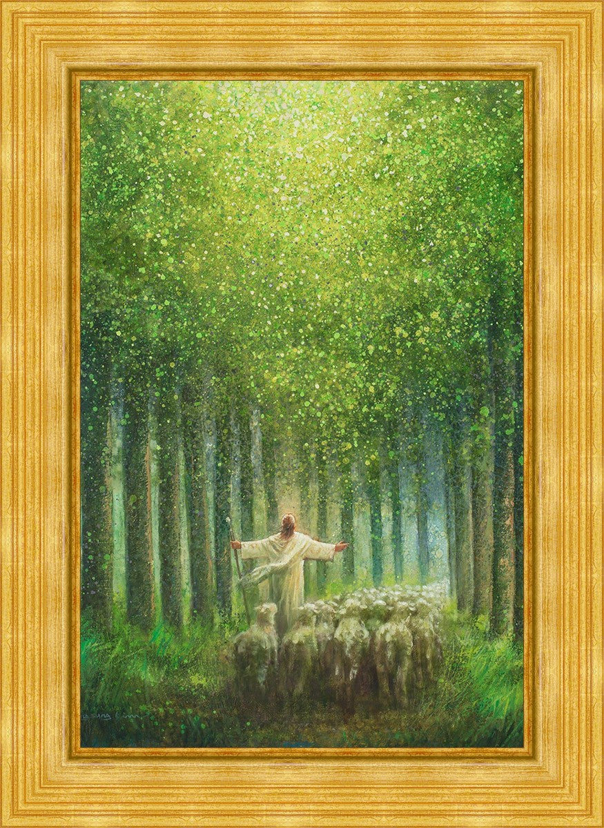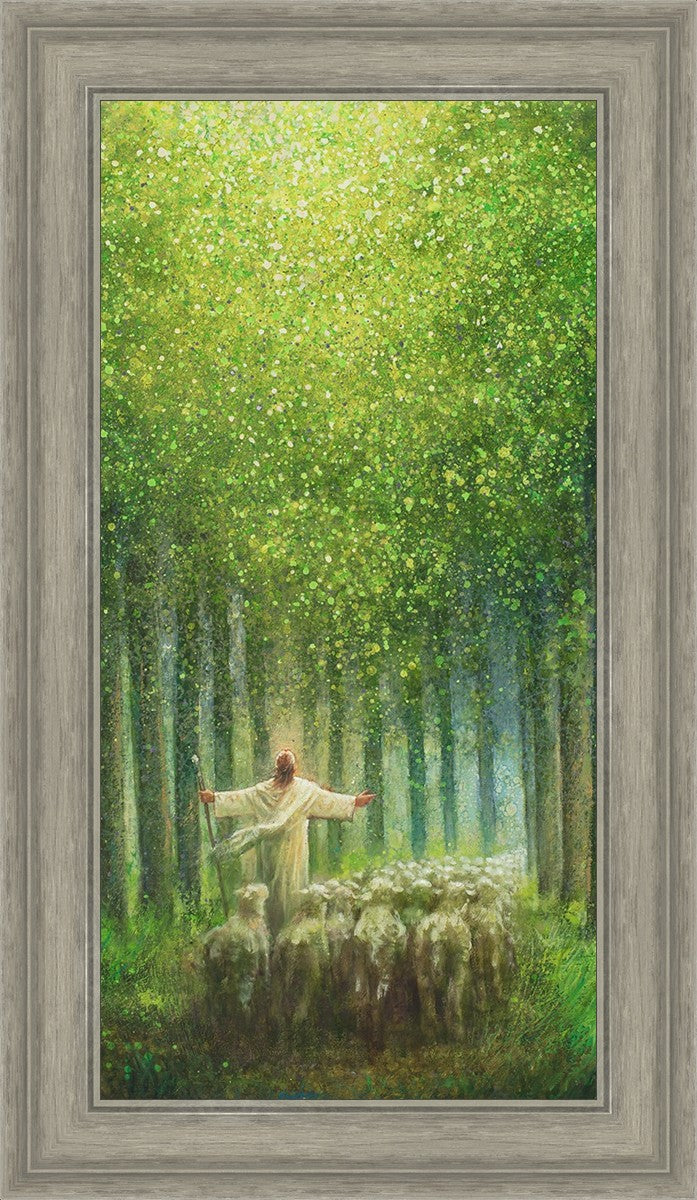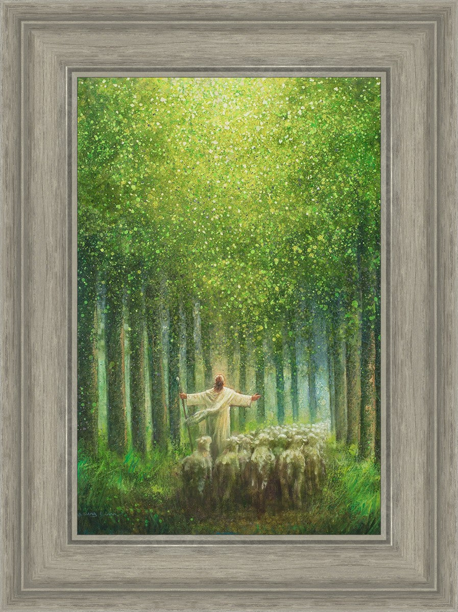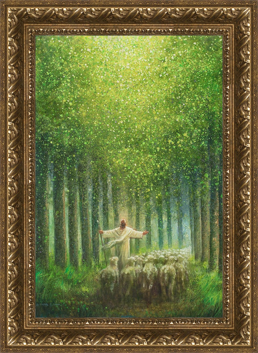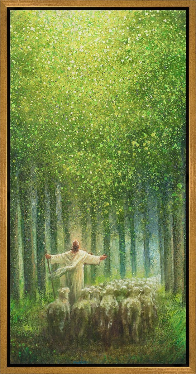 In the depths of a dark and mysterious forest the Good Shepherd guides a flock of sheep with gentle authority. The radiant light of God illuminates the way. The heavenly glow of God's light serves as a constant reminder that even in the most foreboding circumstances, Jesus will guide his beloved flock to the eternal pastures of peace and fulfillment.