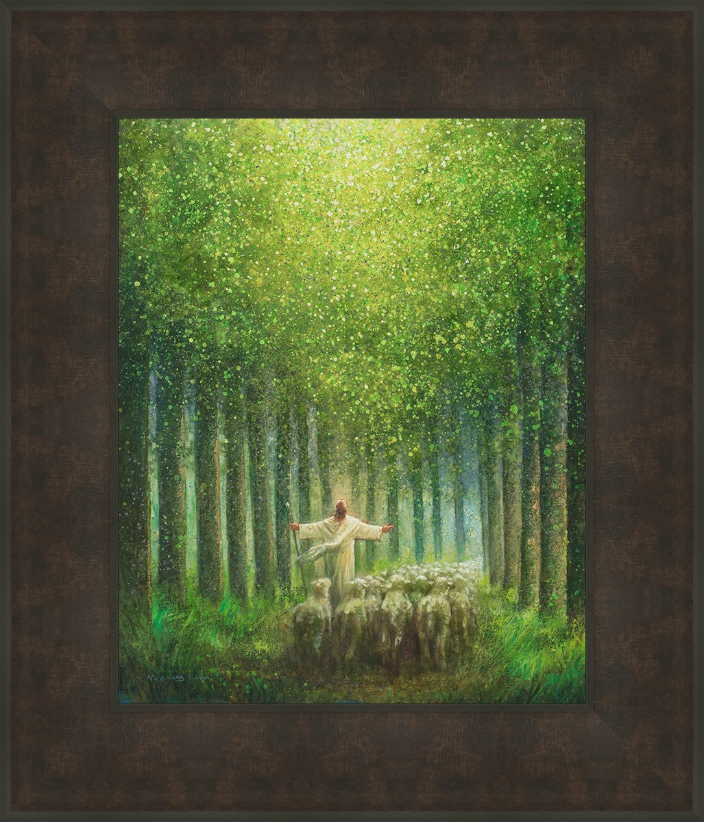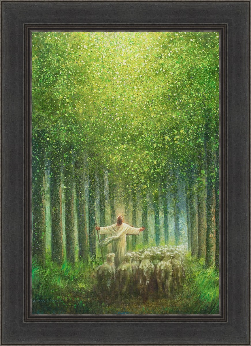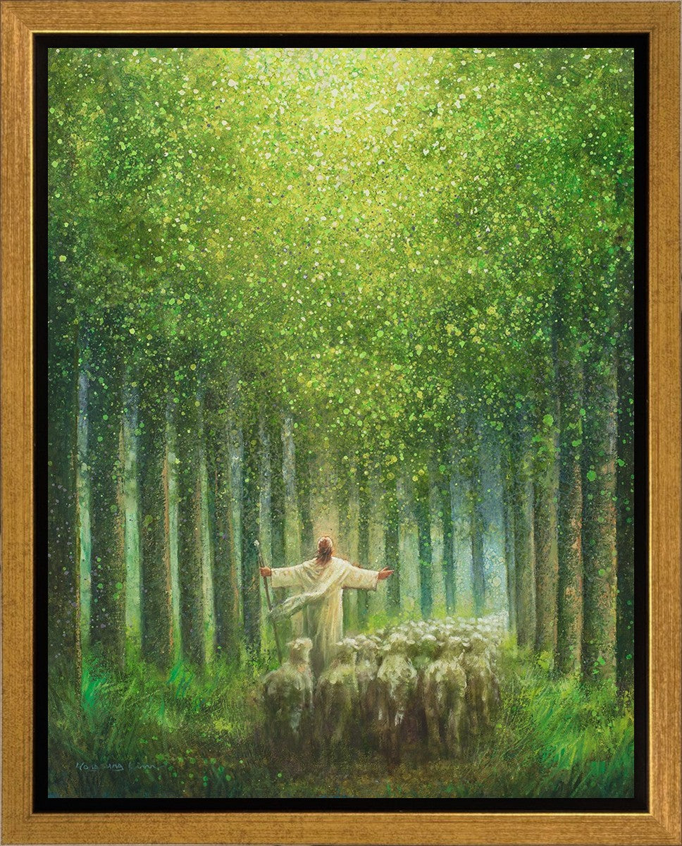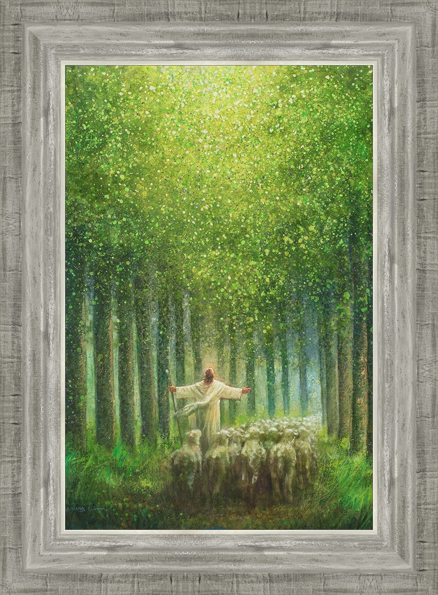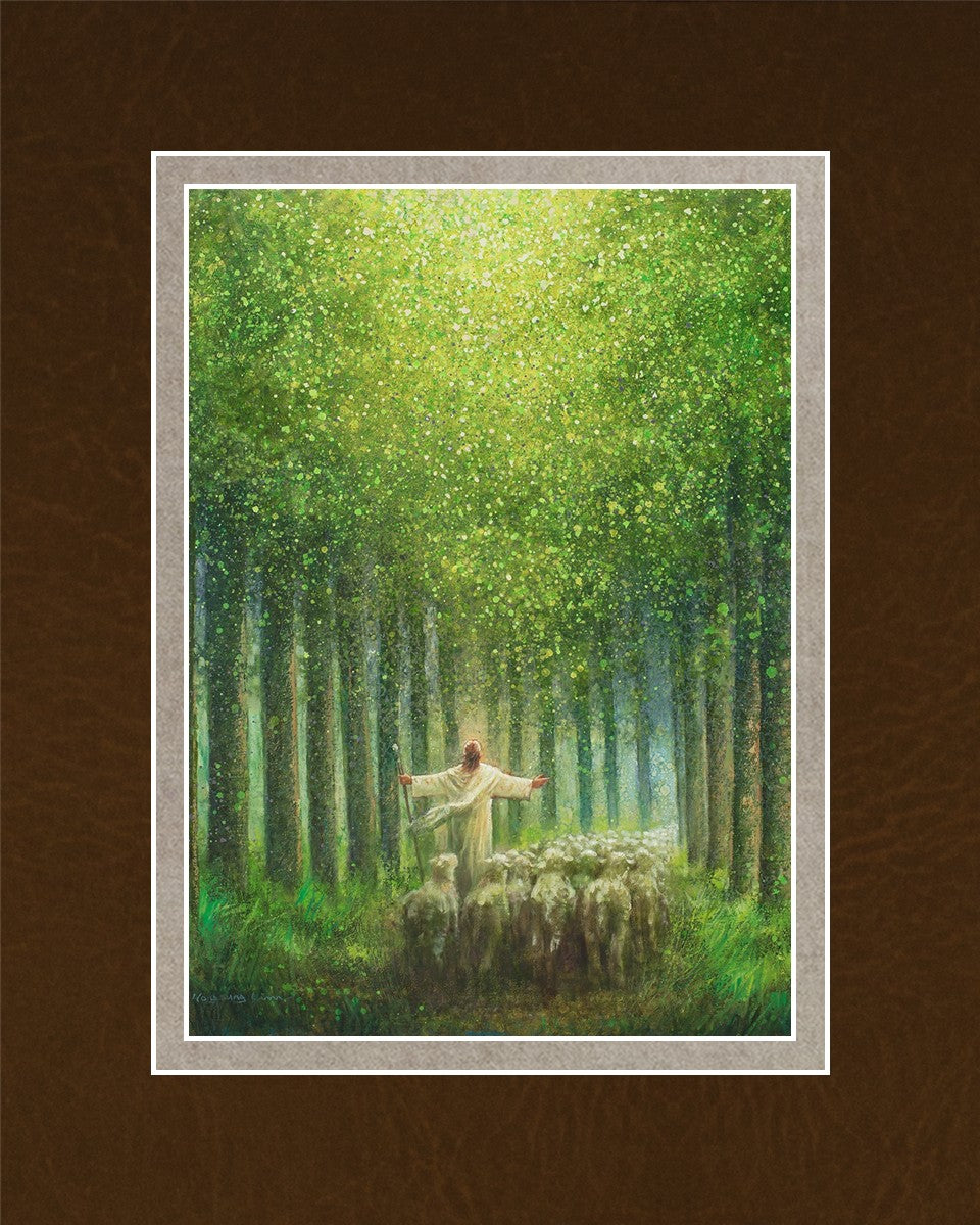 In the depths of a dark and mysterious forest the Good Shepherd guides a flock of sheep with gentle authority. The radiant light of God illuminates the way. The heavenly glow of God's light serves as a constant reminder that even in the most foreboding circumstances, Jesus will guide his beloved flock to the eternal pastures of peace and fulfillment.