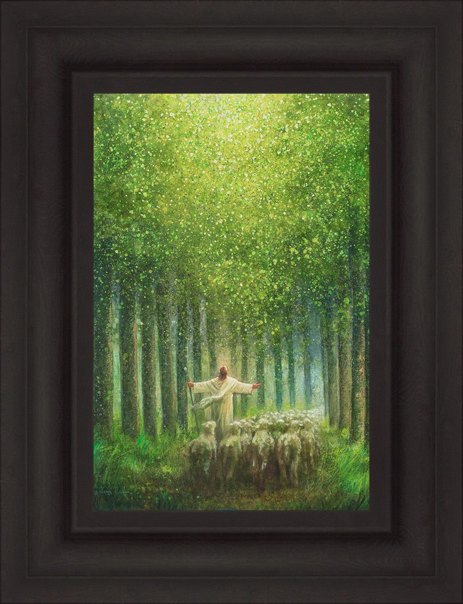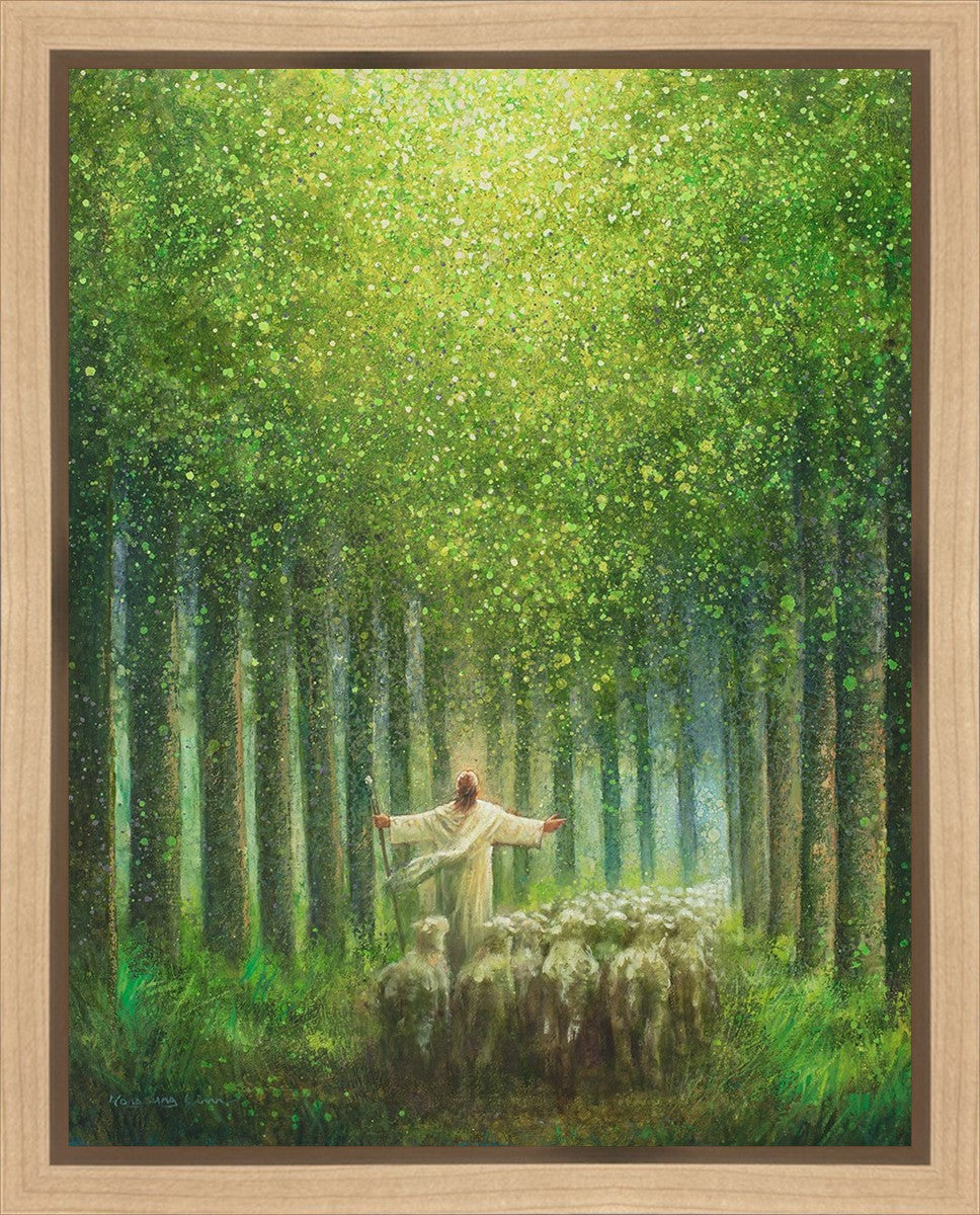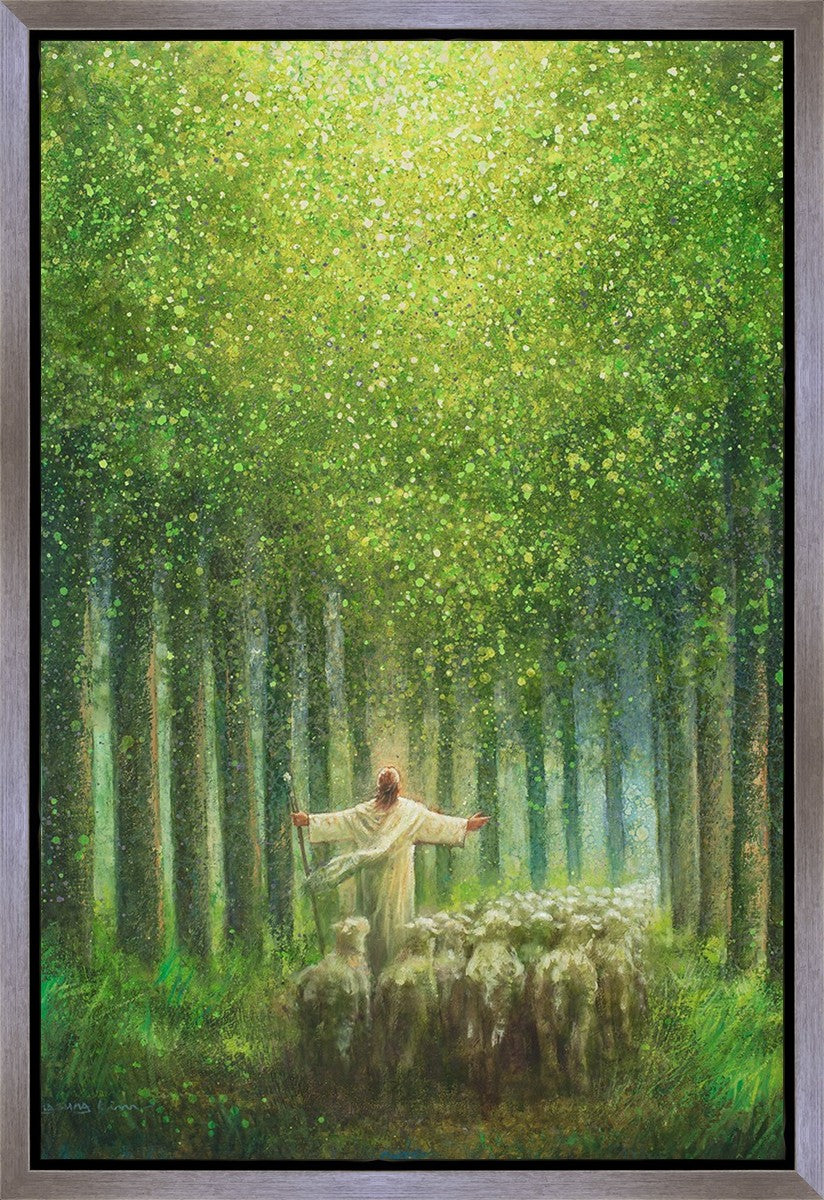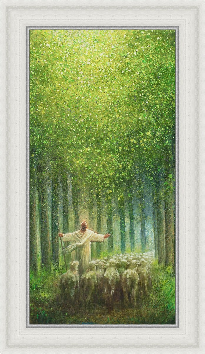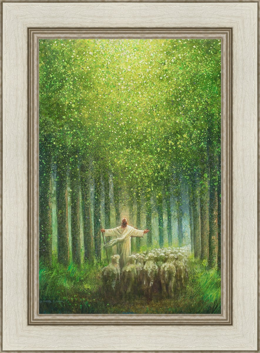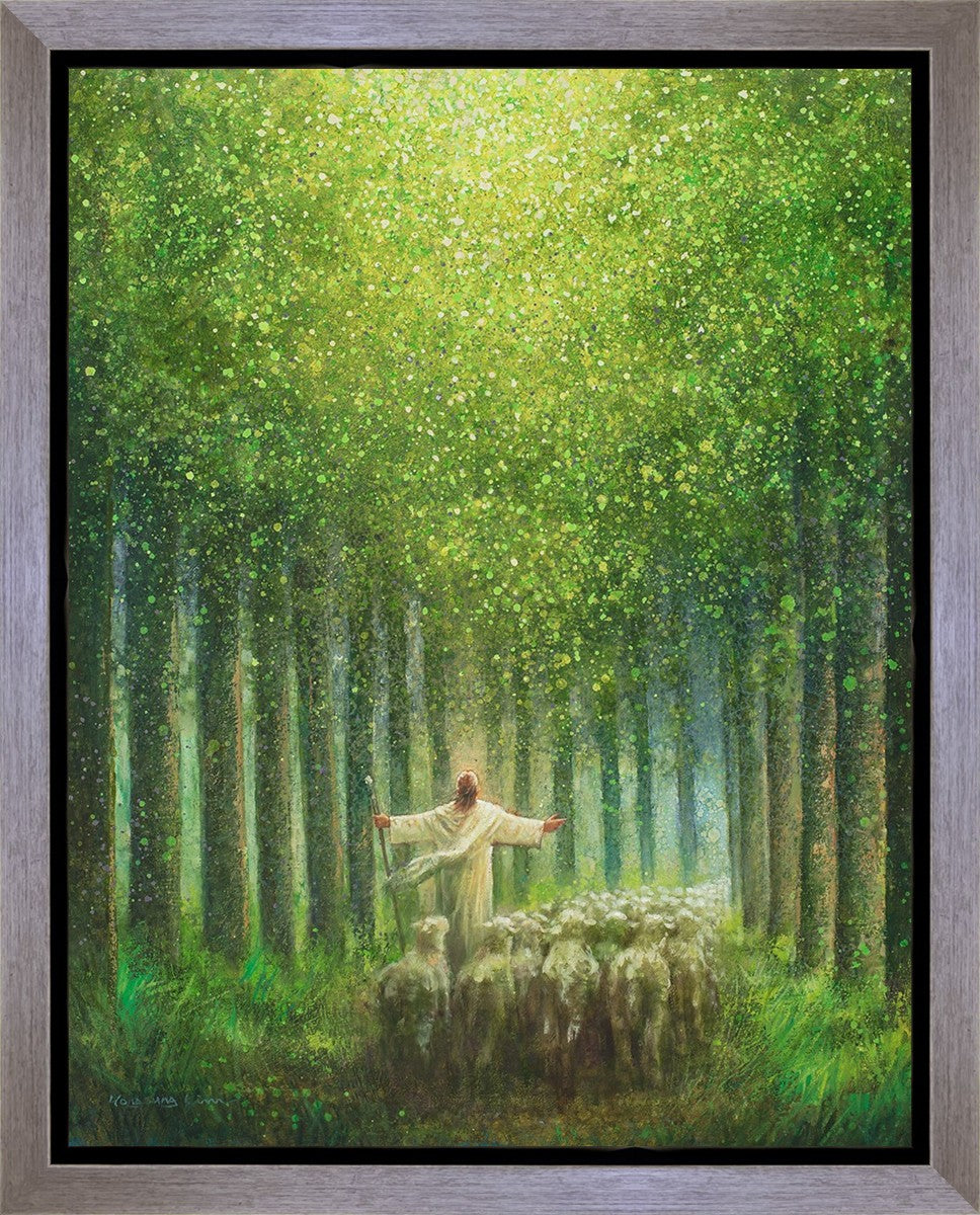 In the depths of a dark and mysterious forest the Good Shepherd guides a flock of sheep with gentle authority. The radiant light of God illuminates the way. The heavenly glow of God's light serves as a constant reminder that even in the most foreboding circumstances, Jesus will guide his beloved flock to the eternal pastures of peace and fulfillment.