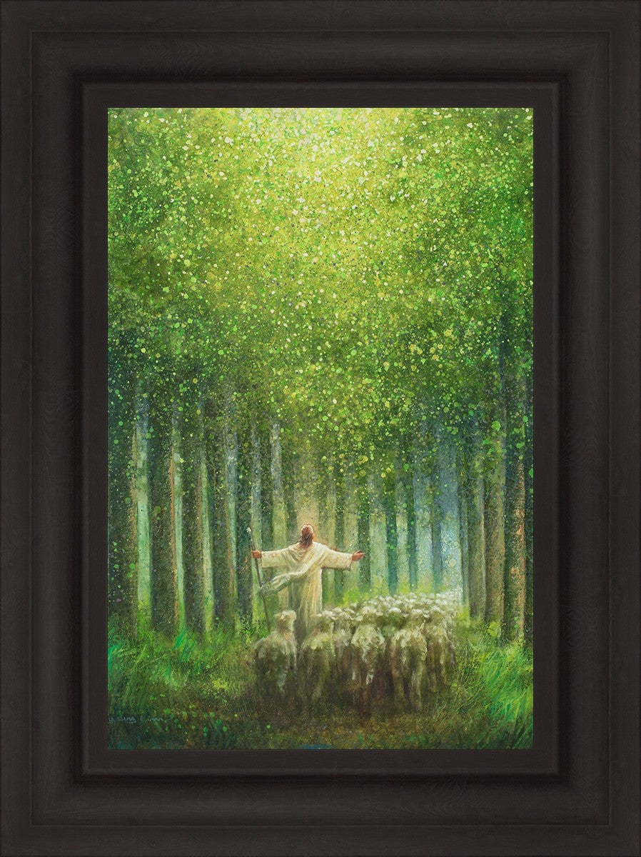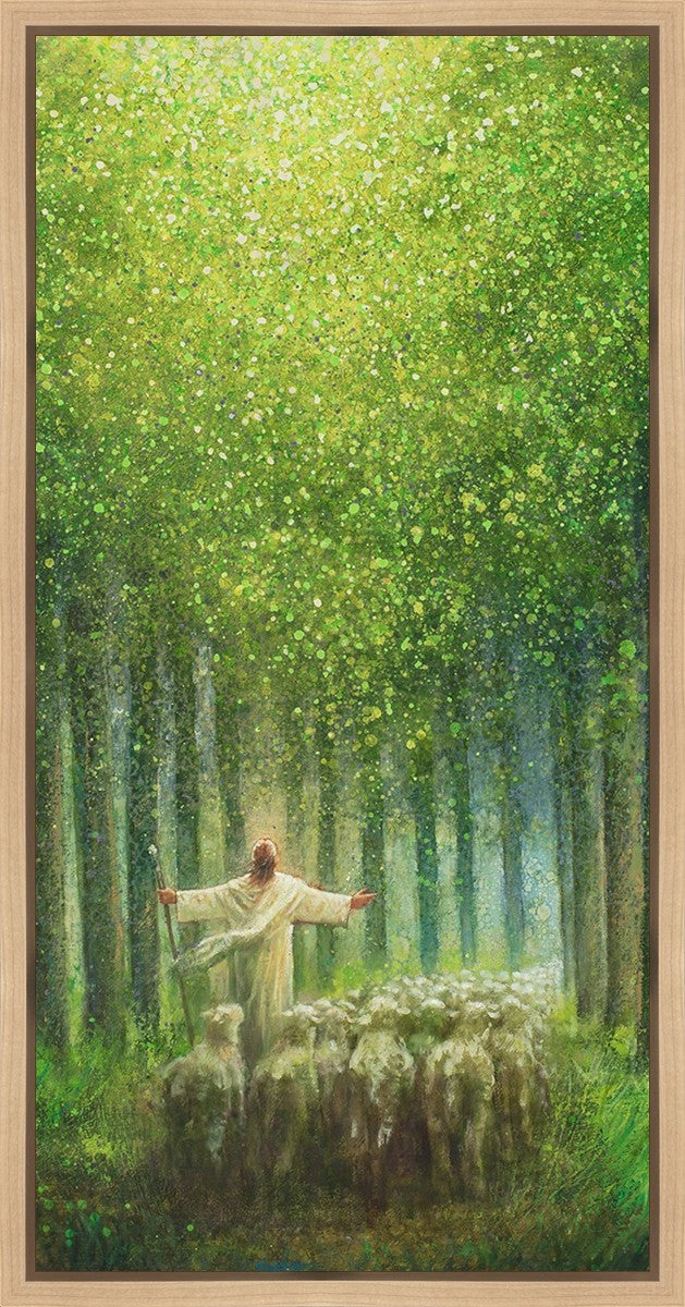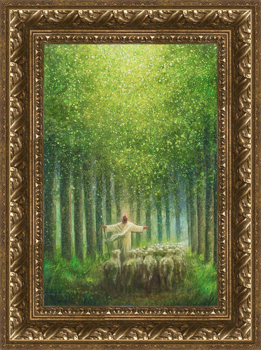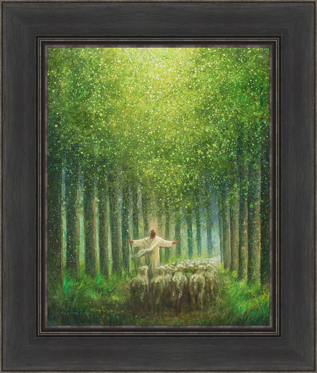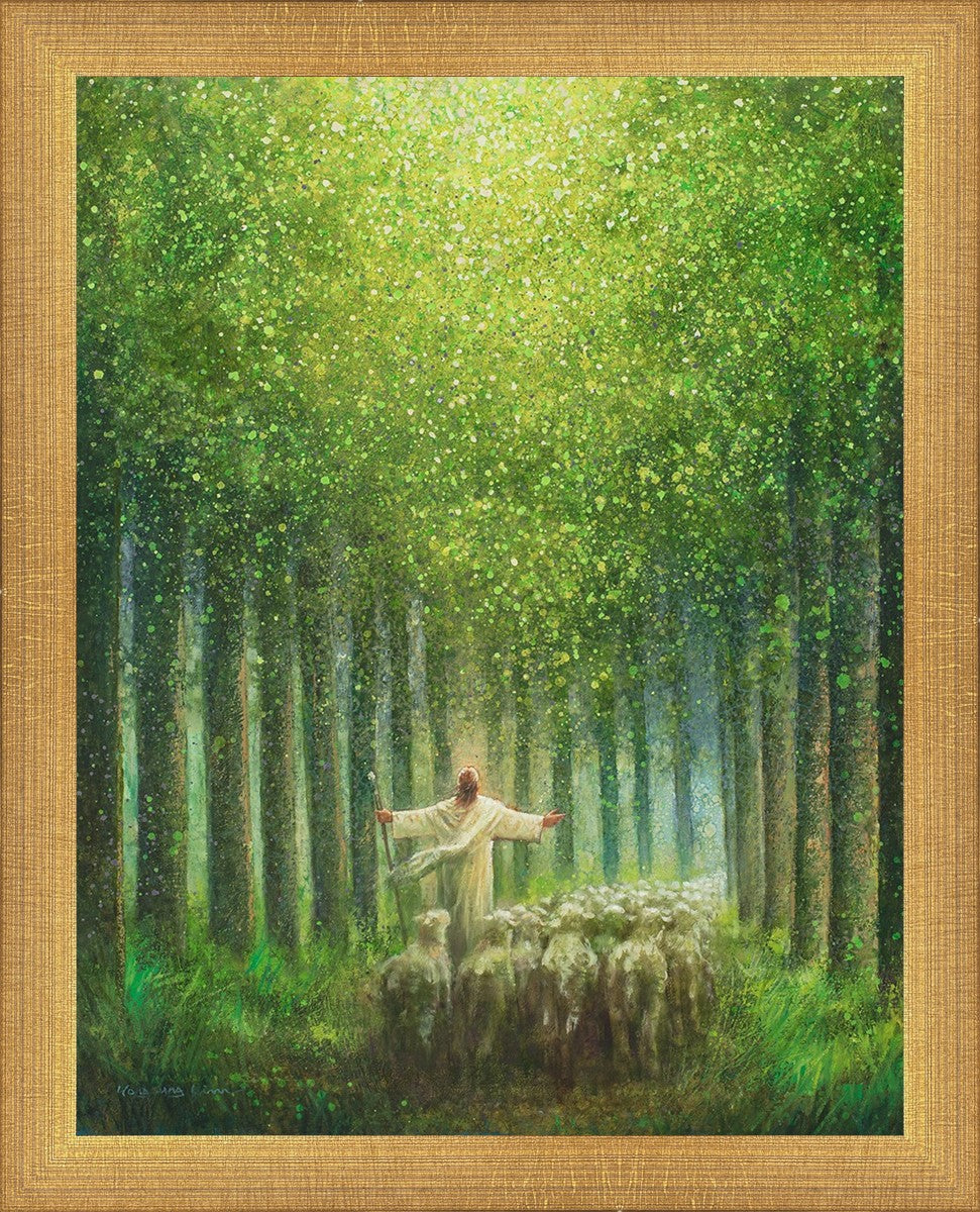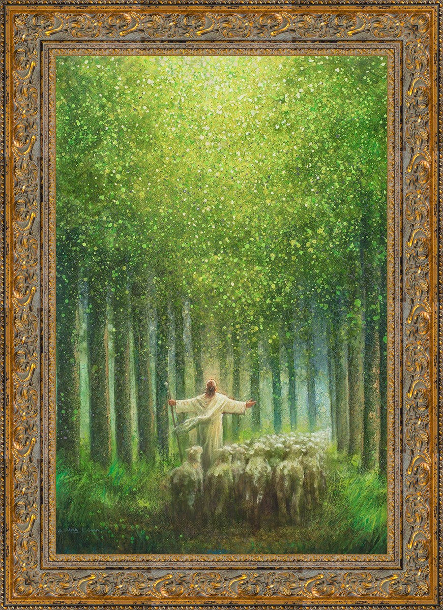 In the depths of a dark and mysterious forest the Good Shepherd guides a flock of sheep with gentle authority. The radiant light of God illuminates the way. The heavenly glow of God's light serves as a constant reminder that even in the most foreboding circumstances, Jesus will guide his beloved flock to the eternal pastures of peace and fulfillment.