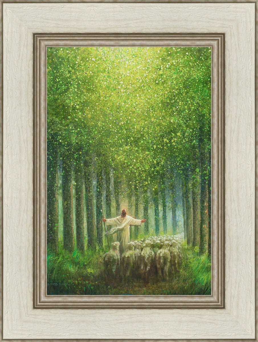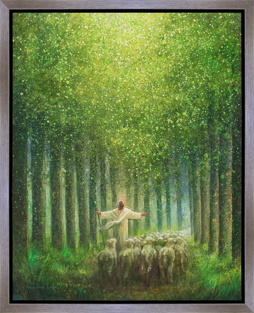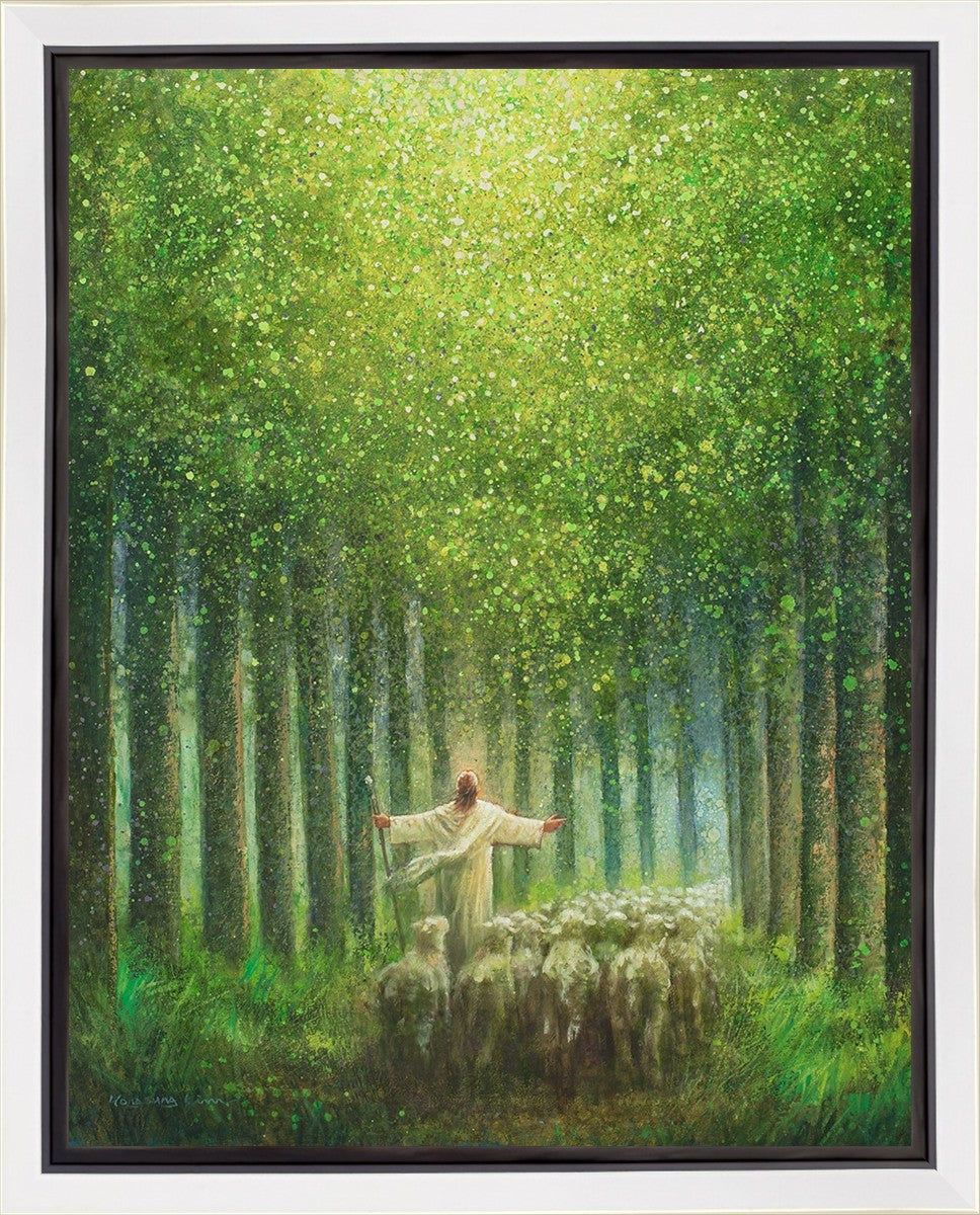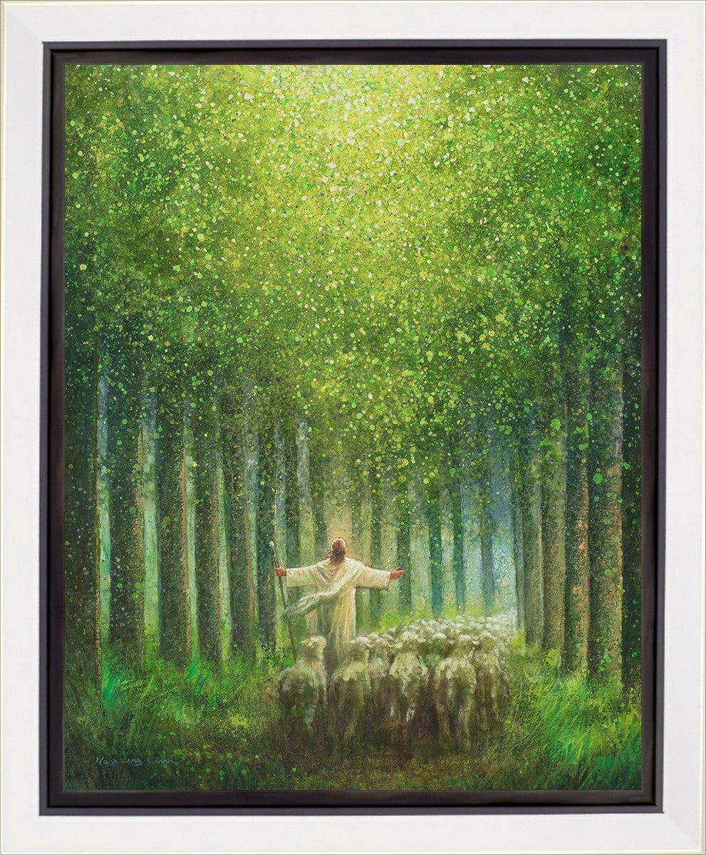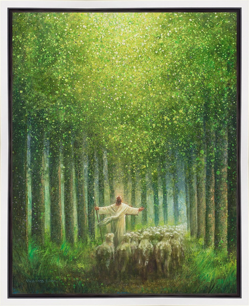 In the depths of a dark and mysterious forest the Good Shepherd guides a flock of sheep with gentle authority. The radiant light of God illuminates the way. The heavenly glow of God's light serves as a constant reminder that even in the most foreboding circumstances, Jesus will guide his beloved flock to the eternal pastures of peace and fulfillment.