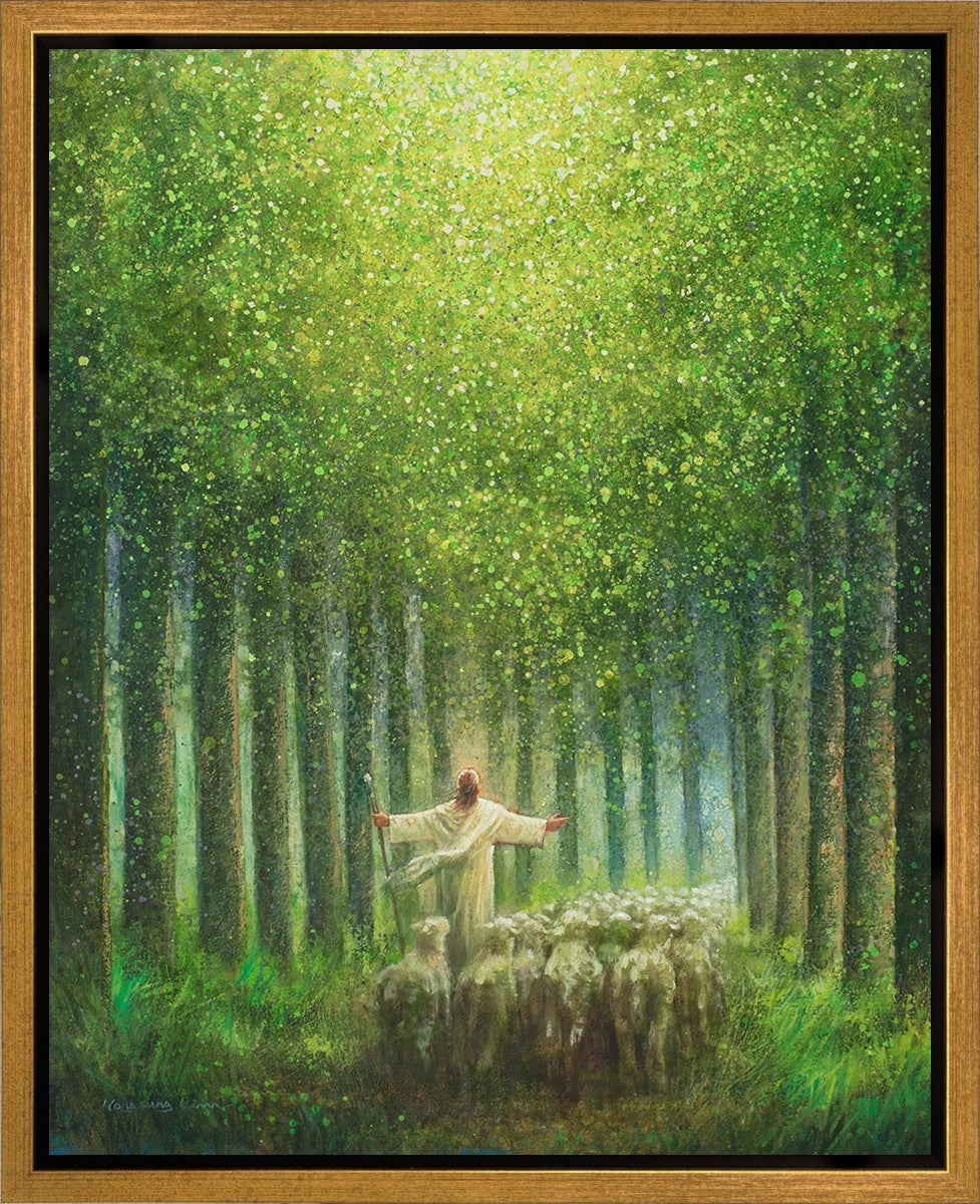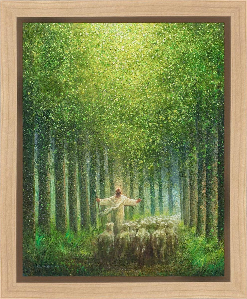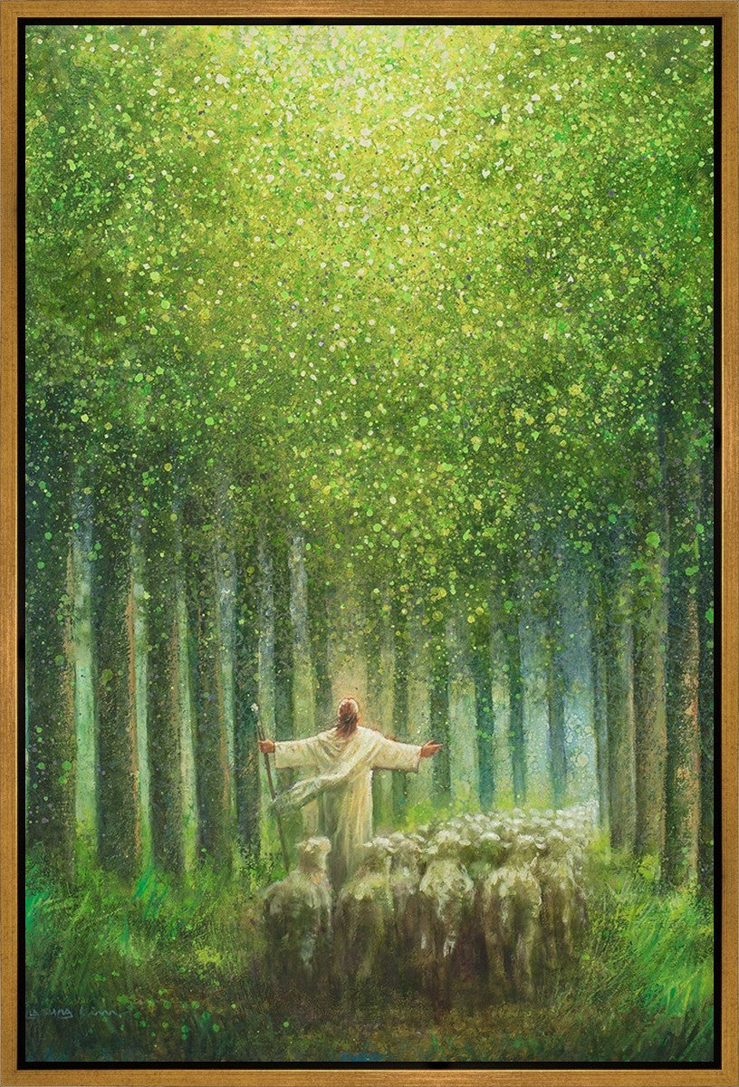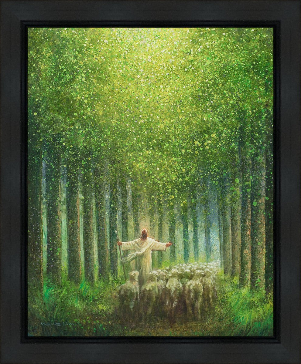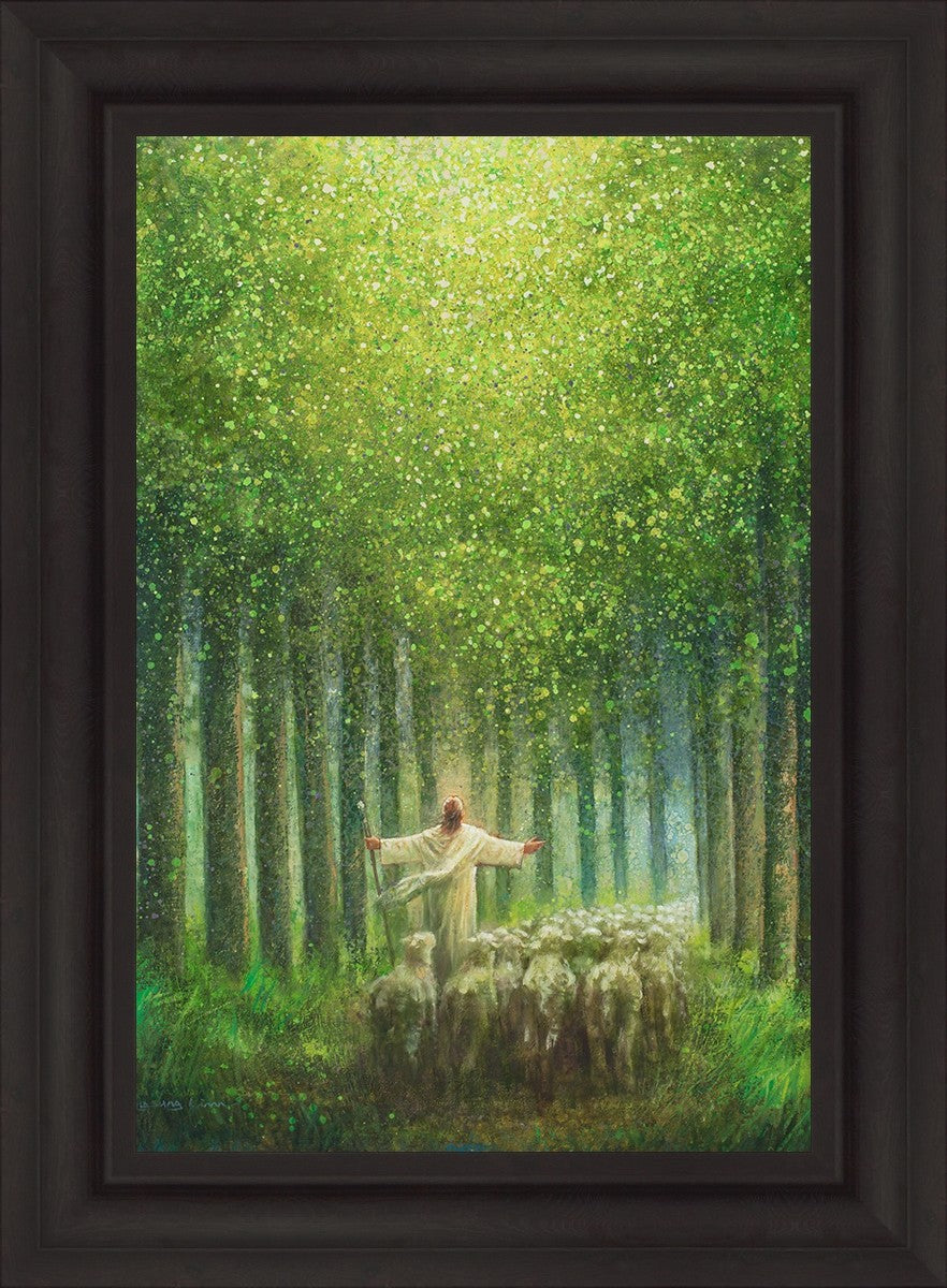 In the depths of a dark and mysterious forest the Good Shepherd guides a flock of sheep with gentle authority. The radiant light of God illuminates the way. The heavenly glow of God's light serves as a constant reminder that even in the most foreboding circumstances, Jesus will guide his beloved flock to the eternal pastures of peace and fulfillment.