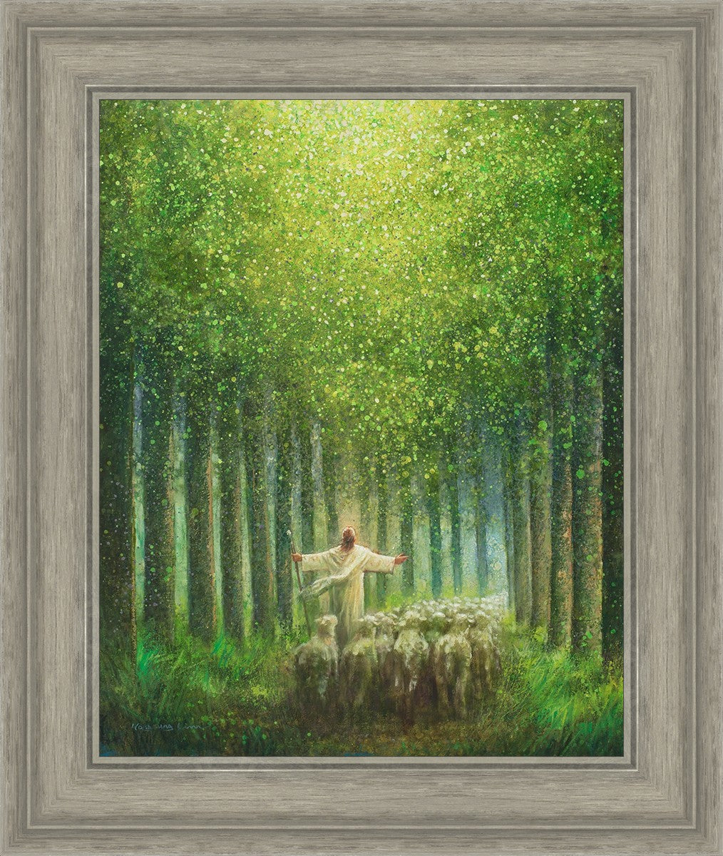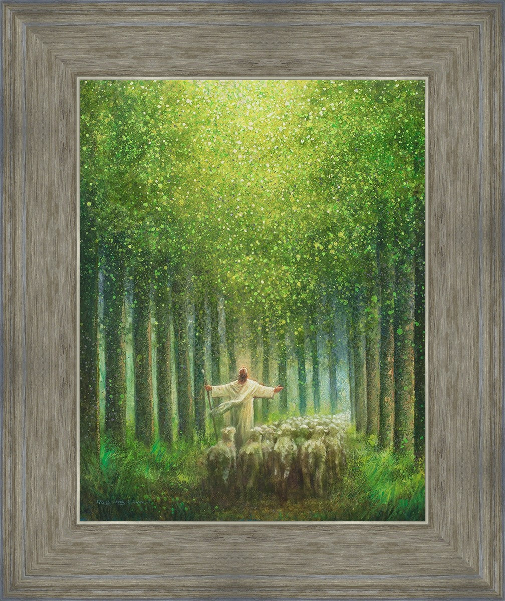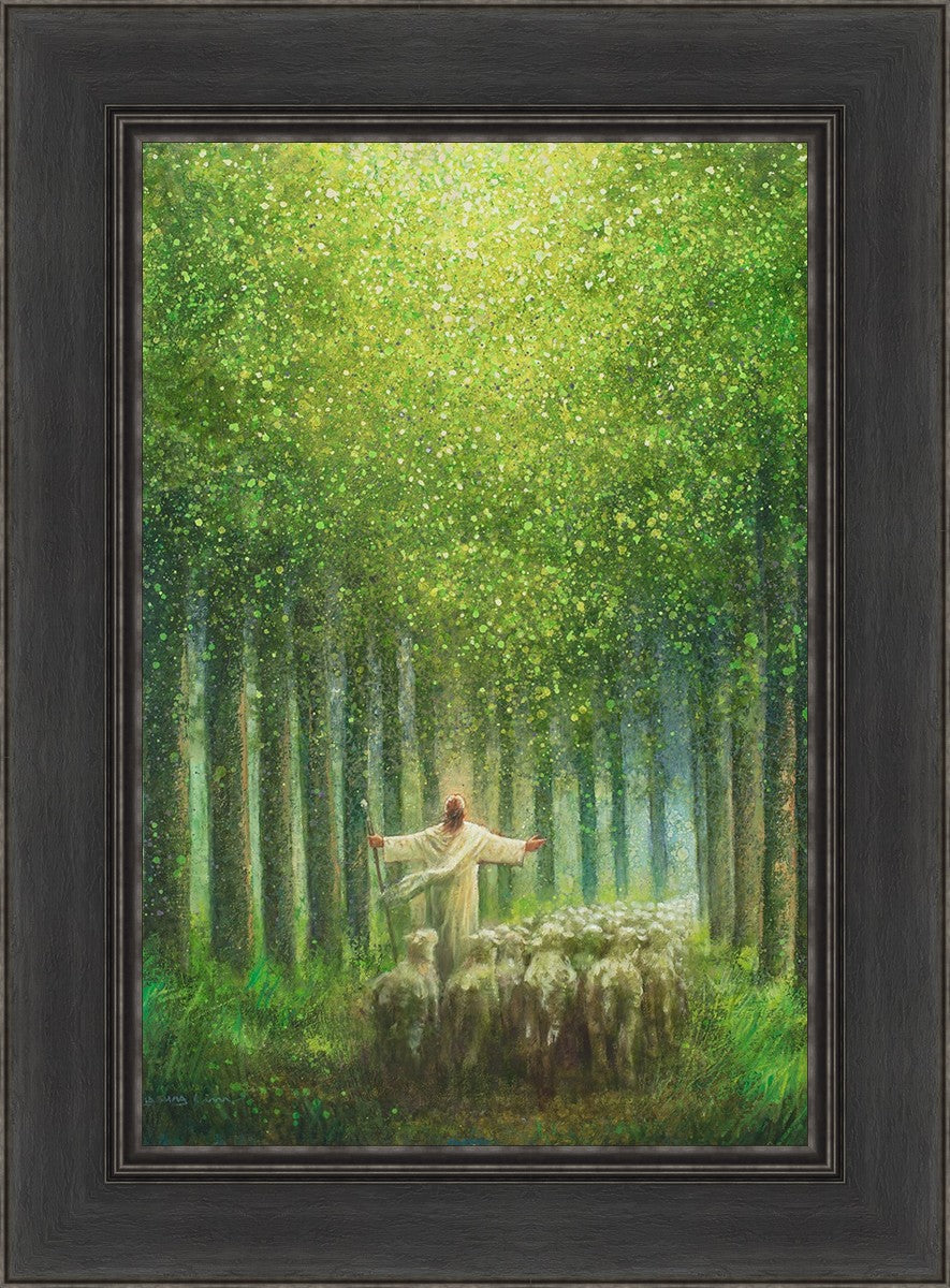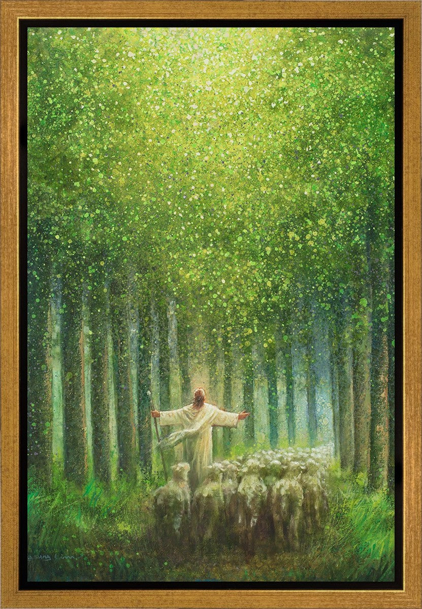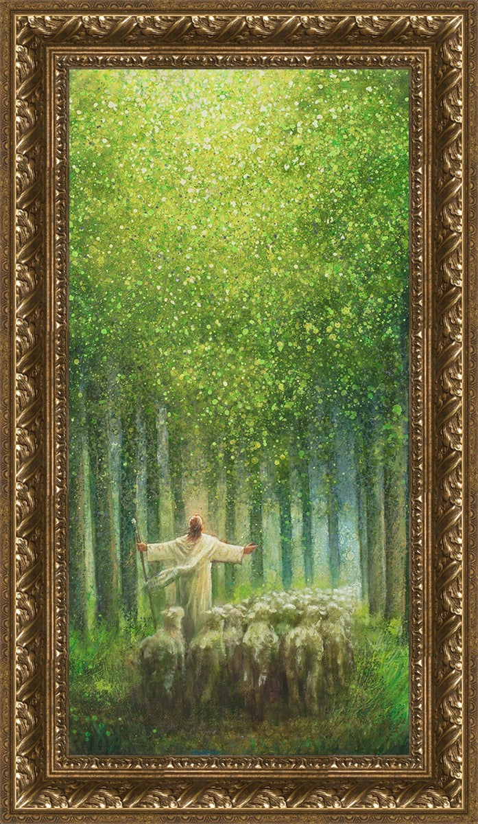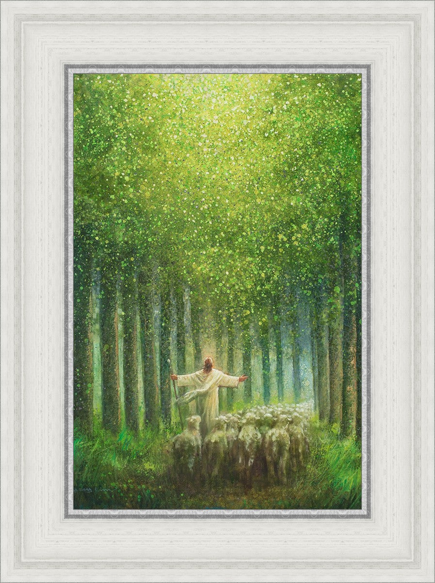 In the depths of a dark and mysterious forest the Good Shepherd guides a flock of sheep with gentle authority. The radiant light of God illuminates the way. The heavenly glow of God's light serves as a constant reminder that even in the most foreboding circumstances, Jesus will guide his beloved flock to the eternal pastures of peace and fulfillment.