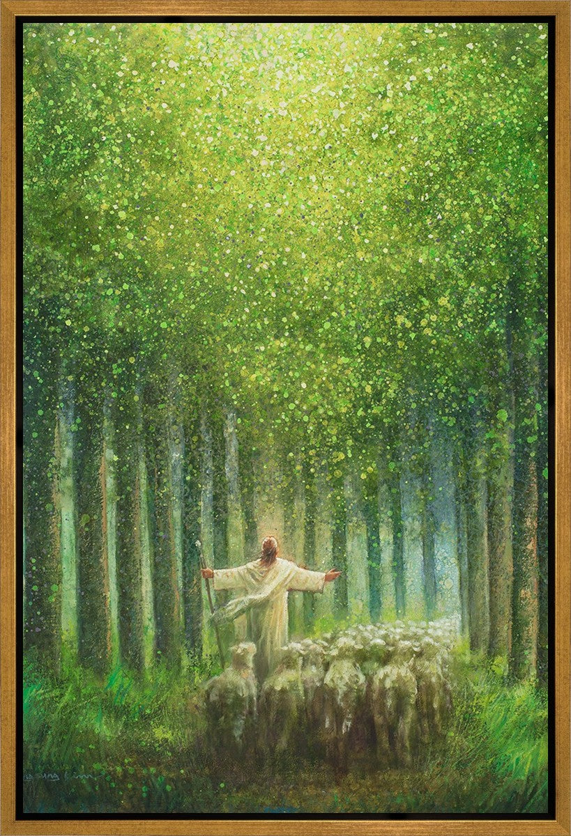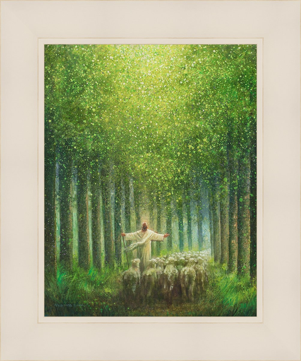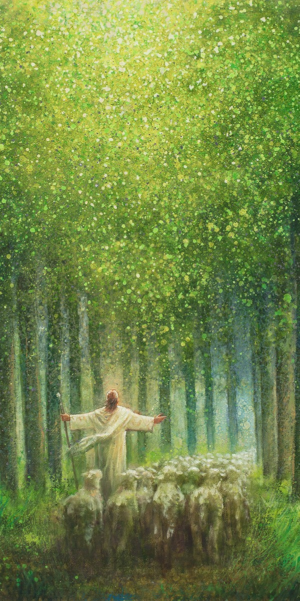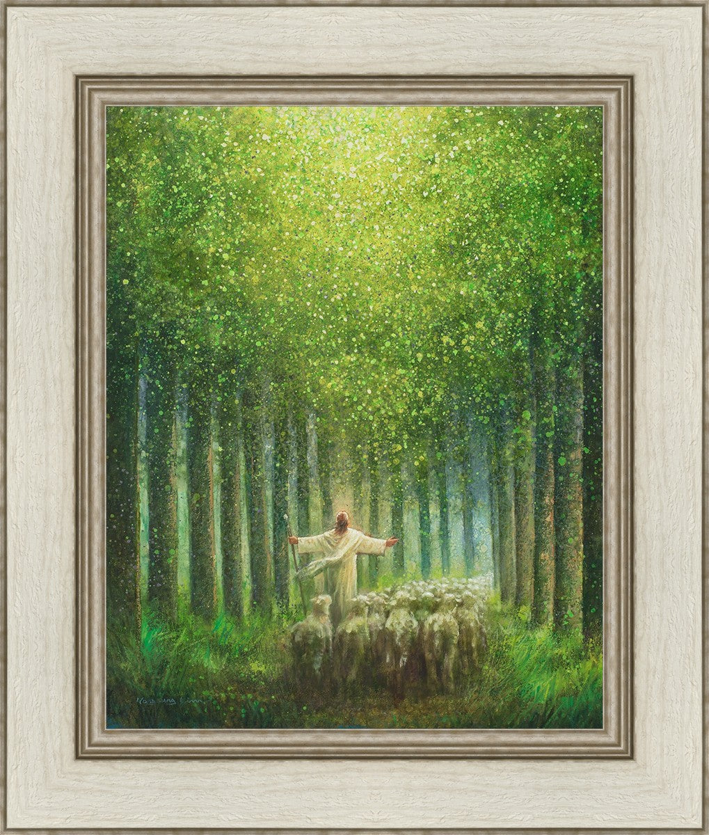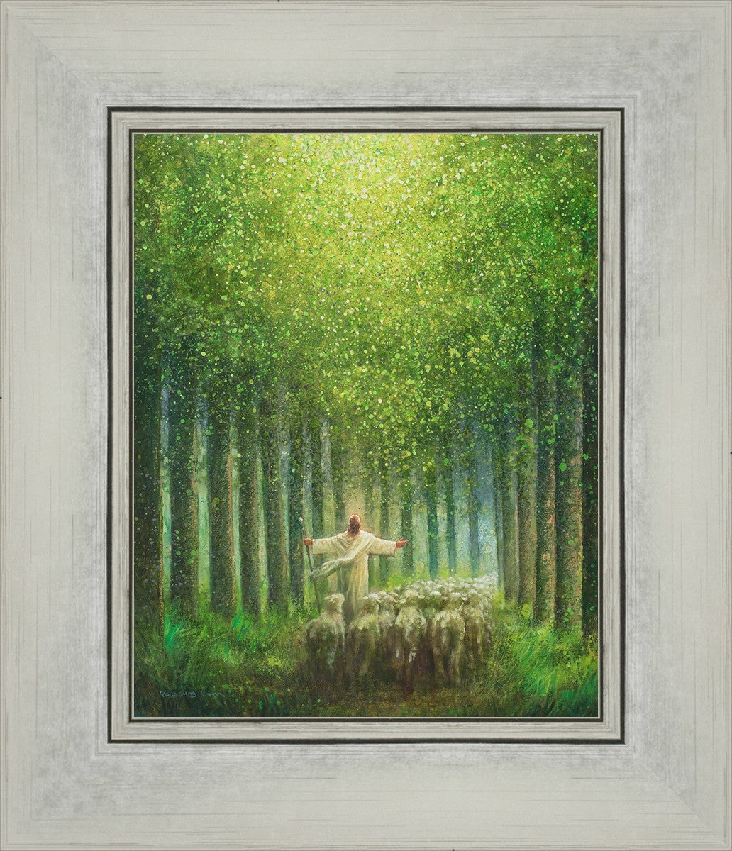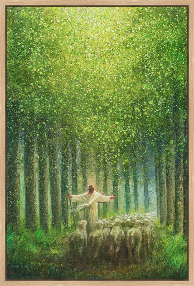 In the depths of a dark and mysterious forest the Good Shepherd guides a flock of sheep with gentle authority. The radiant light of God illuminates the way. The heavenly glow of God's light serves as a constant reminder that even in the most foreboding circumstances, Jesus will guide his beloved flock to the eternal pastures of peace and fulfillment.