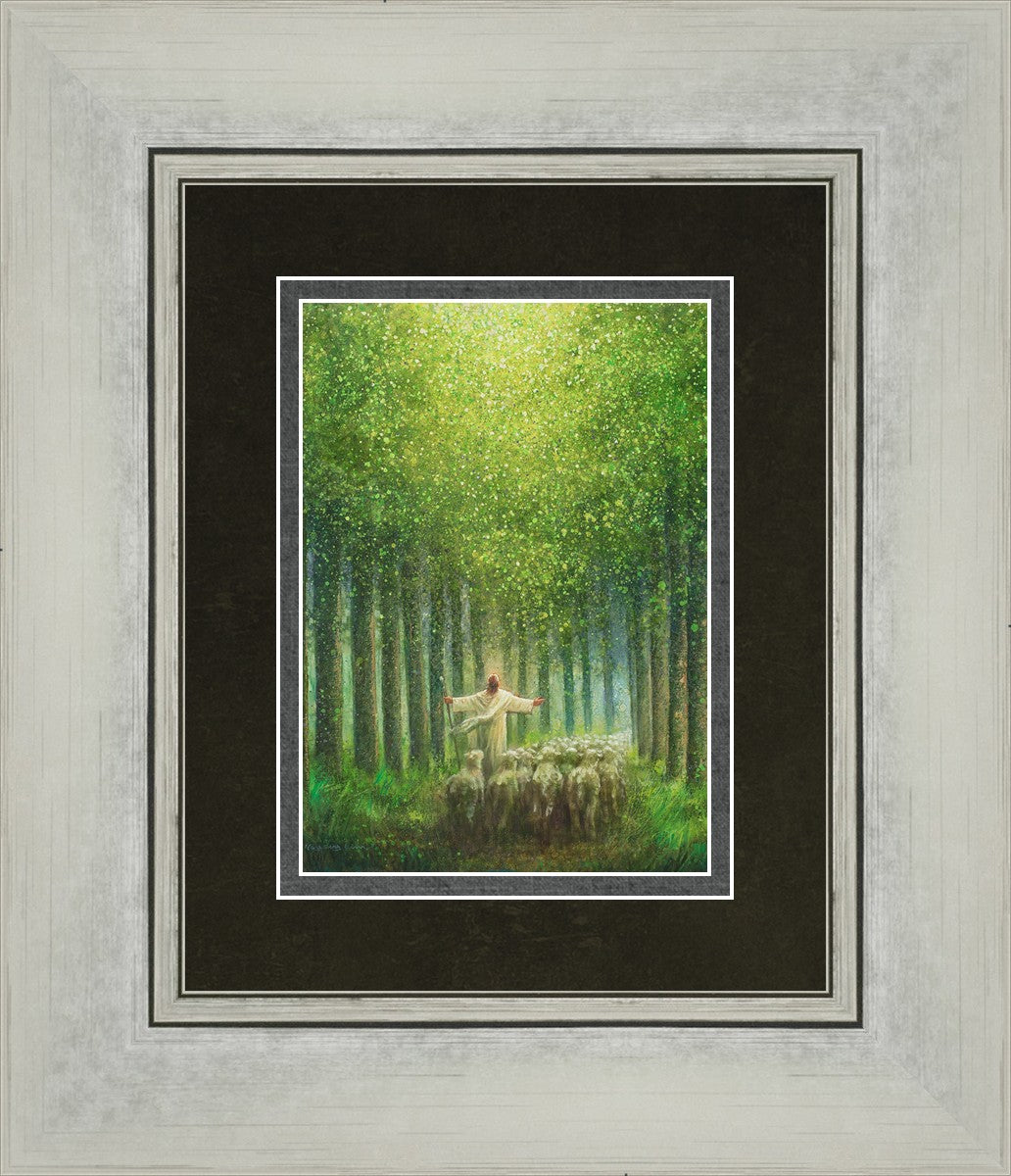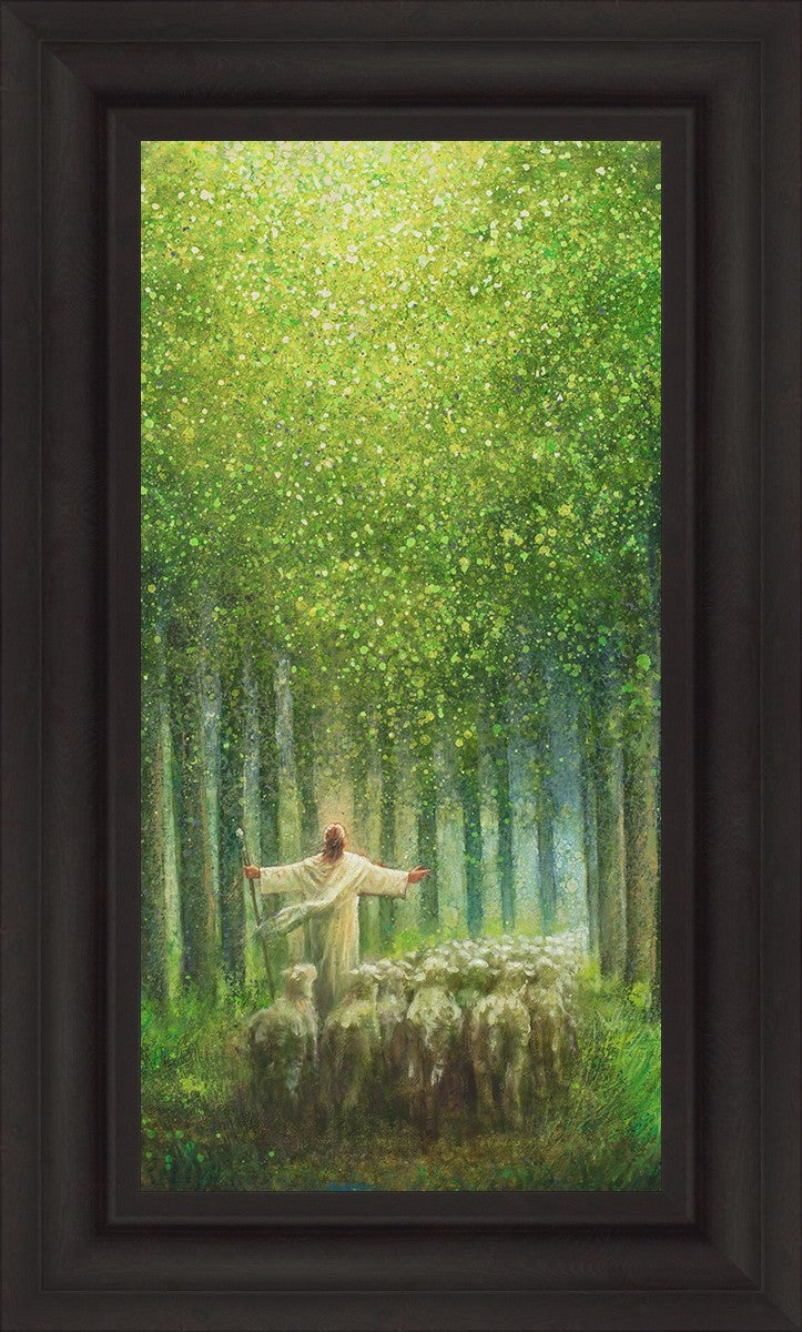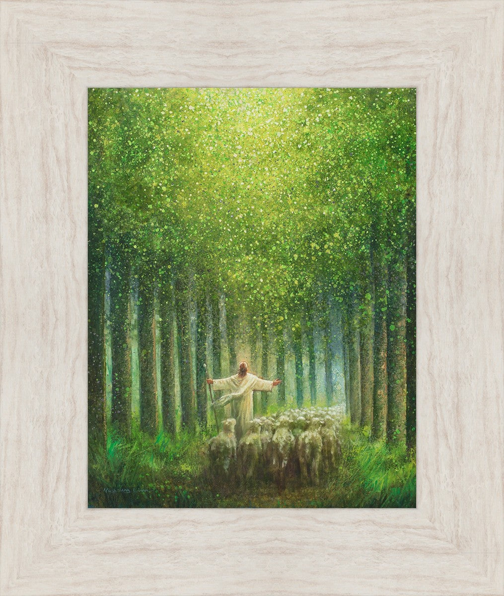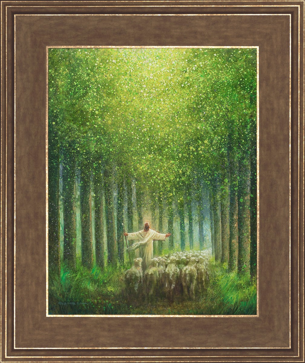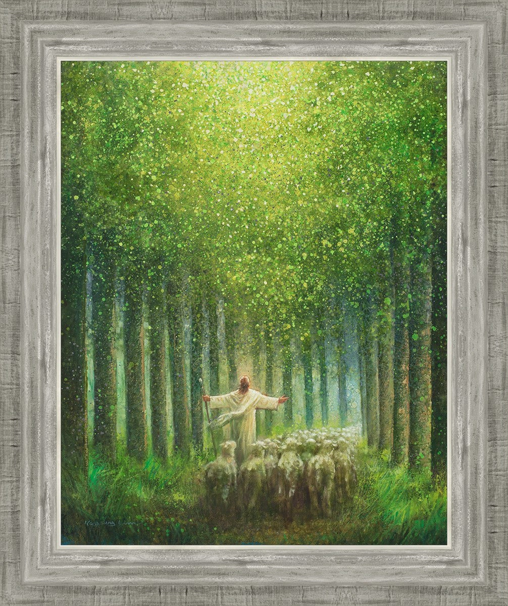 In the depths of a dark and mysterious forest the Good Shepherd guides a flock of sheep with gentle authority. The radiant light of God illuminates the way. The heavenly glow of God's light serves as a constant reminder that even in the most foreboding circumstances, Jesus will guide his beloved flock to the eternal pastures of peace and fulfillment.
