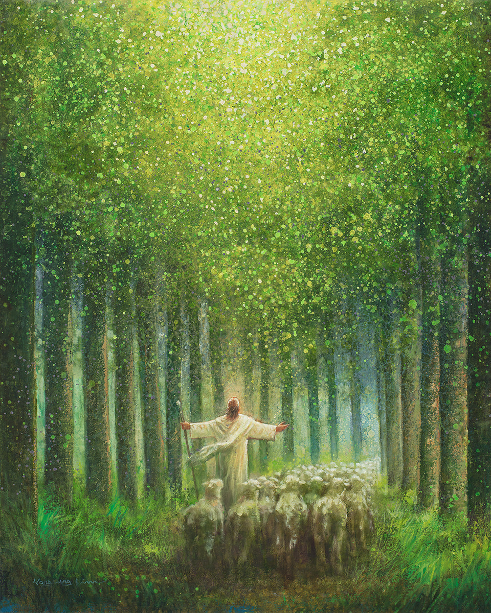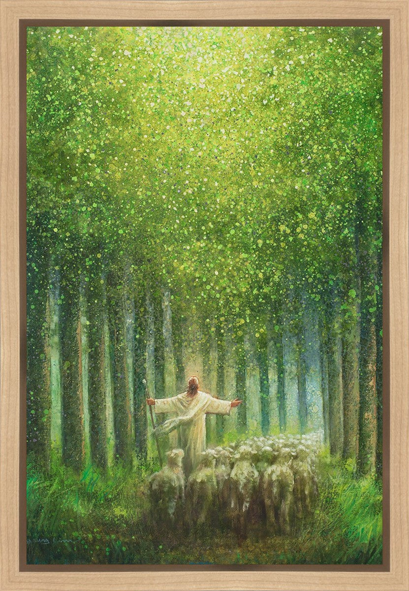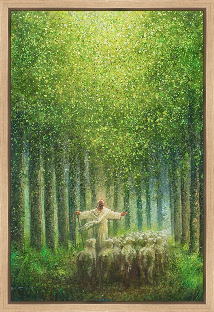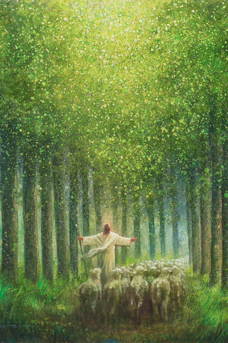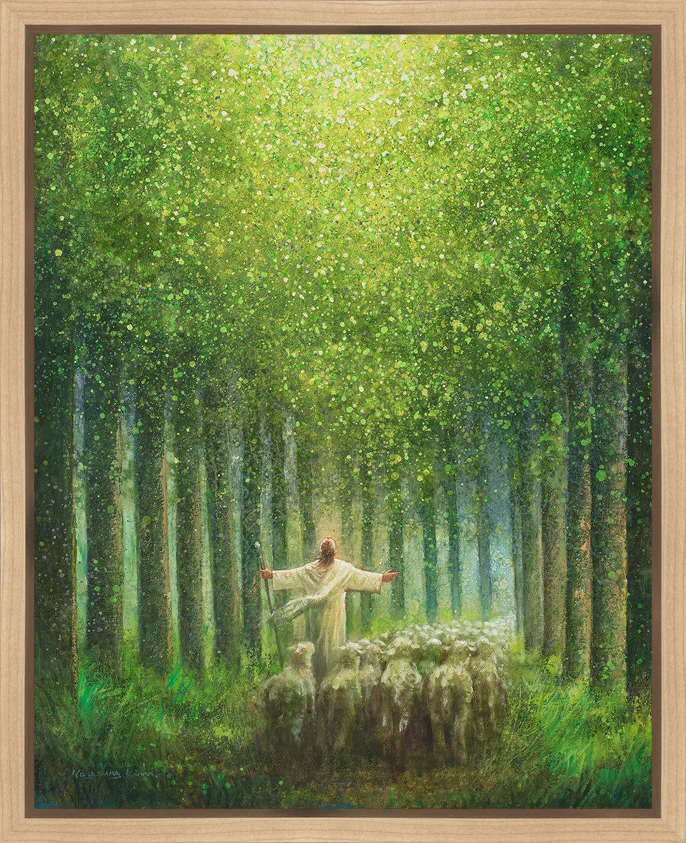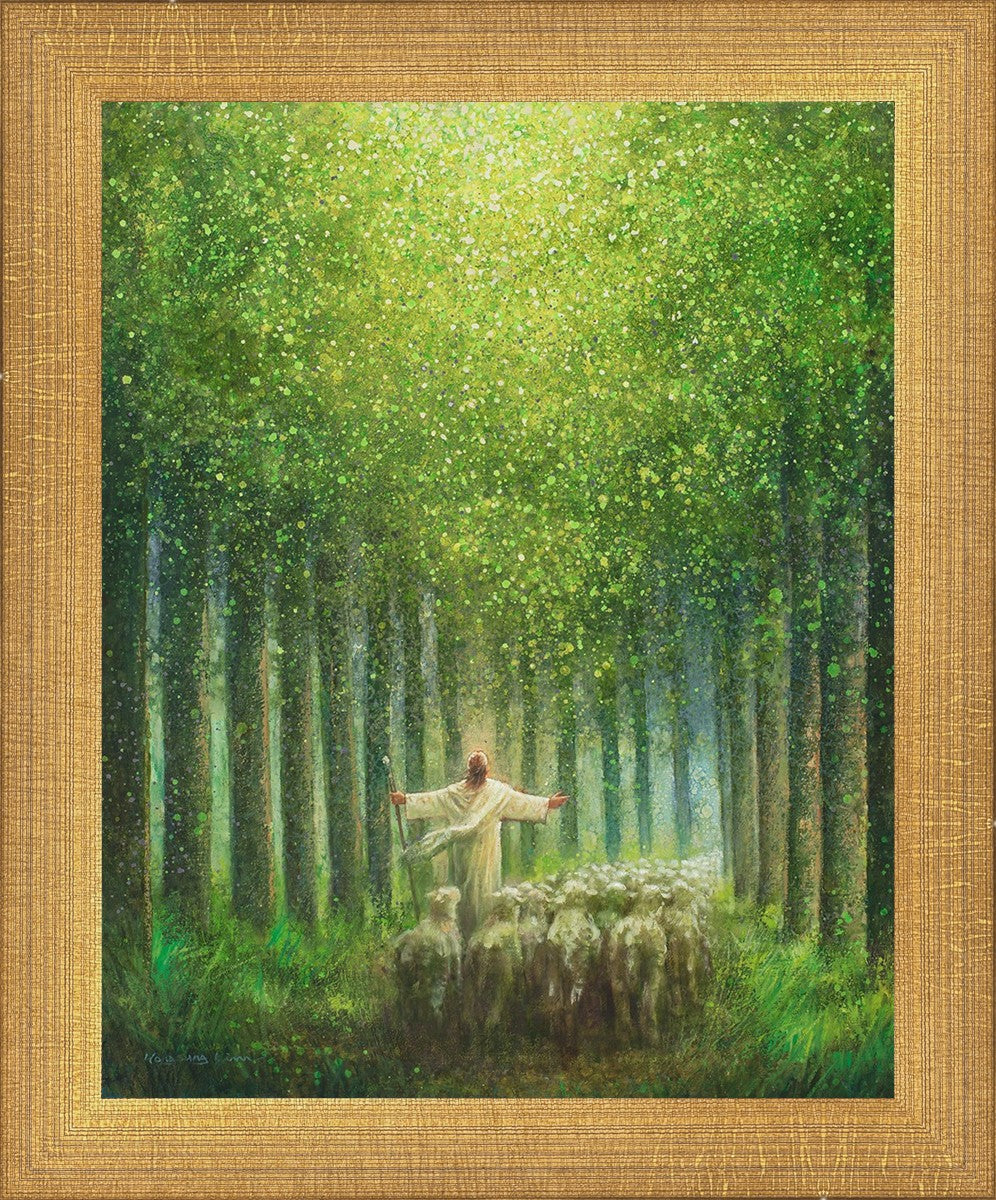 In the depths of a dark and mysterious forest the Good Shepherd guides a flock of sheep with gentle authority. The radiant light of God illuminates the way. The heavenly glow of God's light serves as a constant reminder that even in the most foreboding circumstances, Jesus will guide his beloved flock to the eternal pastures of peace and fulfillment.