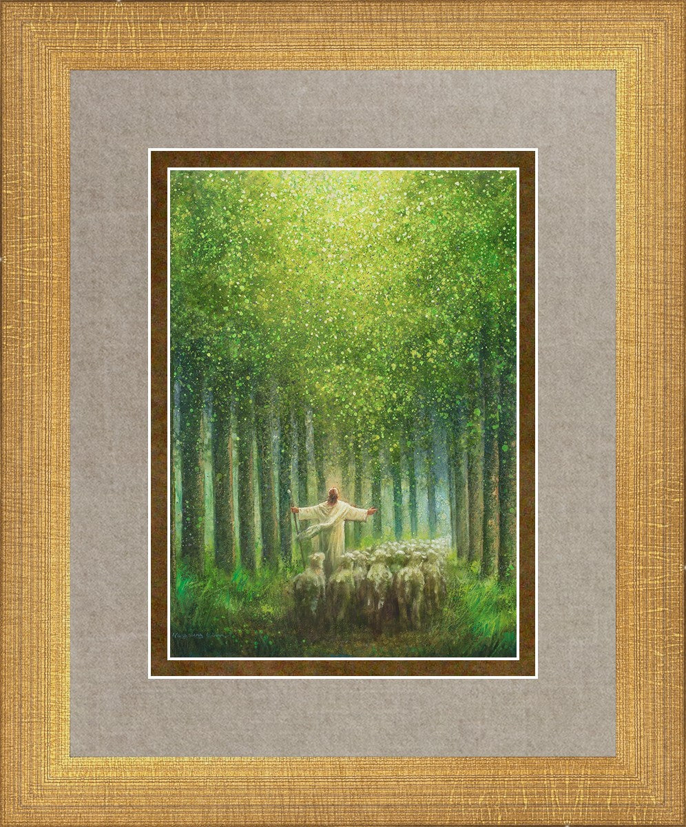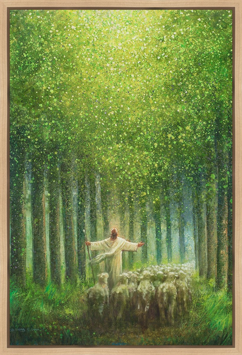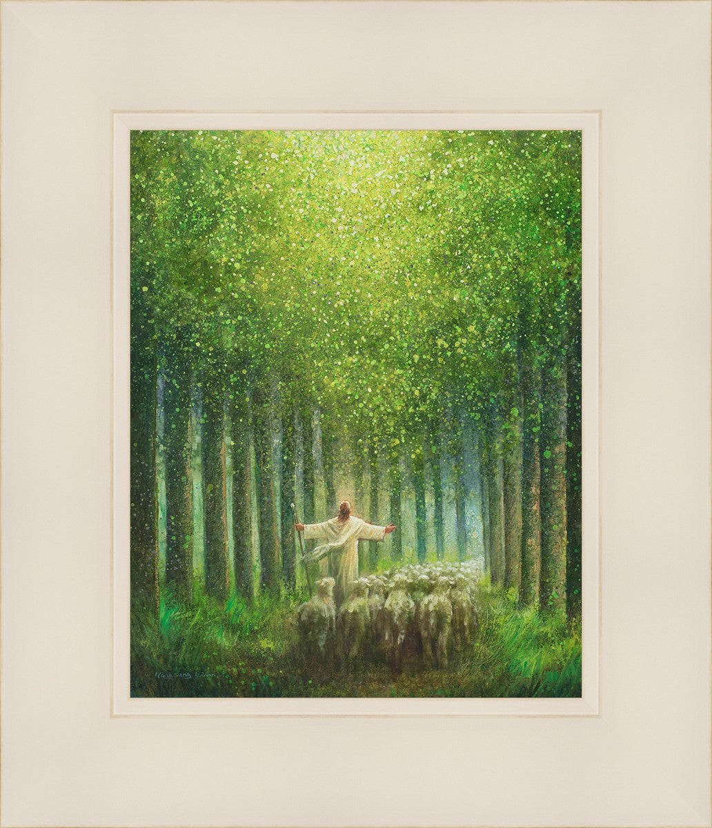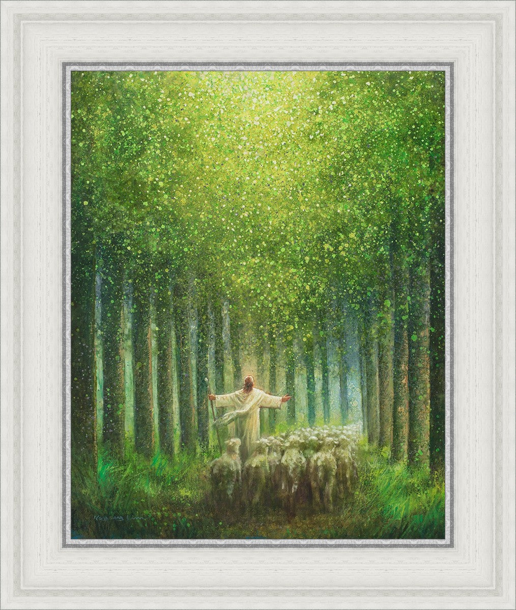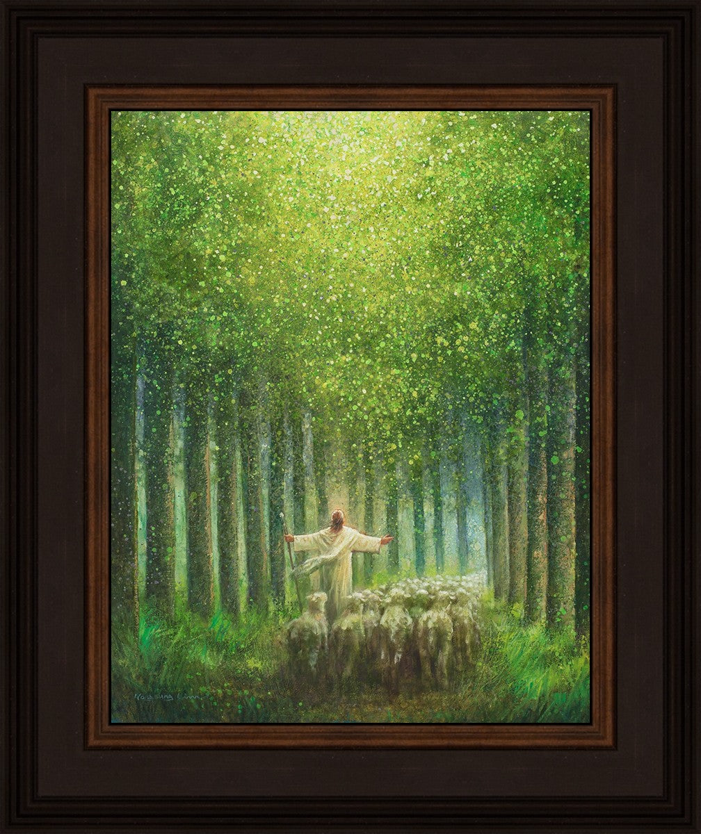 In the depths of a dark and mysterious forest the Good Shepherd guides a flock of sheep with gentle authority. The radiant light of God illuminates the way. The heavenly glow of God's light serves as a constant reminder that even in the most foreboding circumstances, Jesus will guide his beloved flock to the eternal pastures of peace and fulfillment.