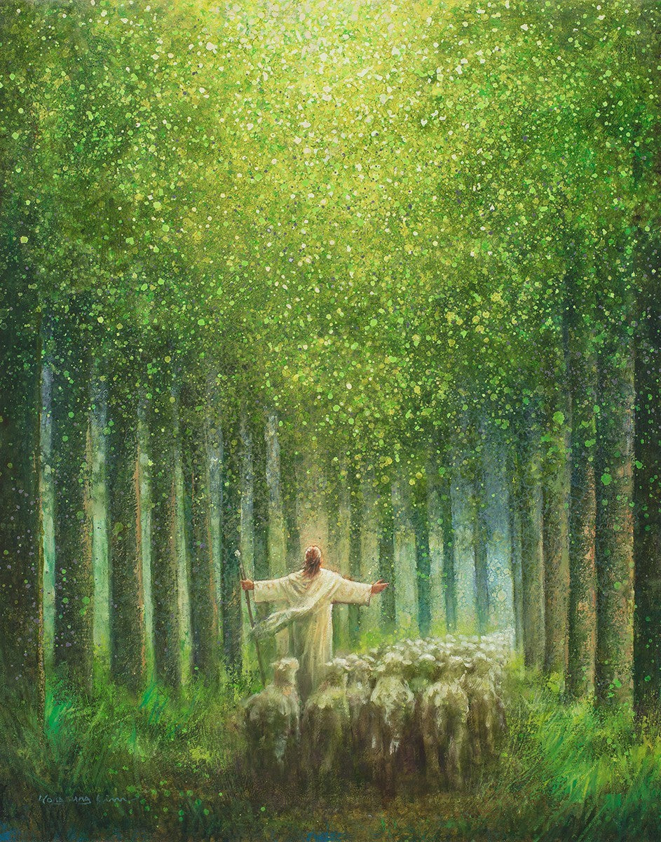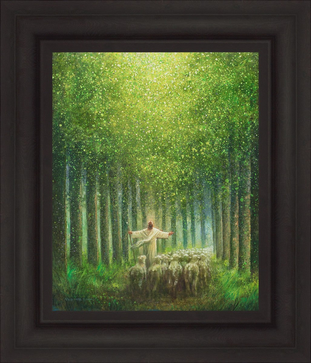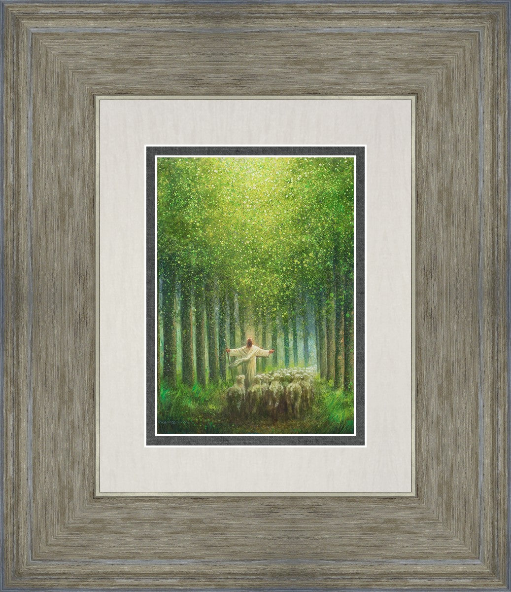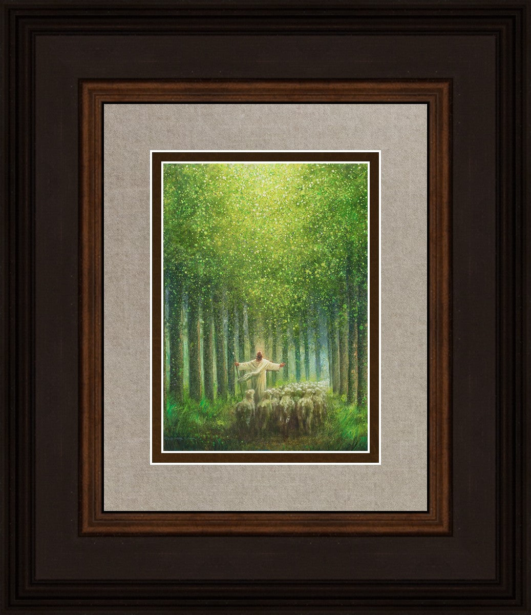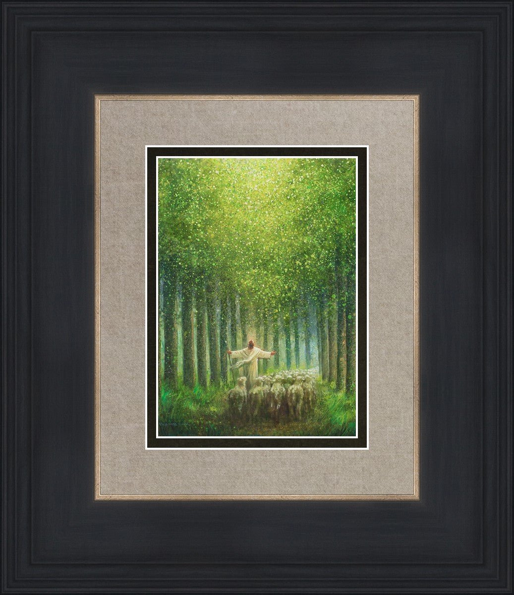 In the depths of a dark and mysterious forest the Good Shepherd guides a flock of sheep with gentle authority. The radiant light of God illuminates the way. The heavenly glow of God's light serves as a constant reminder that even in the most foreboding circumstances, Jesus will guide his beloved flock to the eternal pastures of peace and fulfillment.