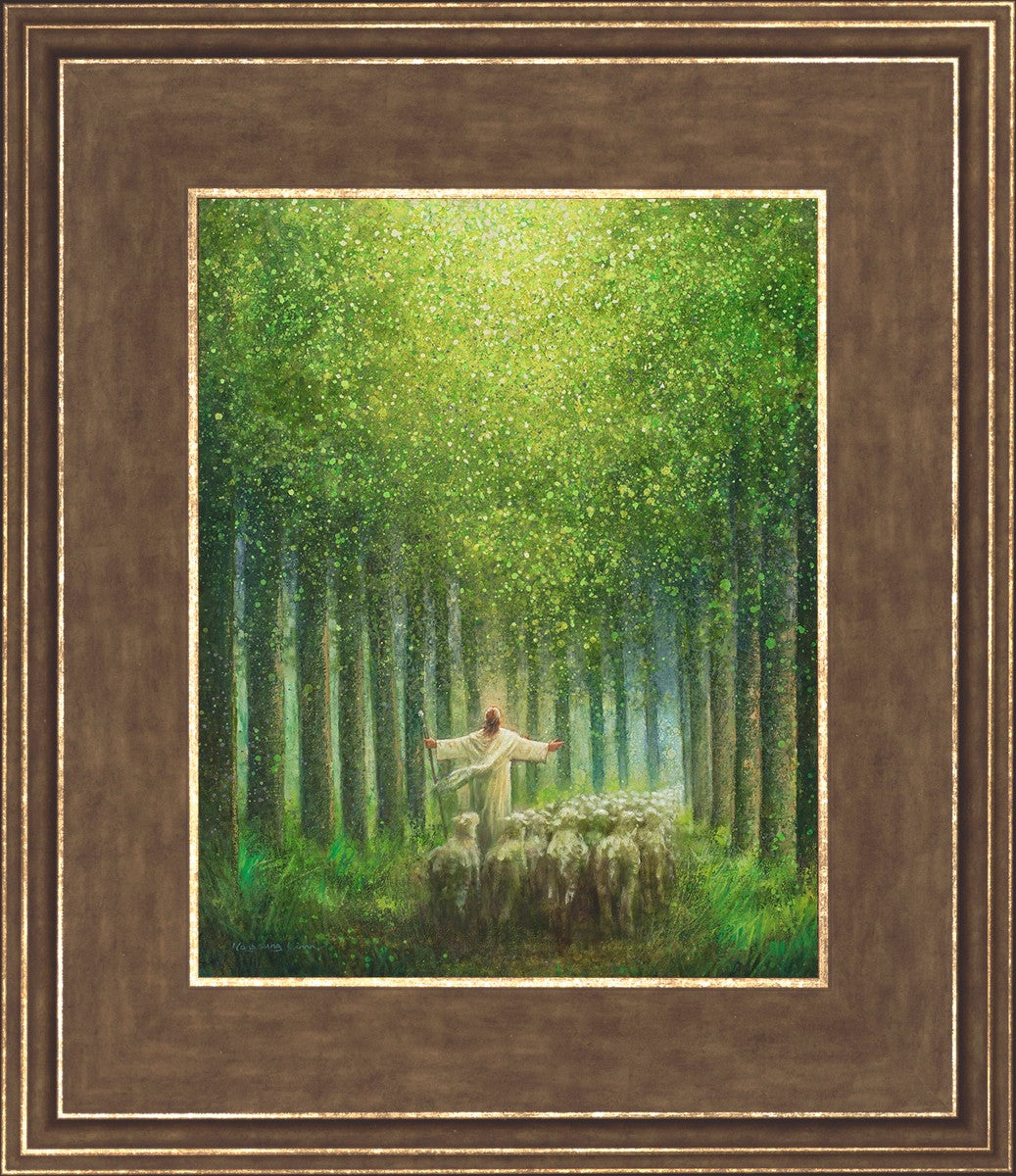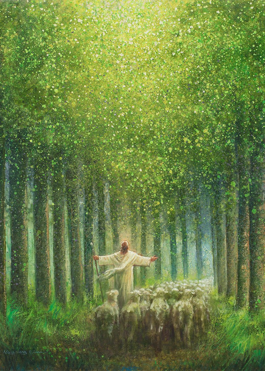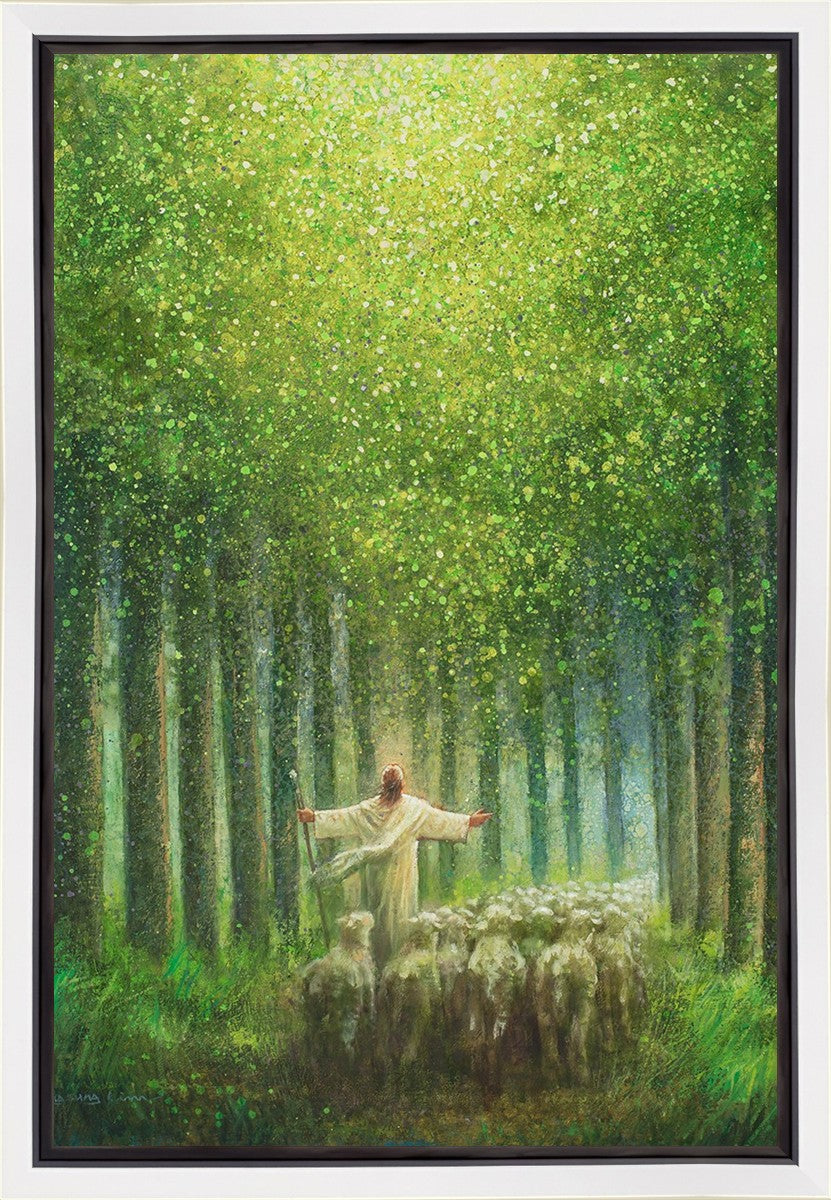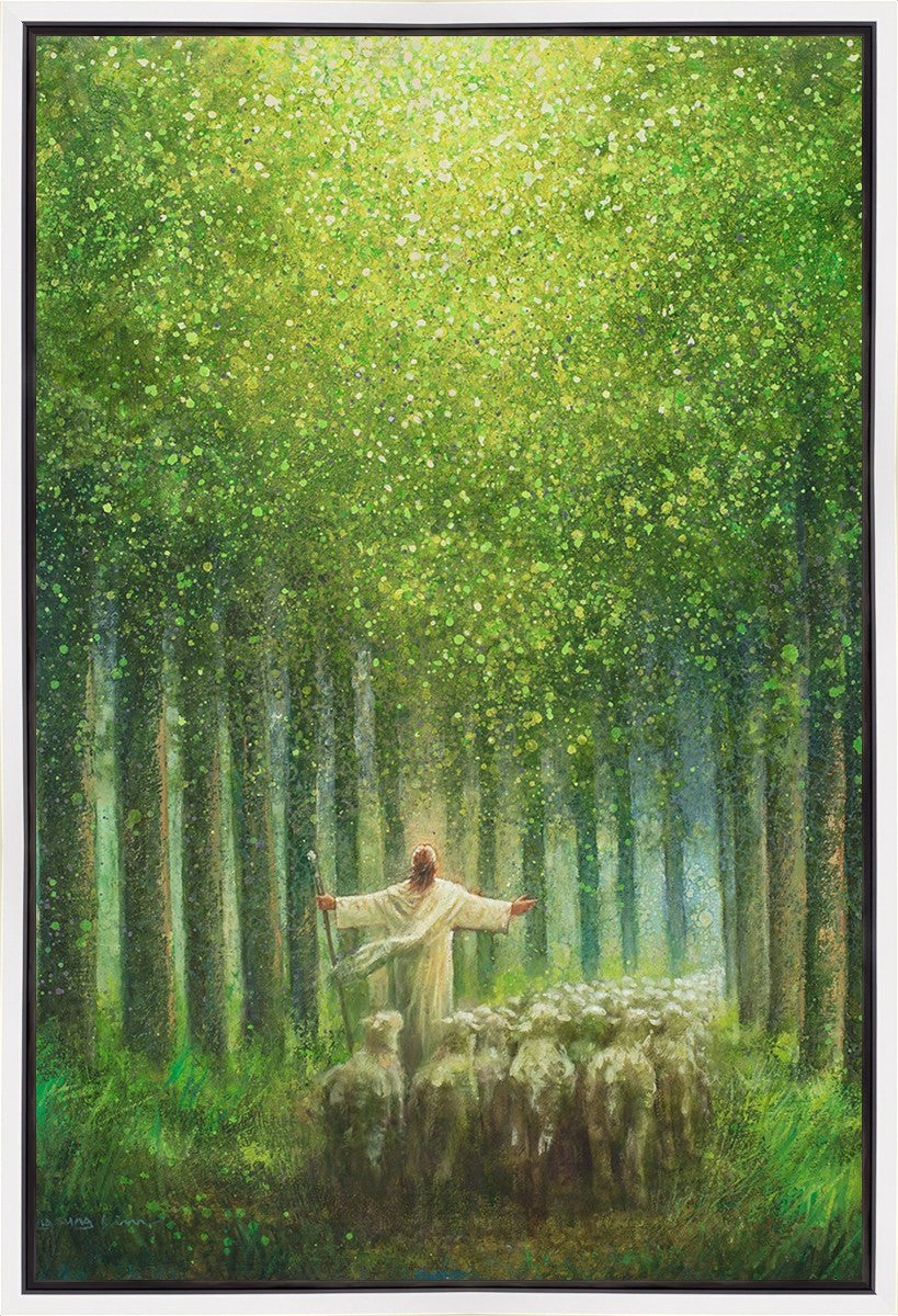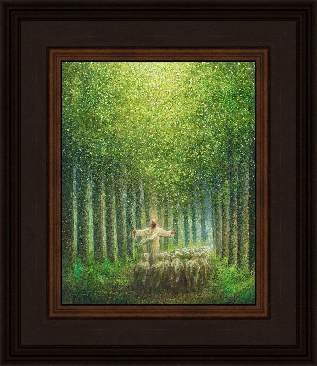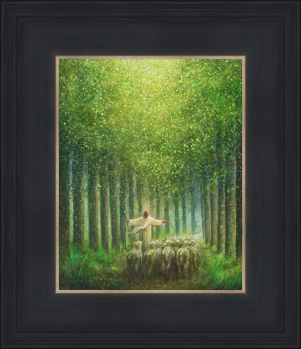 In the depths of a dark and mysterious forest the Good Shepherd guides a flock of sheep with gentle authority. The radiant light of God illuminates the way. The heavenly glow of God's light serves as a constant reminder that even in the most foreboding circumstances, Jesus will guide his beloved flock to the eternal pastures of peace and fulfillment.