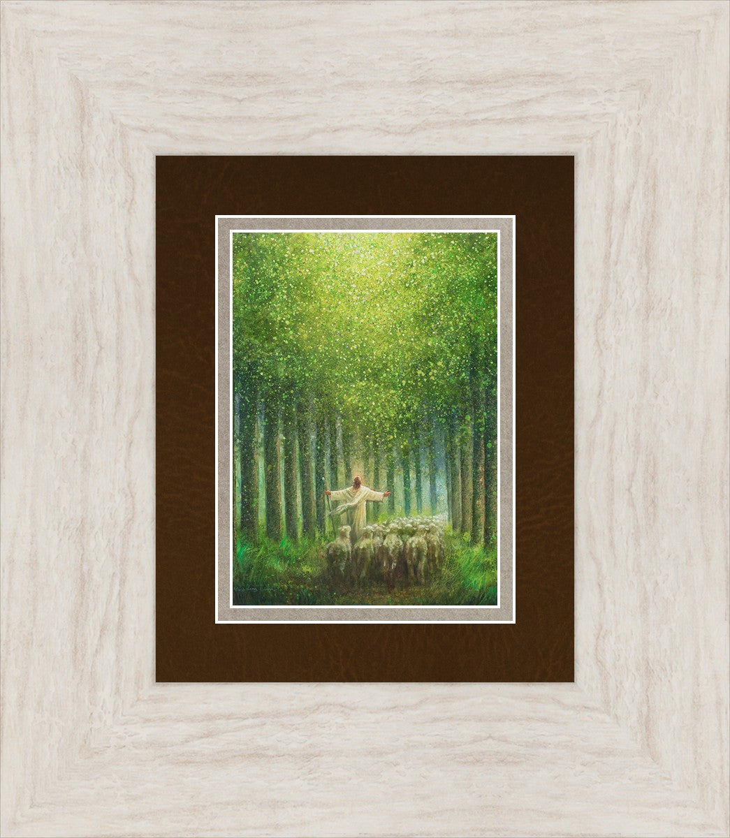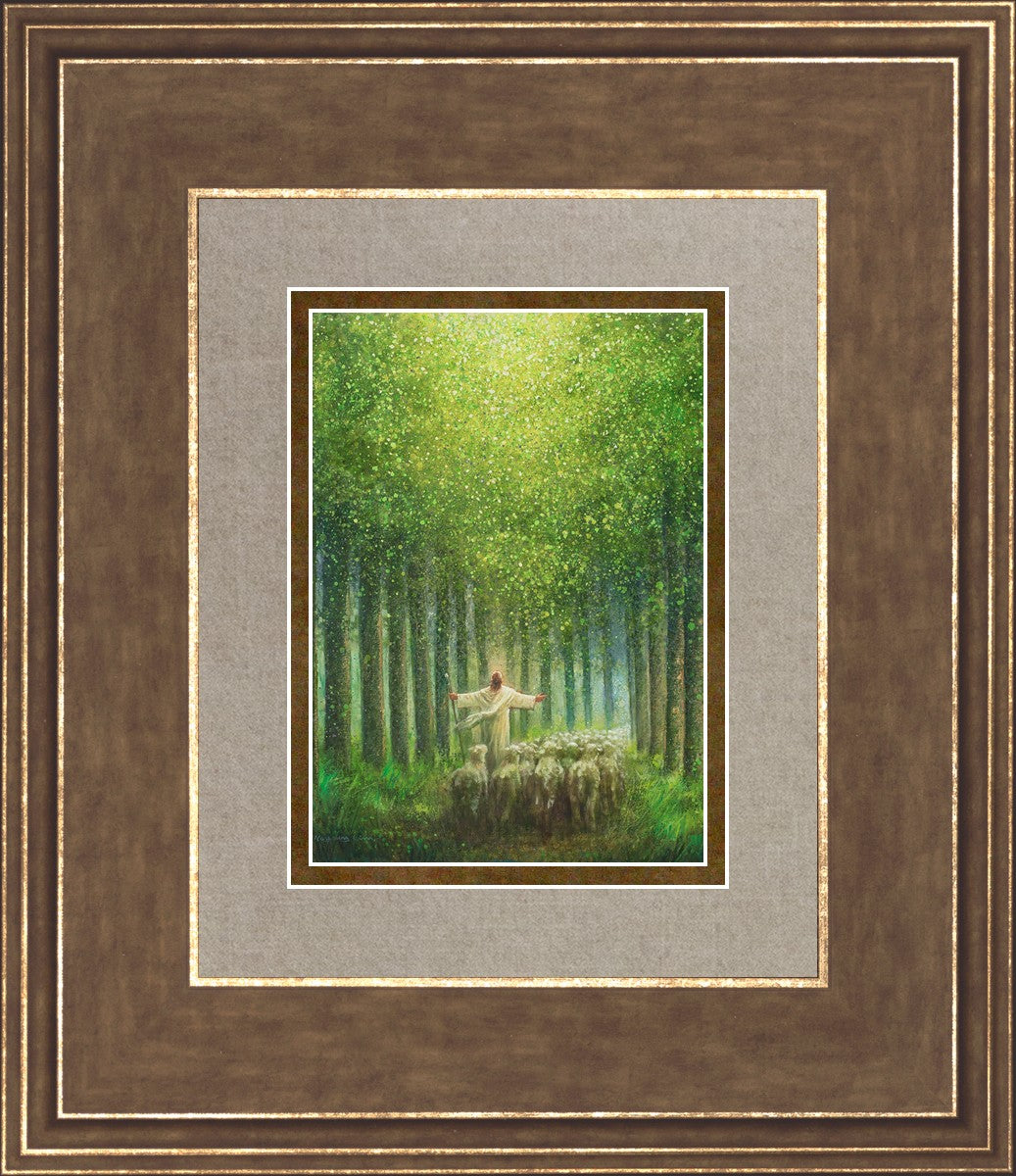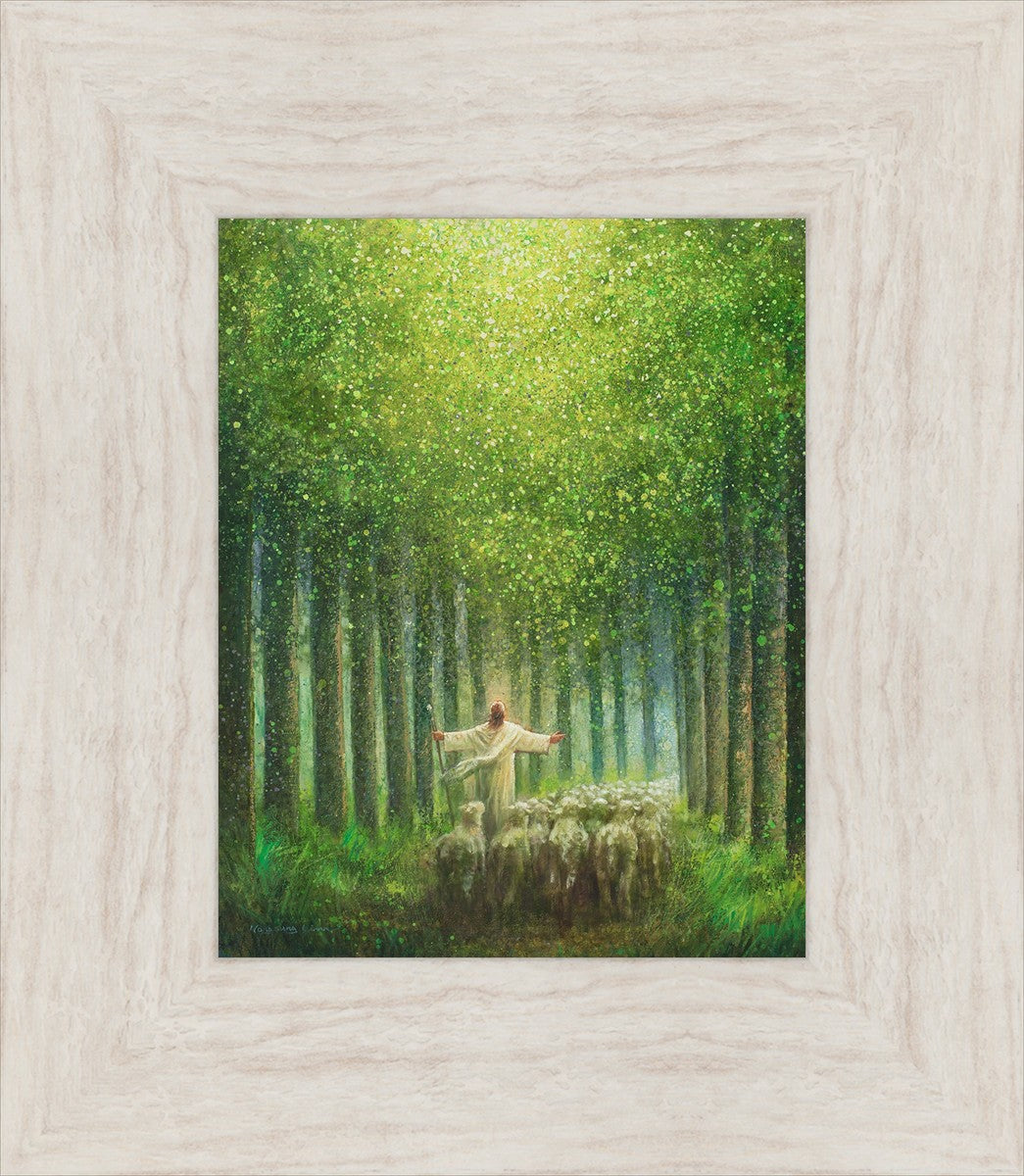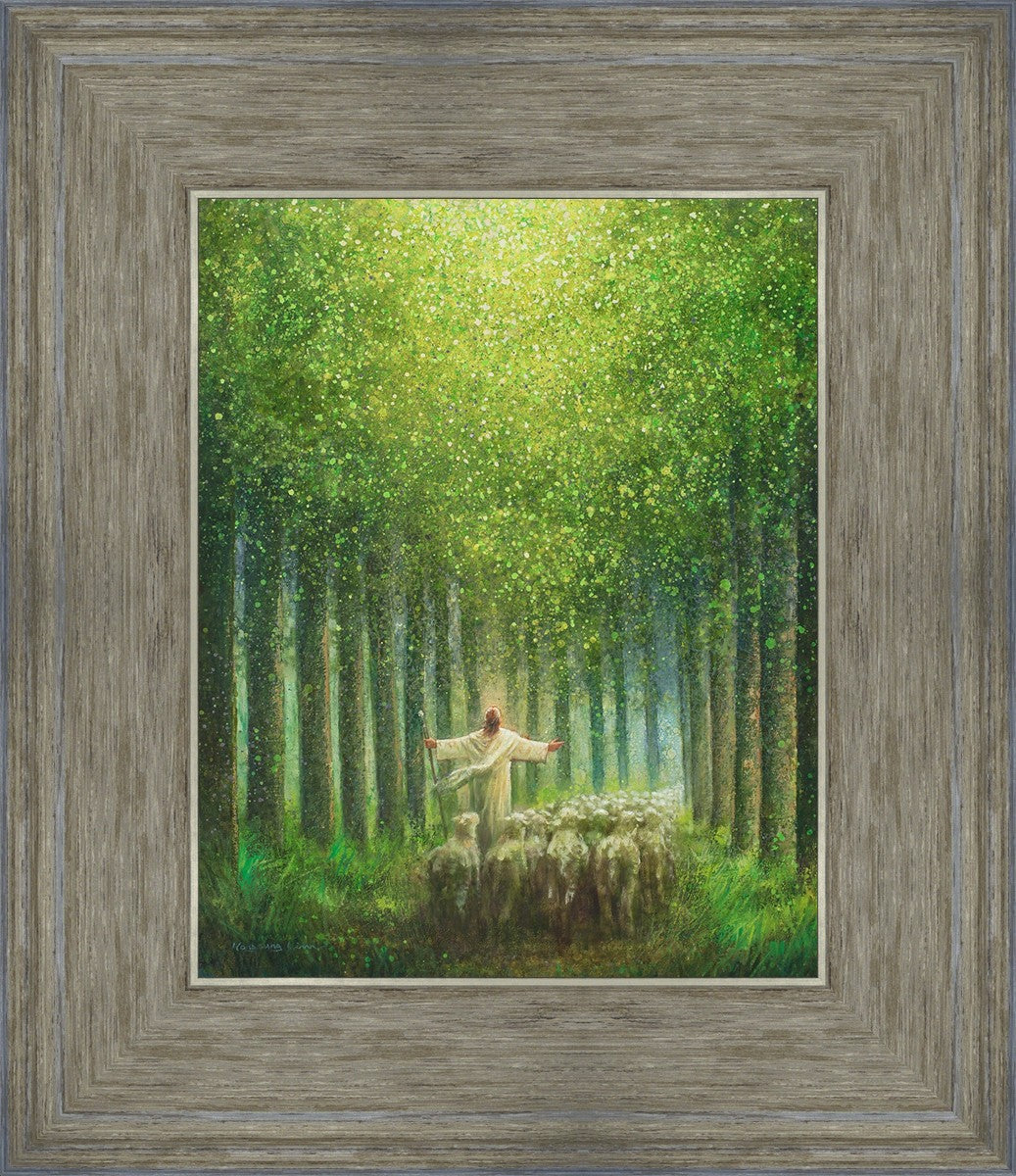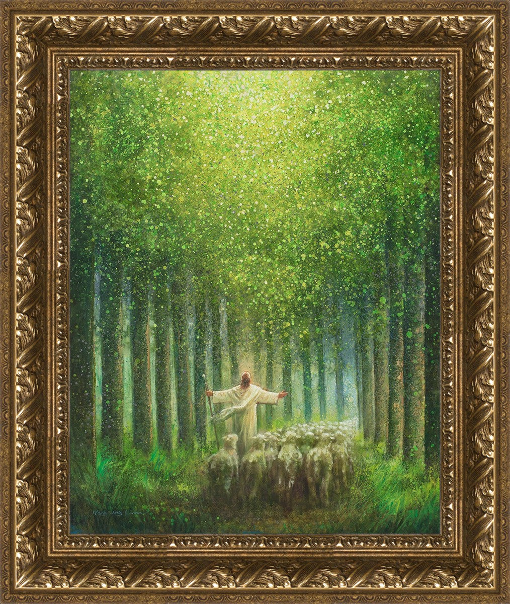 In the depths of a dark and mysterious forest the Good Shepherd guides a flock of sheep with gentle authority. The radiant light of God illuminates the way. The heavenly glow of God's light serves as a constant reminder that even in the most foreboding circumstances, Jesus will guide his beloved flock to the eternal pastures of peace and fulfillment.