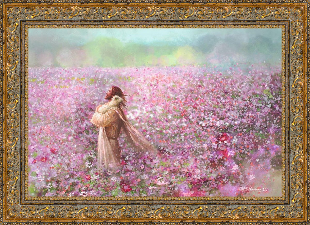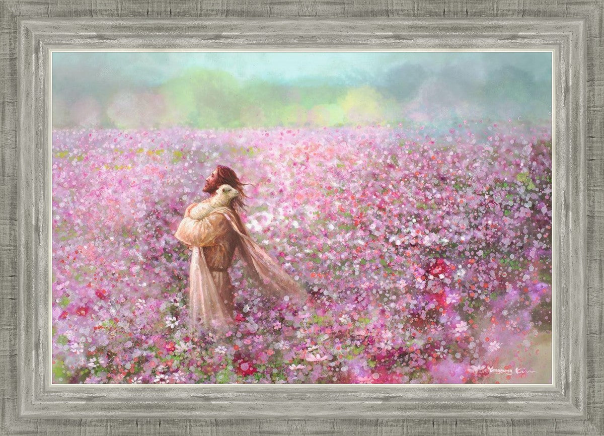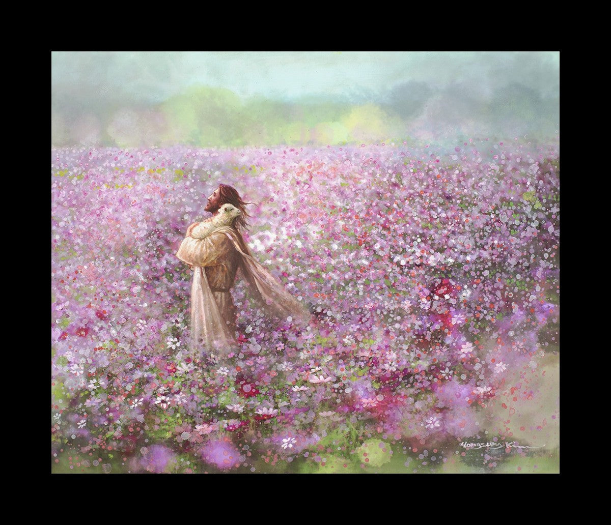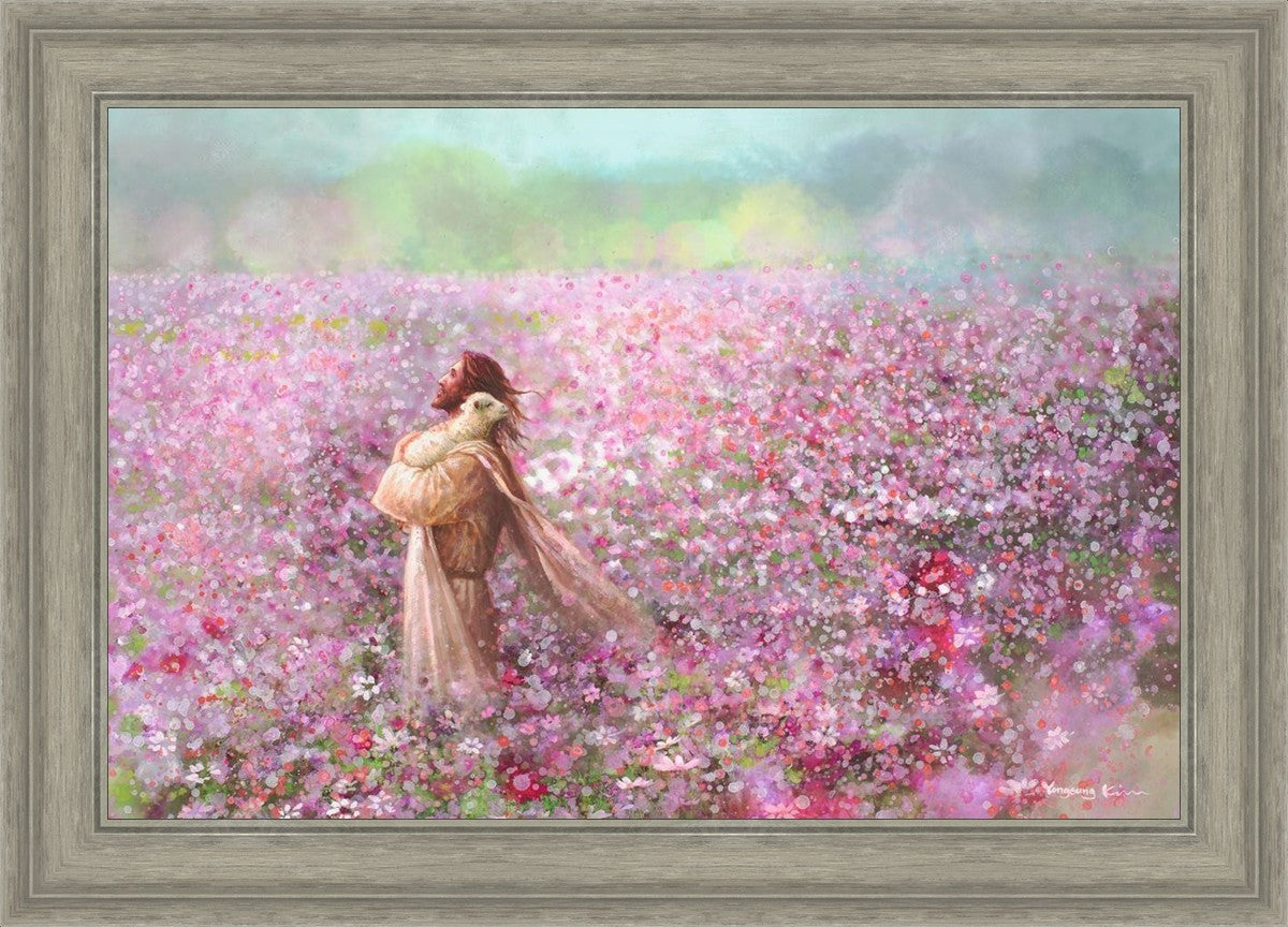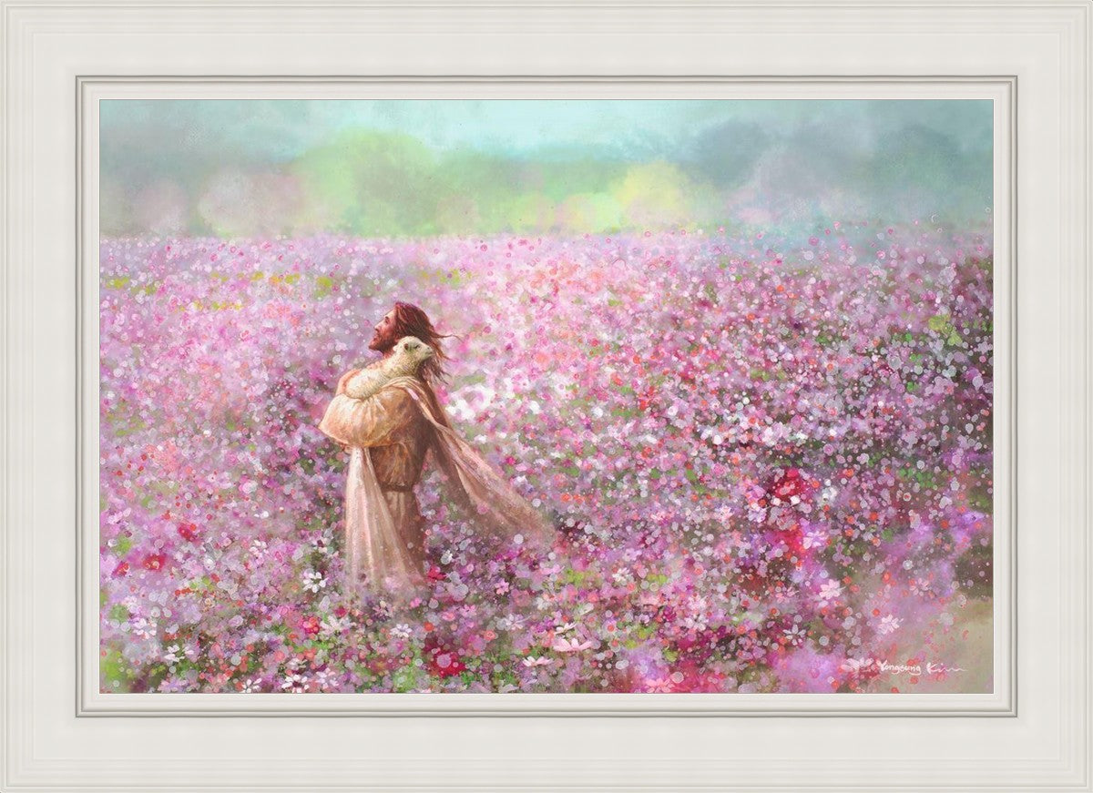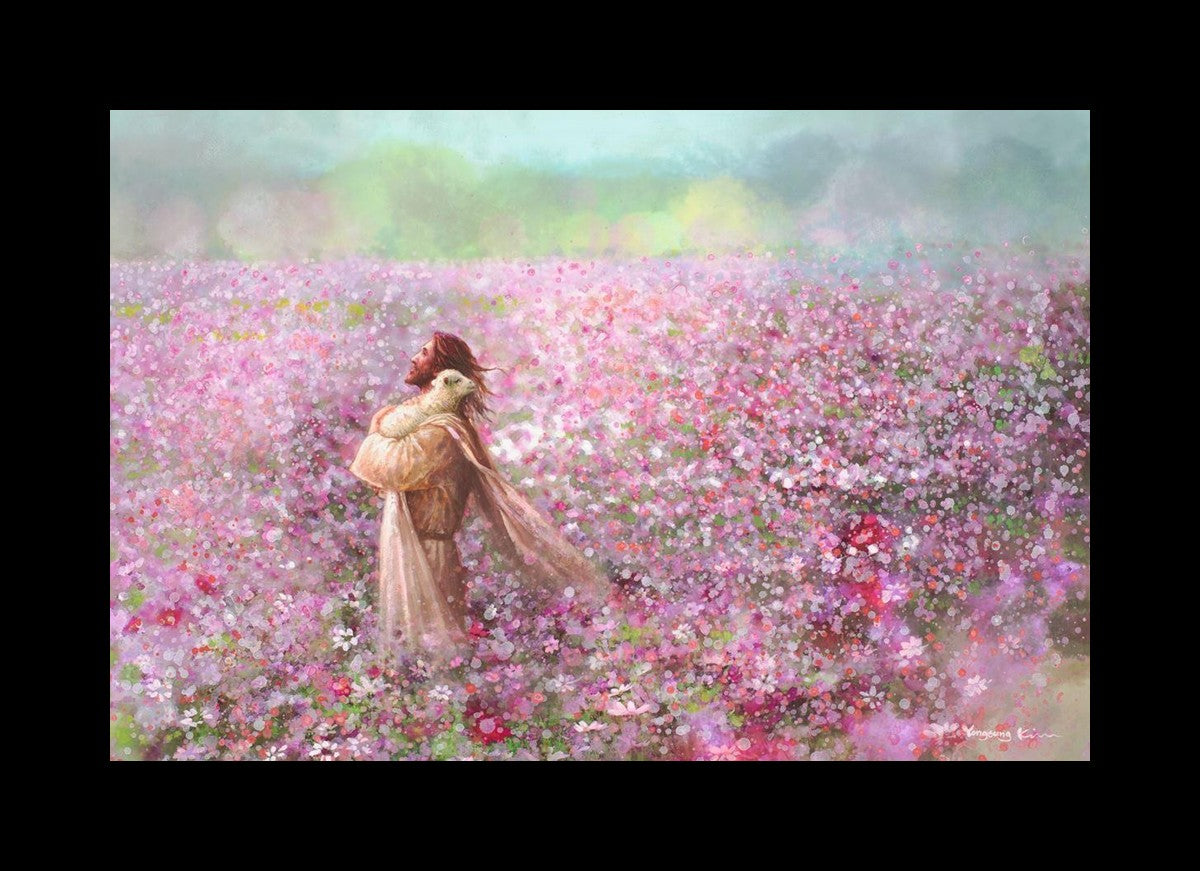 The Calming Embrace by Yongsung Kim is a painting depicts Jesus Christ holding a lost lamb in a field of pink and purple flowers. This painting by Yongsung Kim can help create calm in your own life and you imagine Christ embracing your personally.