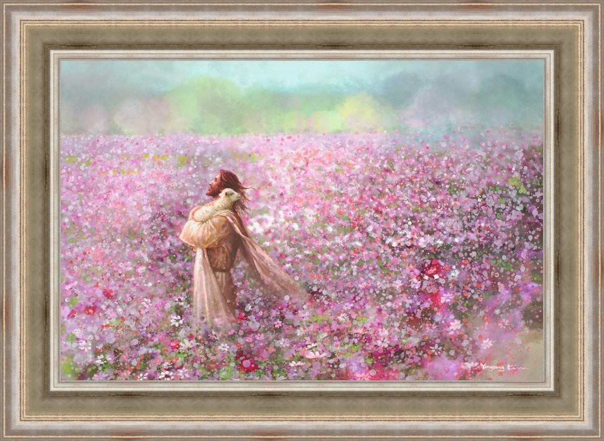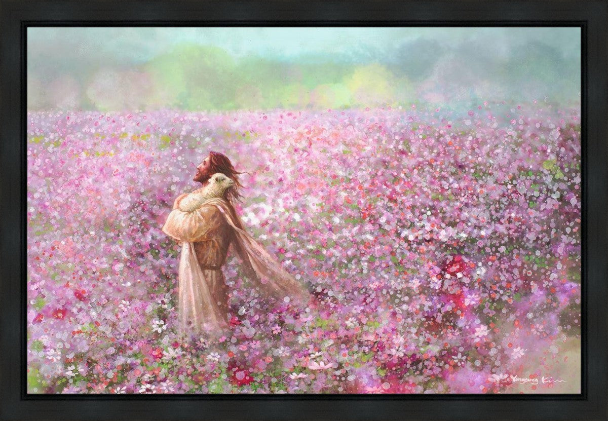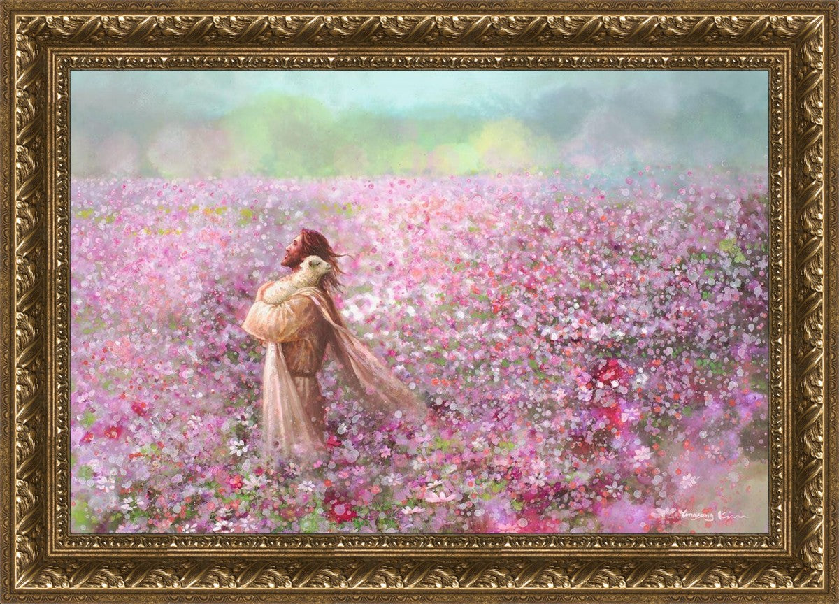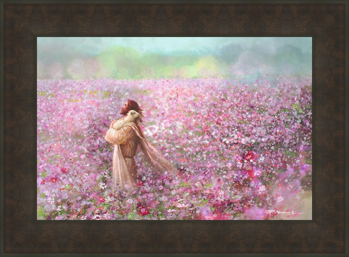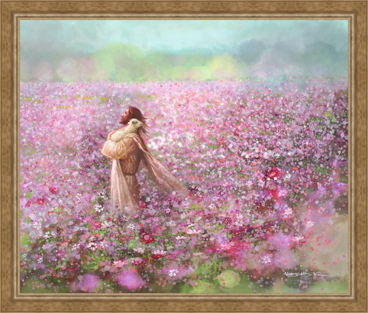 The Calming Embrace by Yongsung Kim is a painting depicts Jesus Christ holding a lost lamb in a field of pink and purple flowers. This painting by Yongsung Kim can help create calm in your own life and you imagine Christ embracing your personally.