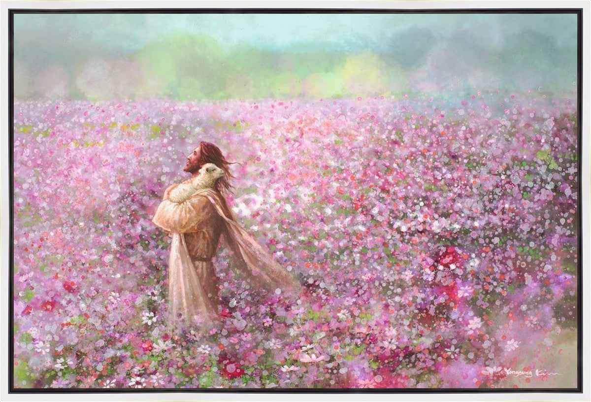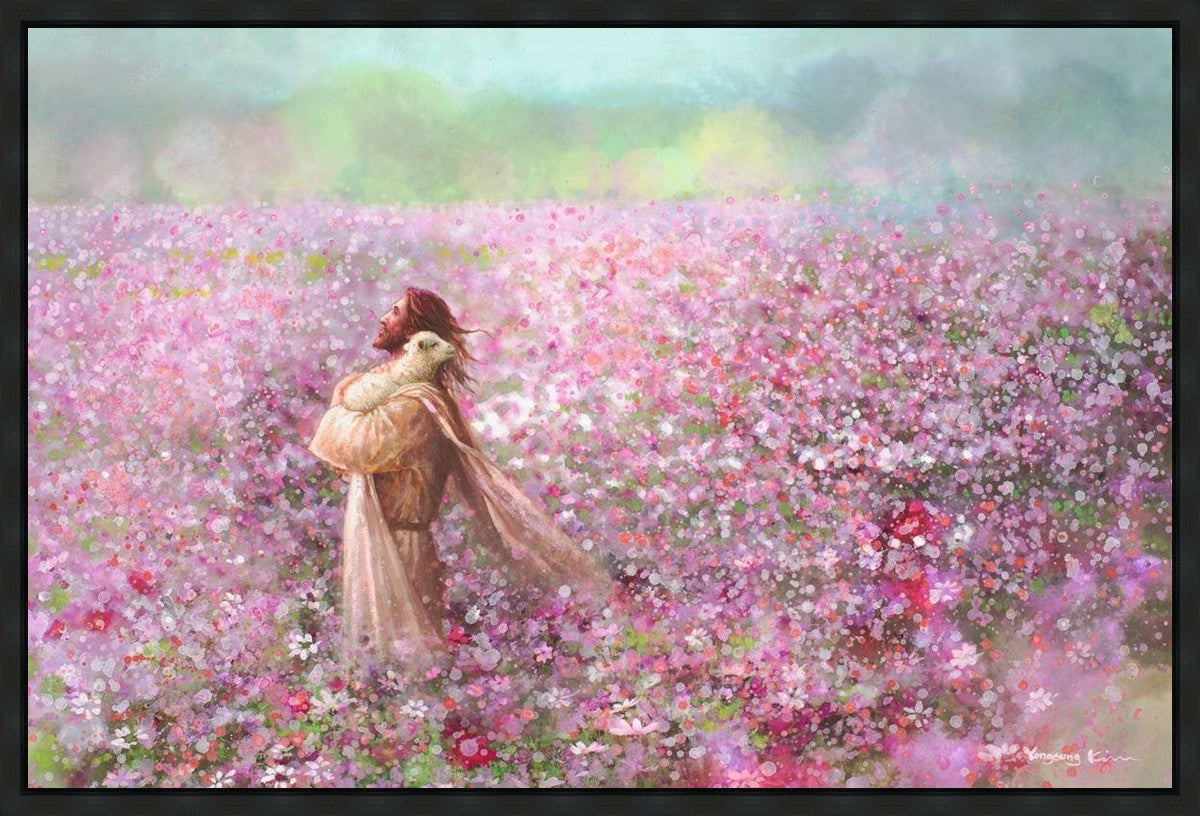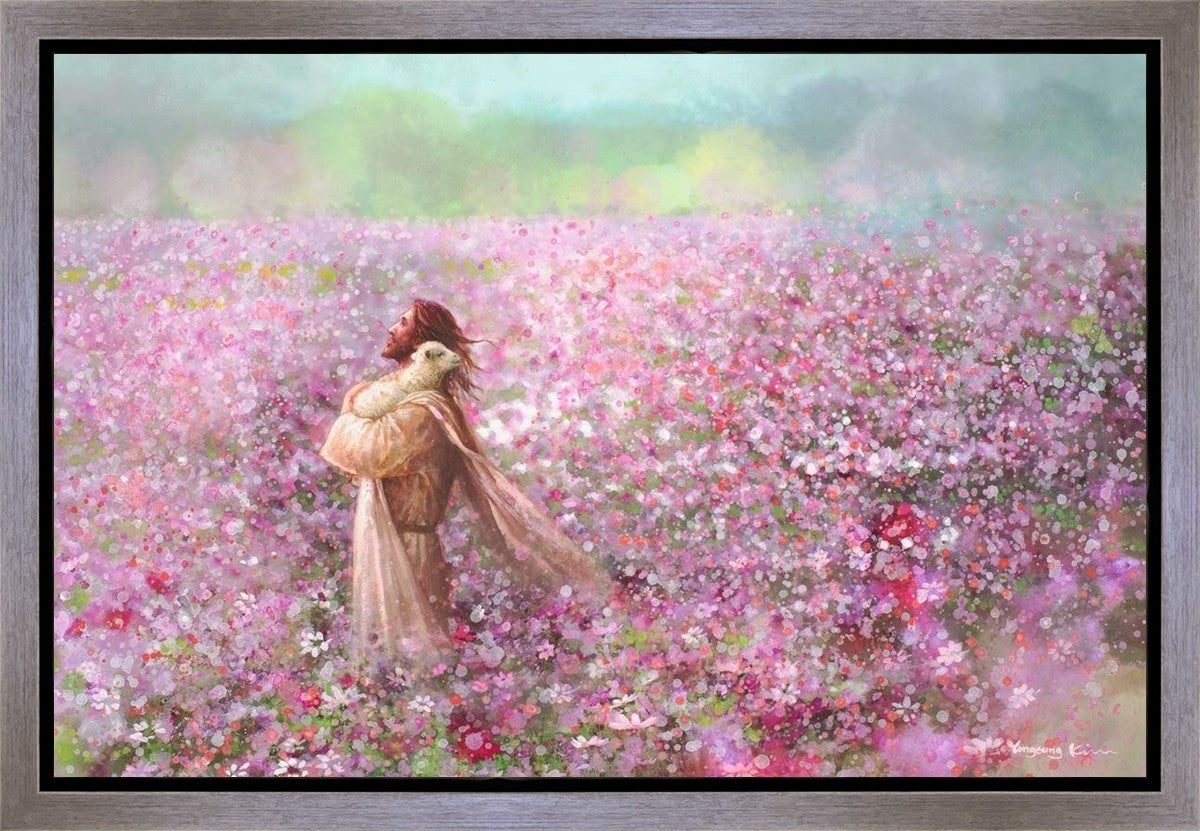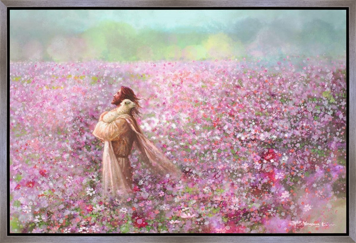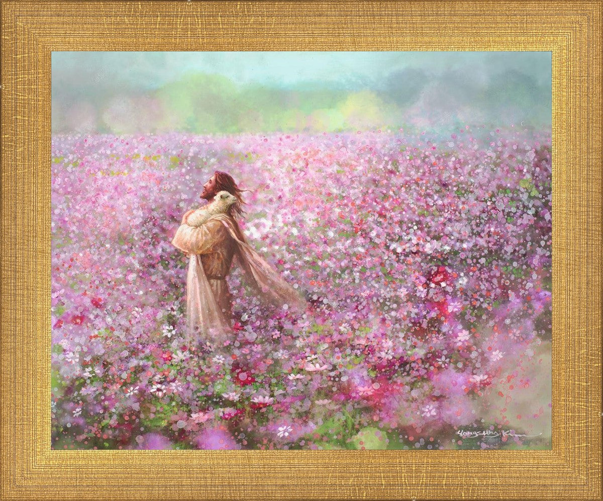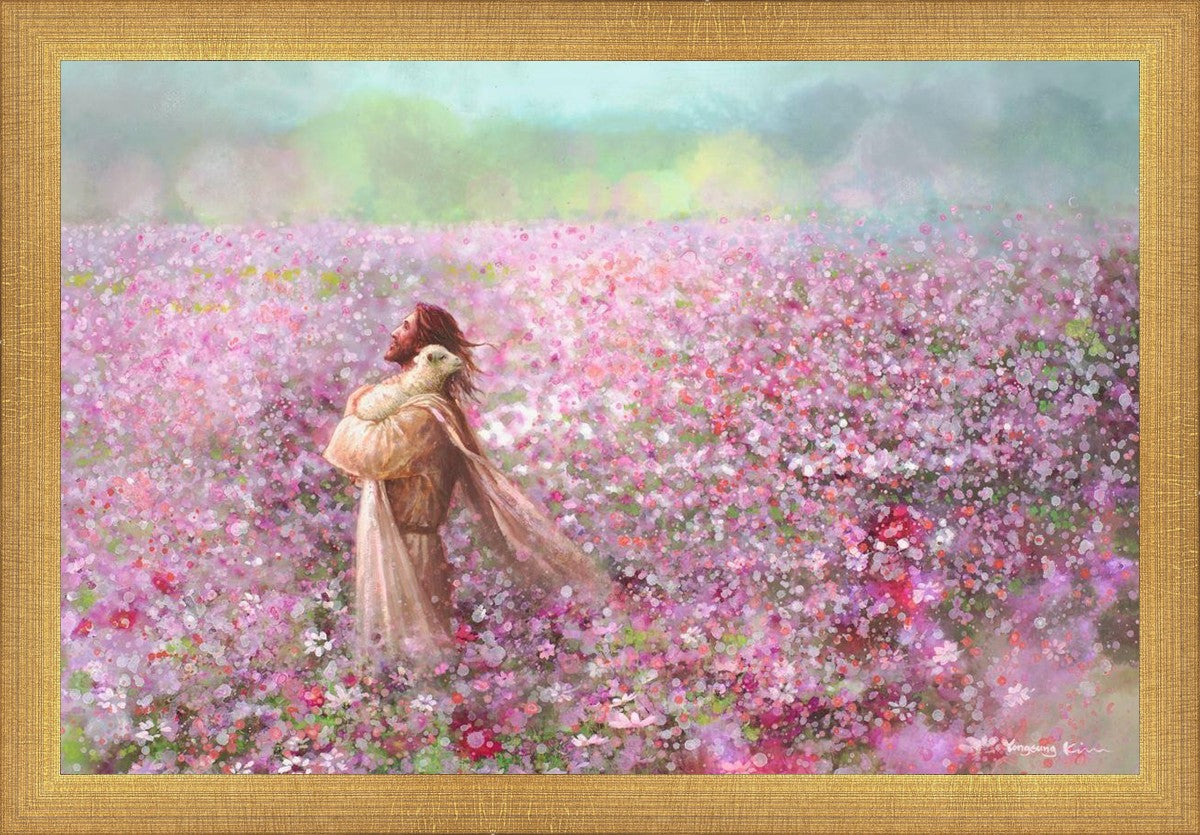 The Calming Embrace by Yongsung Kim is a painting depicts Jesus Christ holding a lost lamb in a field of pink and purple flowers. This painting by Yongsung Kim can help create calm in your own life and you imagine Christ embracing your personally.