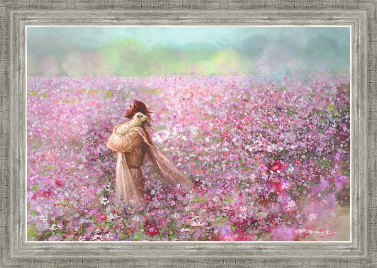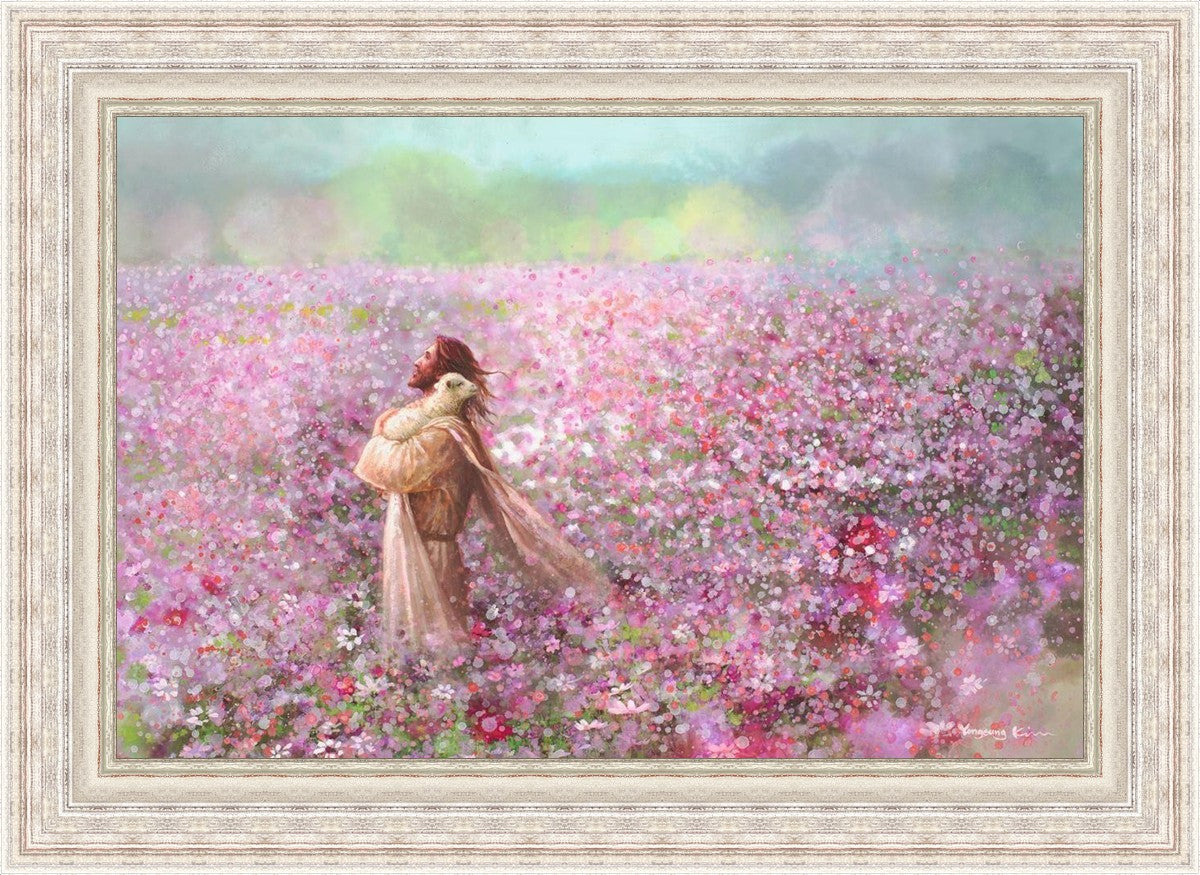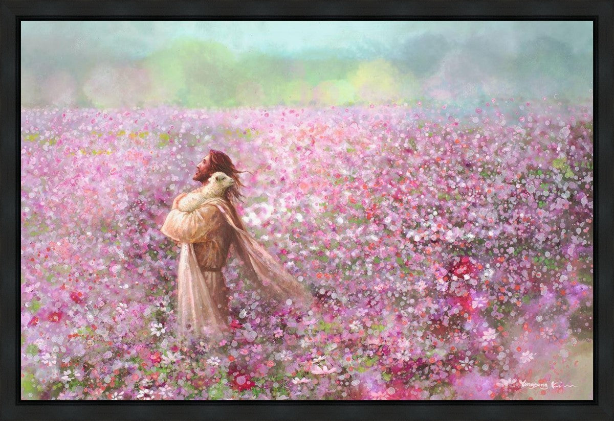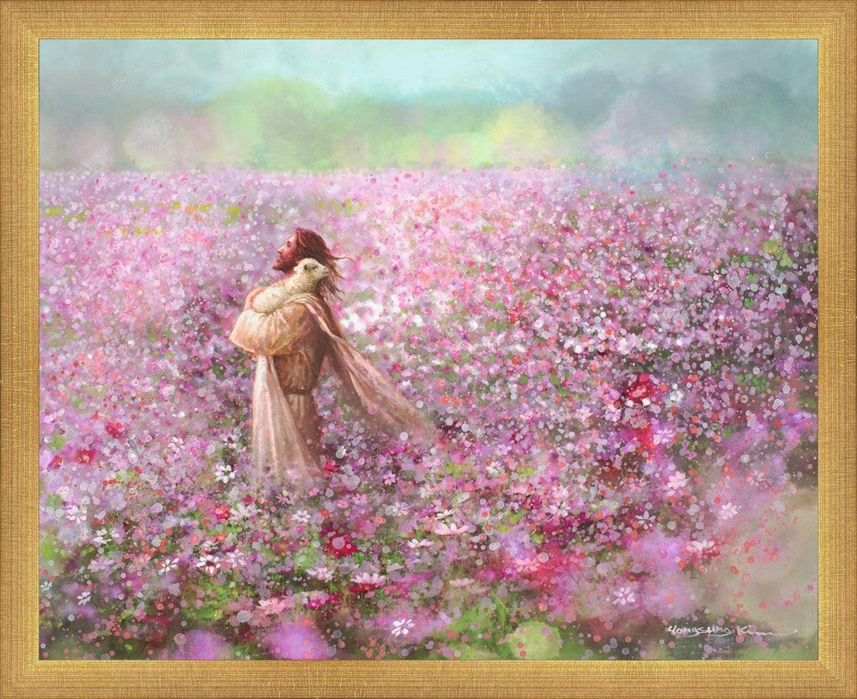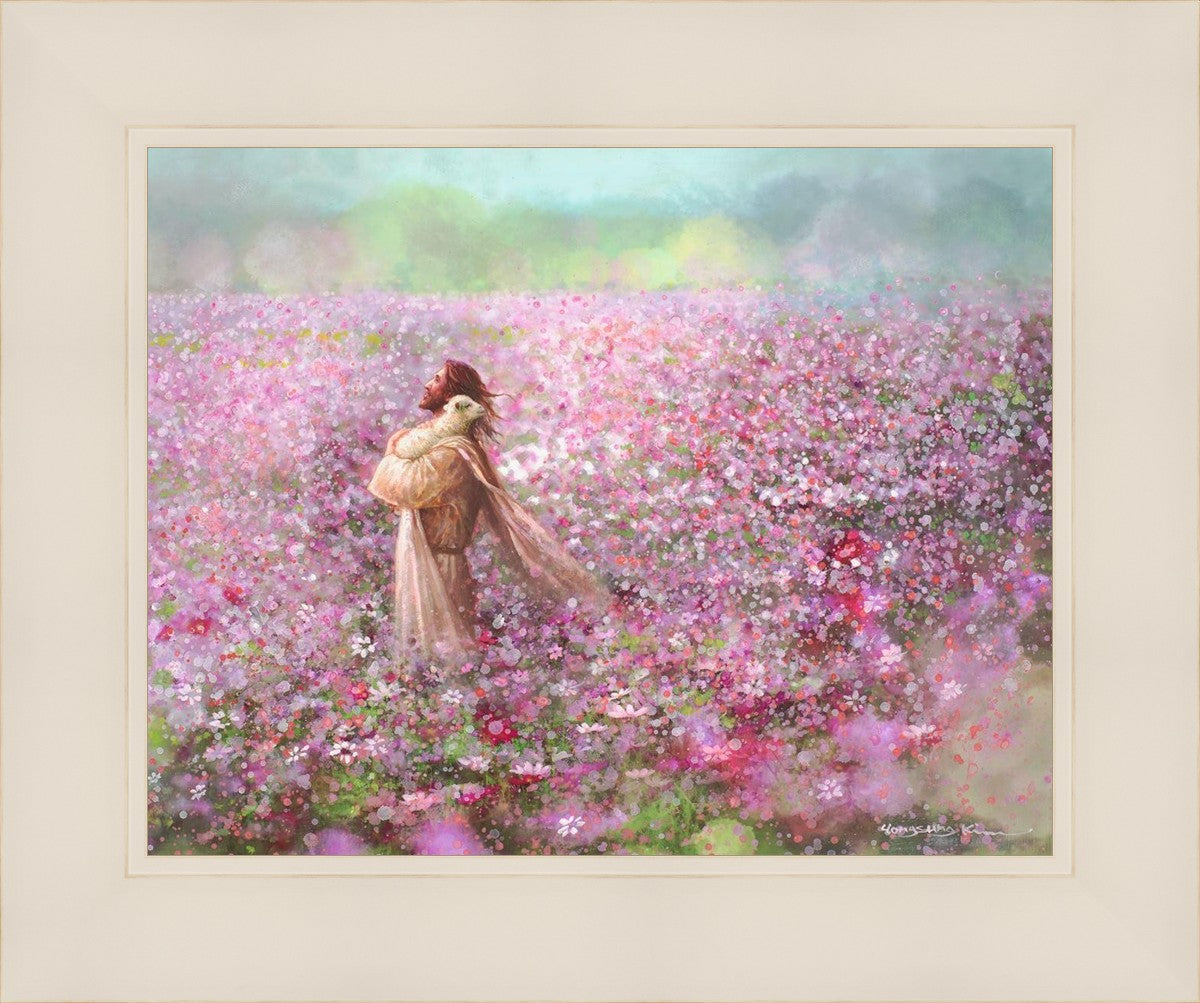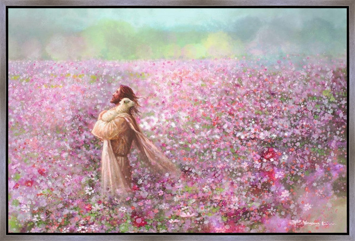 The Calming Embrace by Yongsung Kim is a painting depicts Jesus Christ holding a lost lamb in a field of pink and purple flowers. This painting by Yongsung Kim can help create calm in your own life and you imagine Christ embracing your personally.