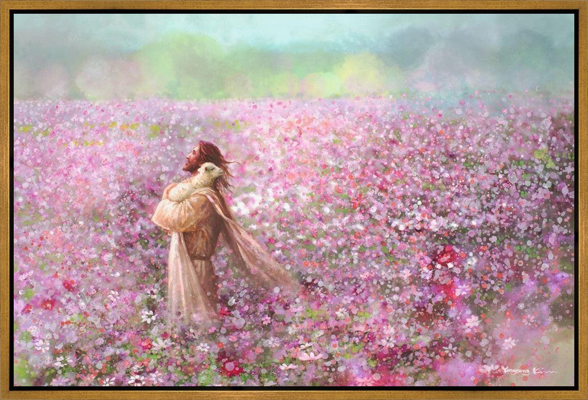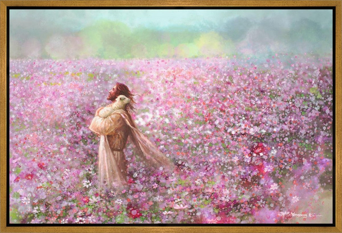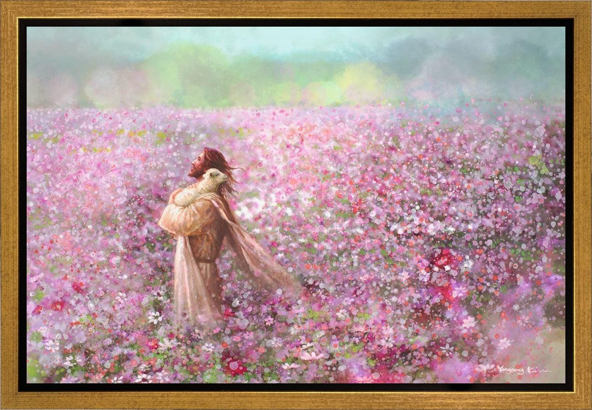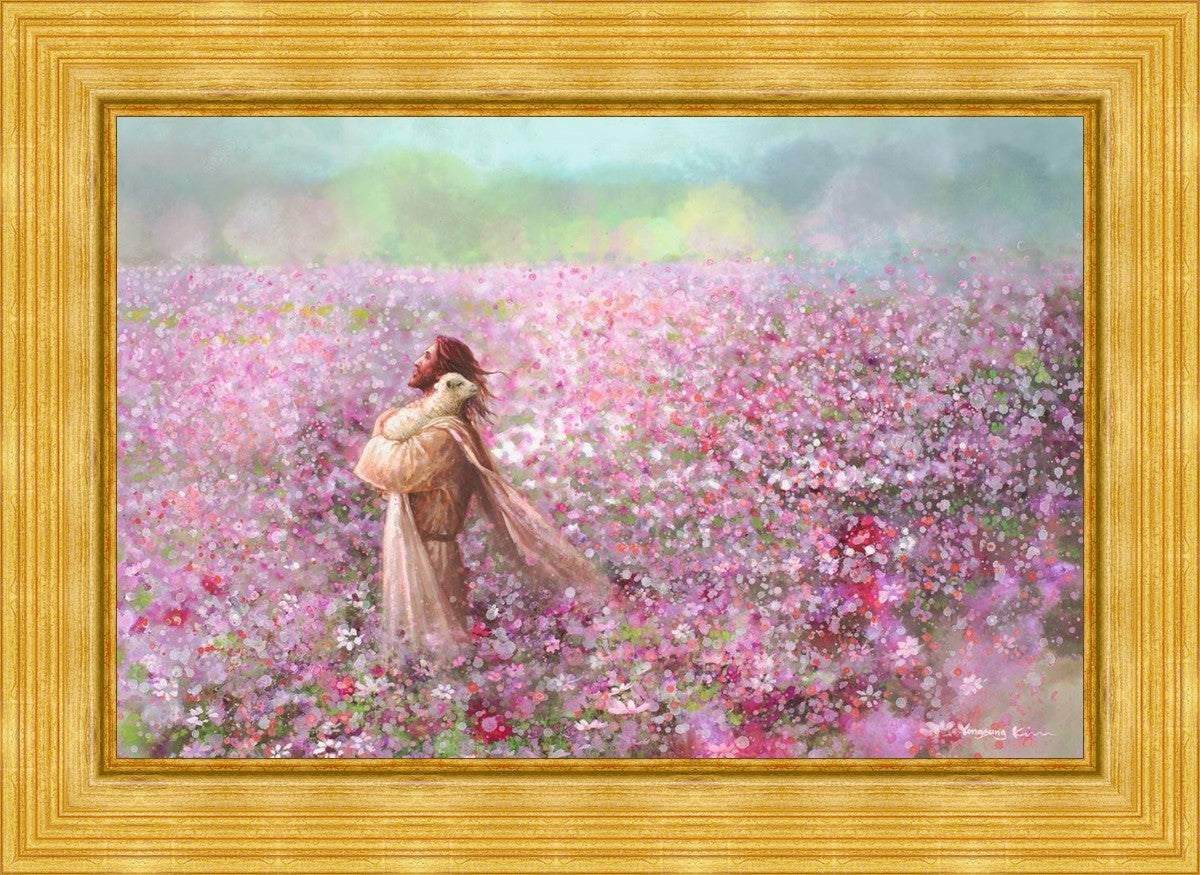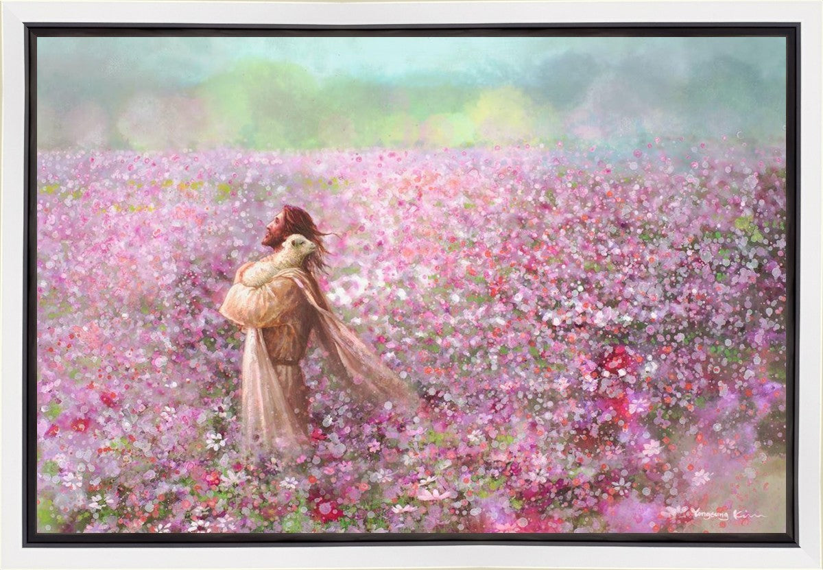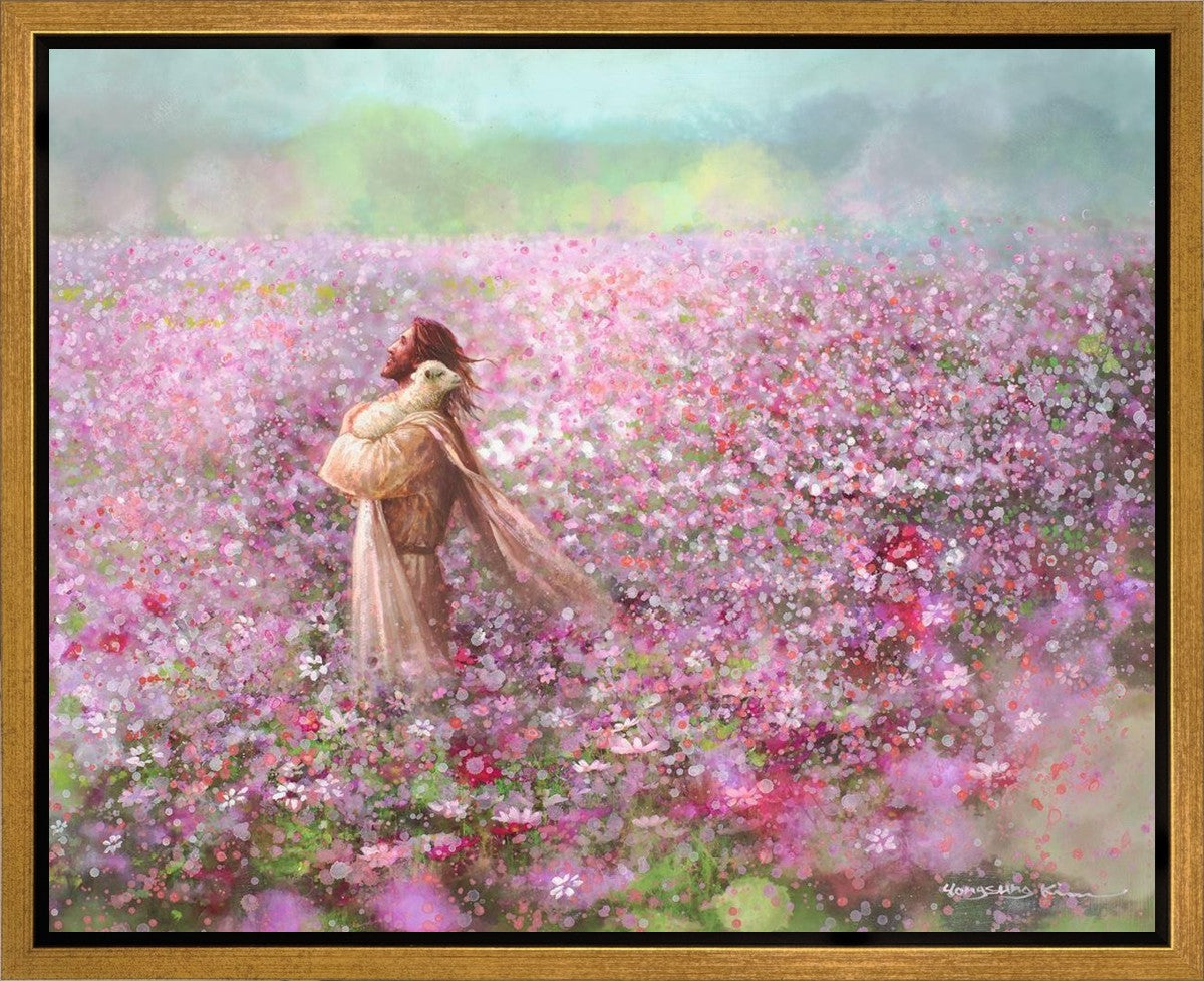 The Calming Embrace by Yongsung Kim is a painting depicts Jesus Christ holding a lost lamb in a field of pink and purple flowers. This painting by Yongsung Kim can help create calm in your own life and you imagine Christ embracing your personally.