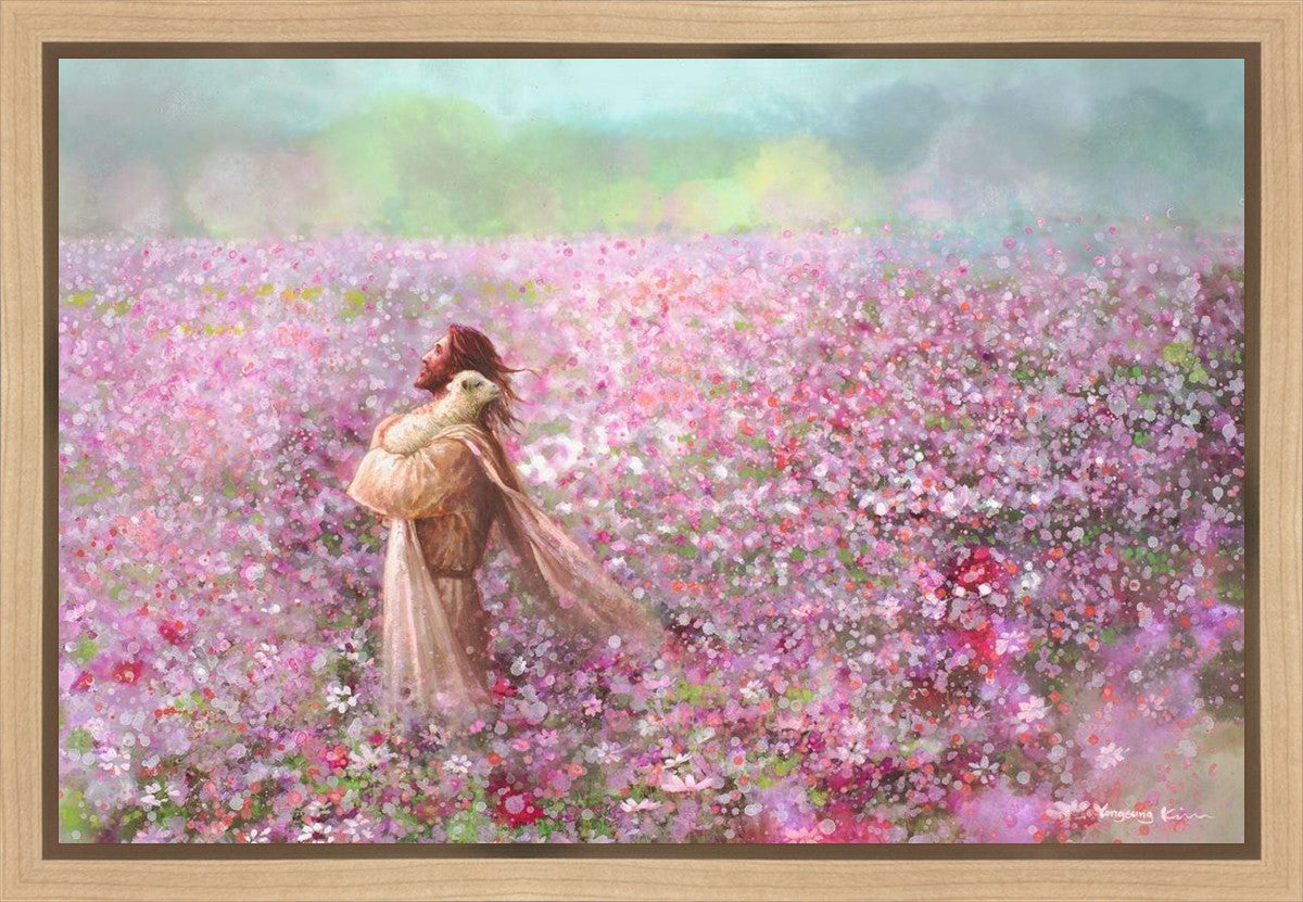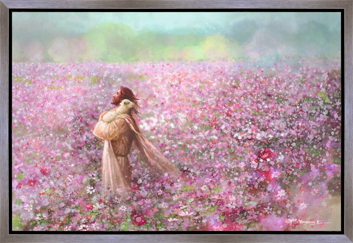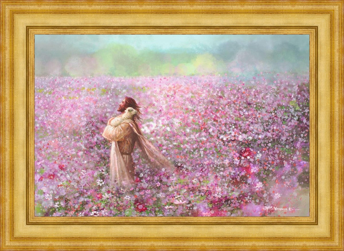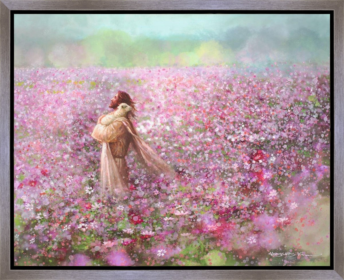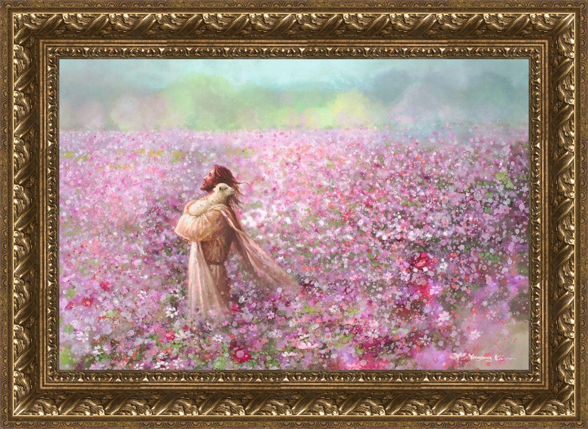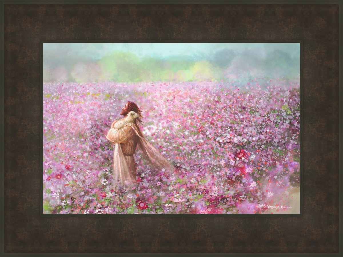 The Calming Embrace by Yongsung Kim is a painting depicts Jesus Christ holding a lost lamb in a field of pink and purple flowers. This painting by Yongsung Kim can help create calm in your own life and you imagine Christ embracing your personally.
