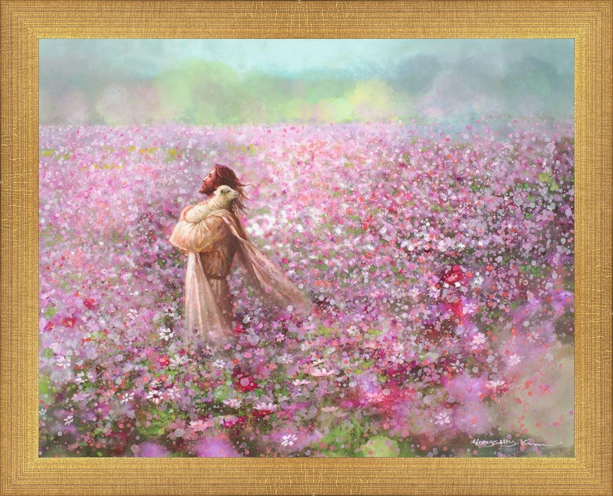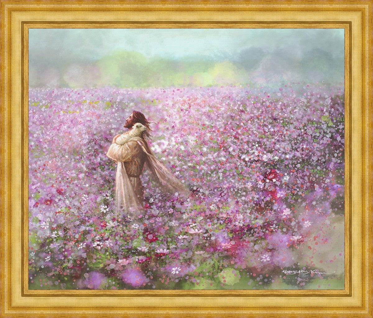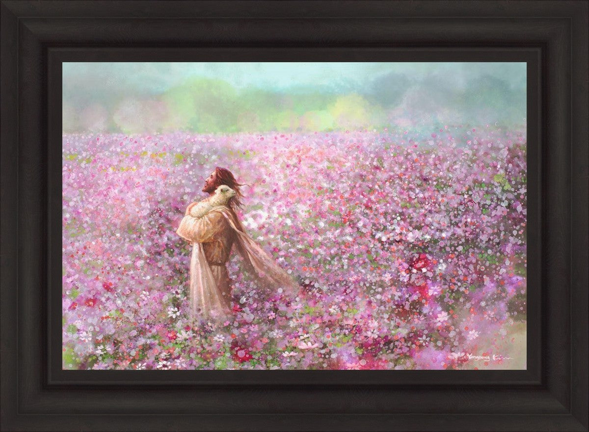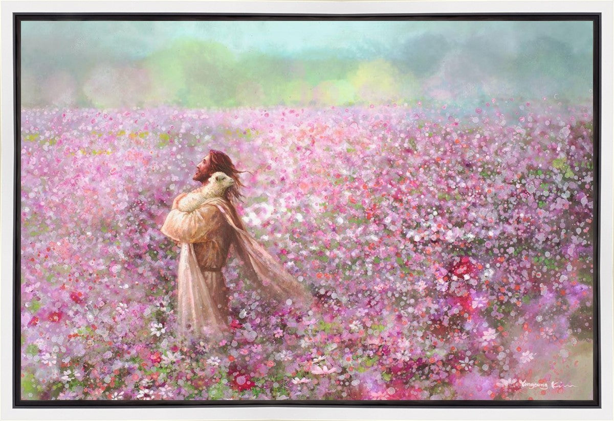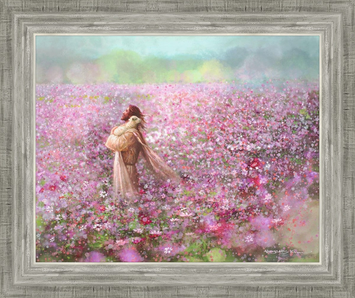 The Calming Embrace by Yongsung Kim is a painting depicts Jesus Christ holding a lost lamb in a field of pink and purple flowers. This painting by Yongsung Kim can help create calm in your own life and you imagine Christ embracing your personally.