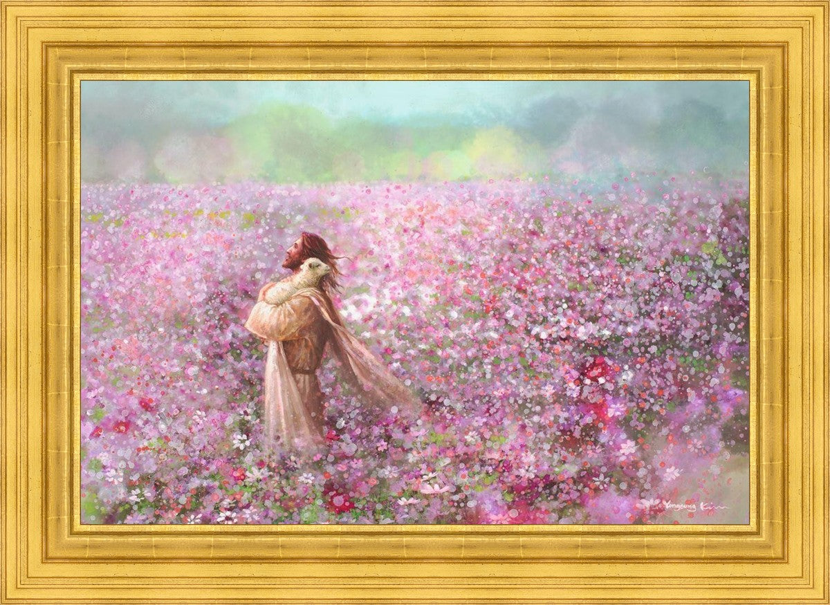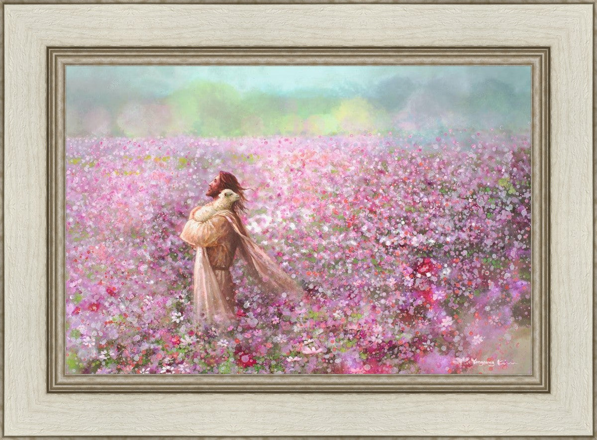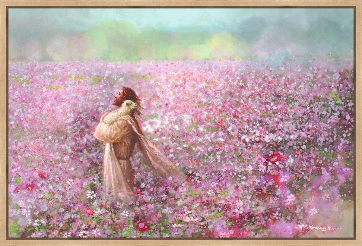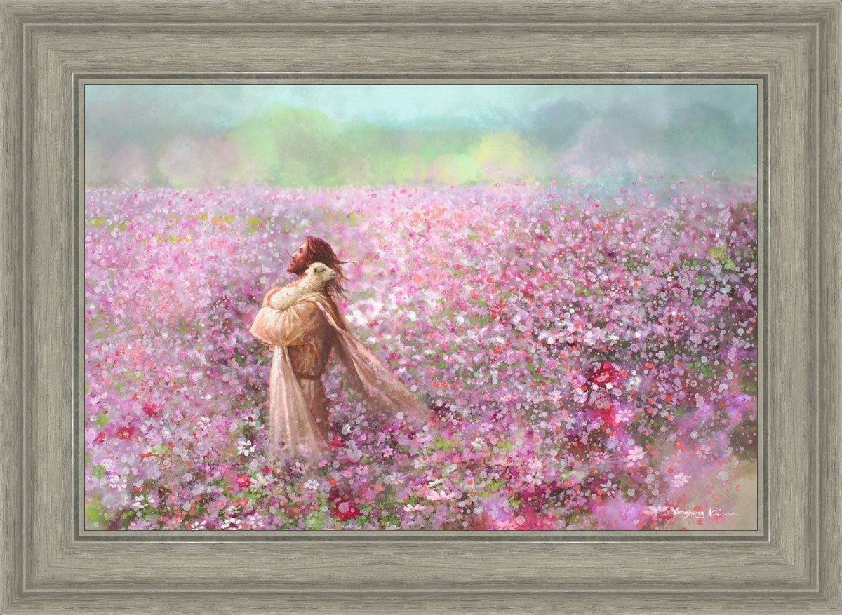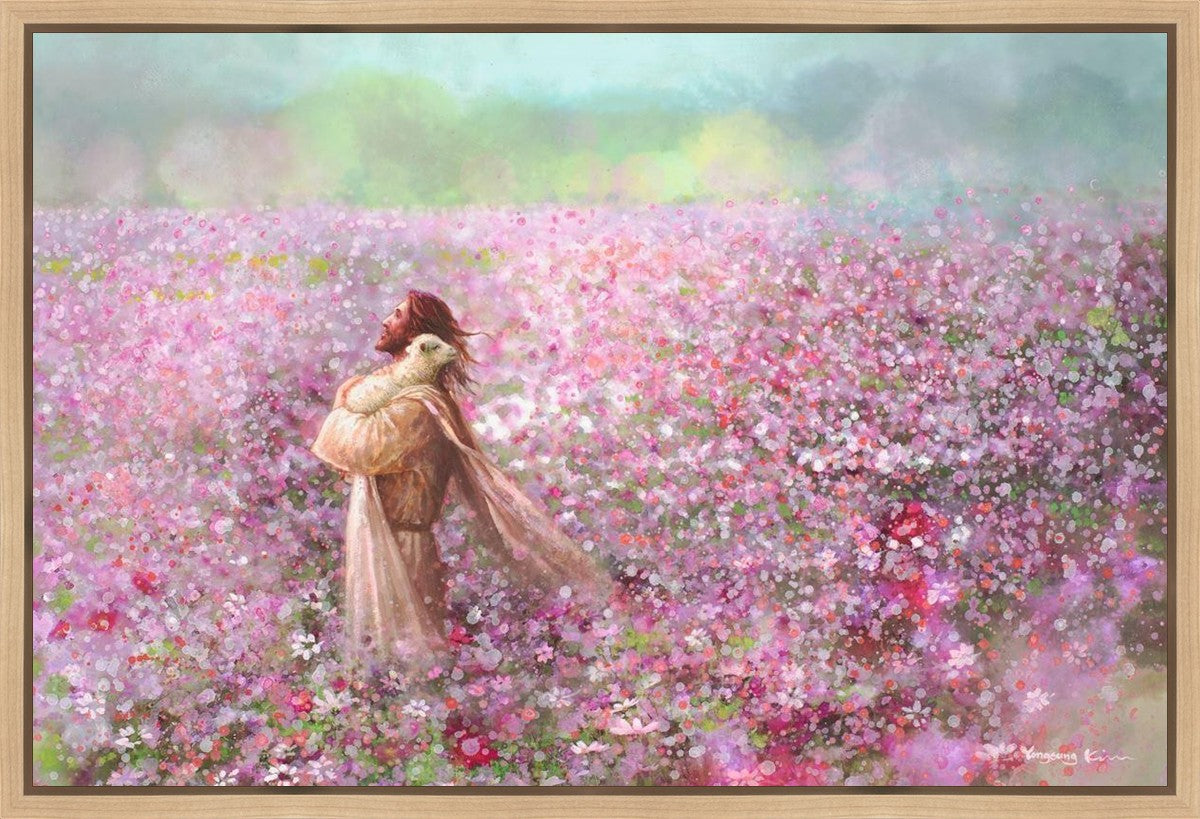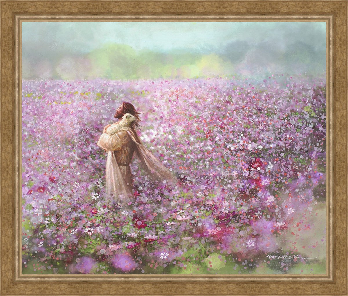The Calming Embrace by Yongsung Kim is a painting depicts Jesus Christ holding a lost lamb in a field of pink and purple flowers. This painting by Yongsung Kim can help create calm in your own life and you imagine Christ embracing your personally.