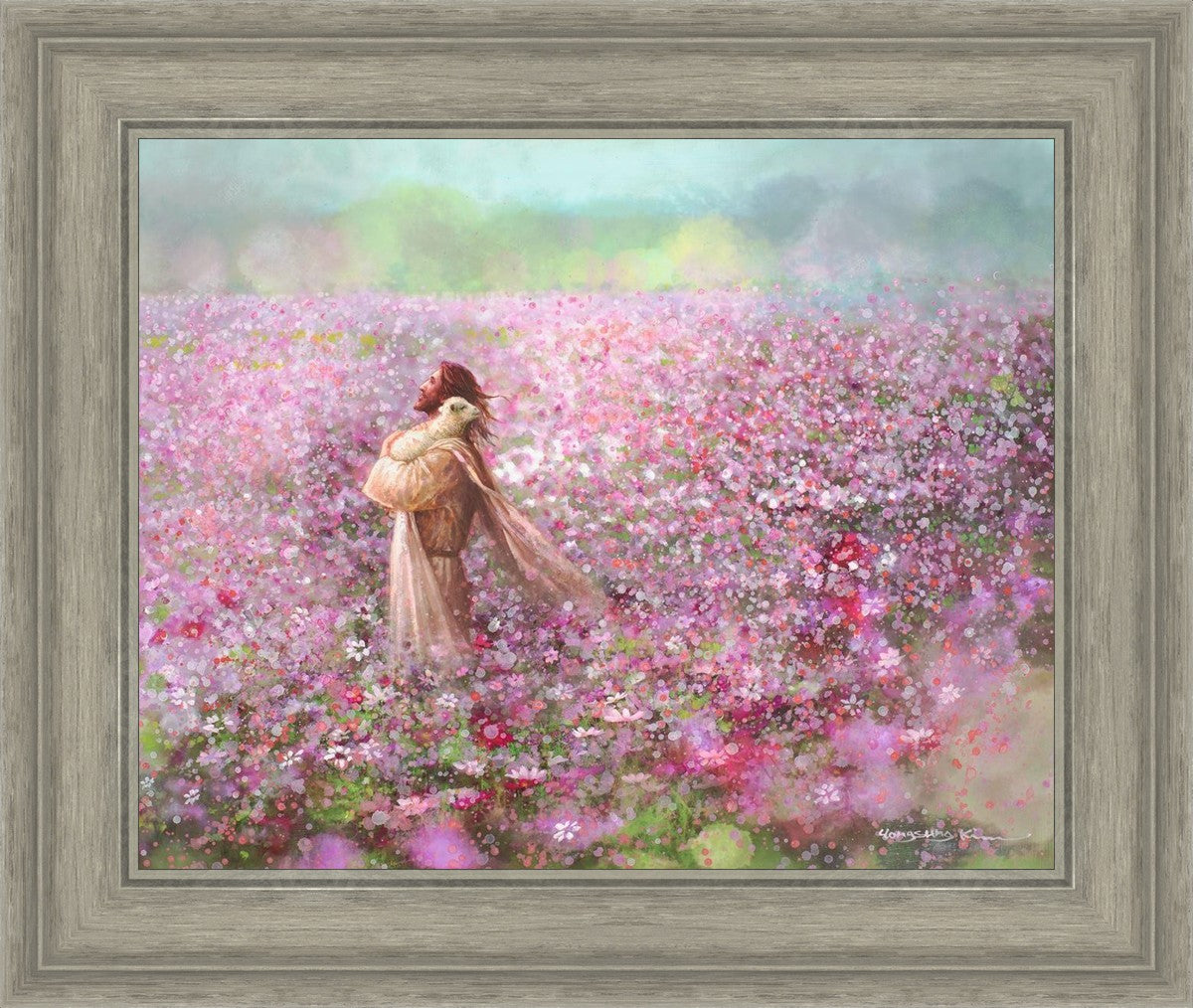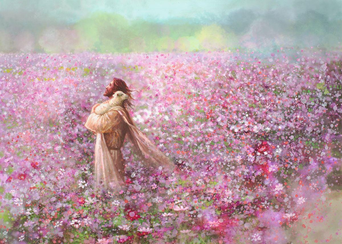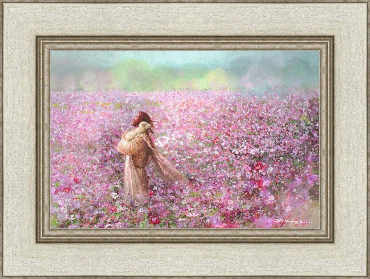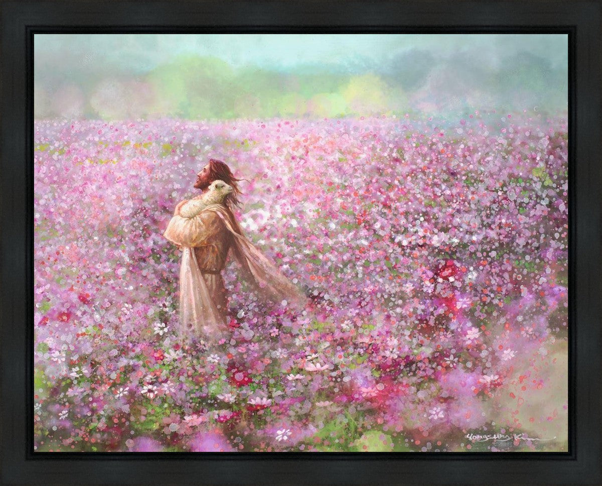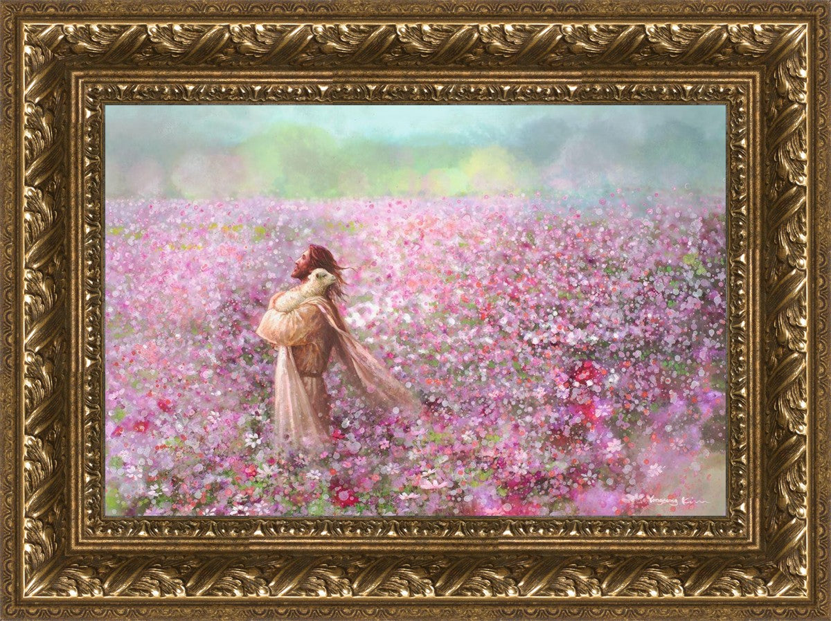 The Calming Embrace by Yongsung Kim is a painting depicts Jesus Christ holding a lost lamb in a field of pink and purple flowers. This painting by Yongsung Kim can help create calm in your own life and you imagine Christ embracing your personally.