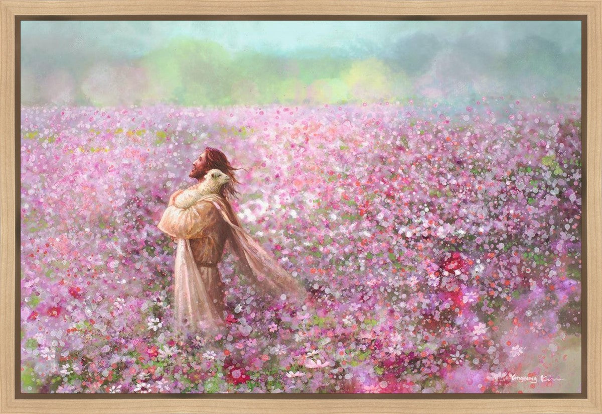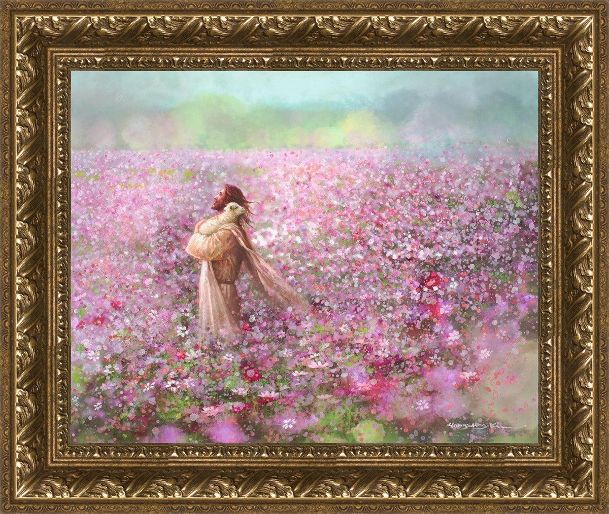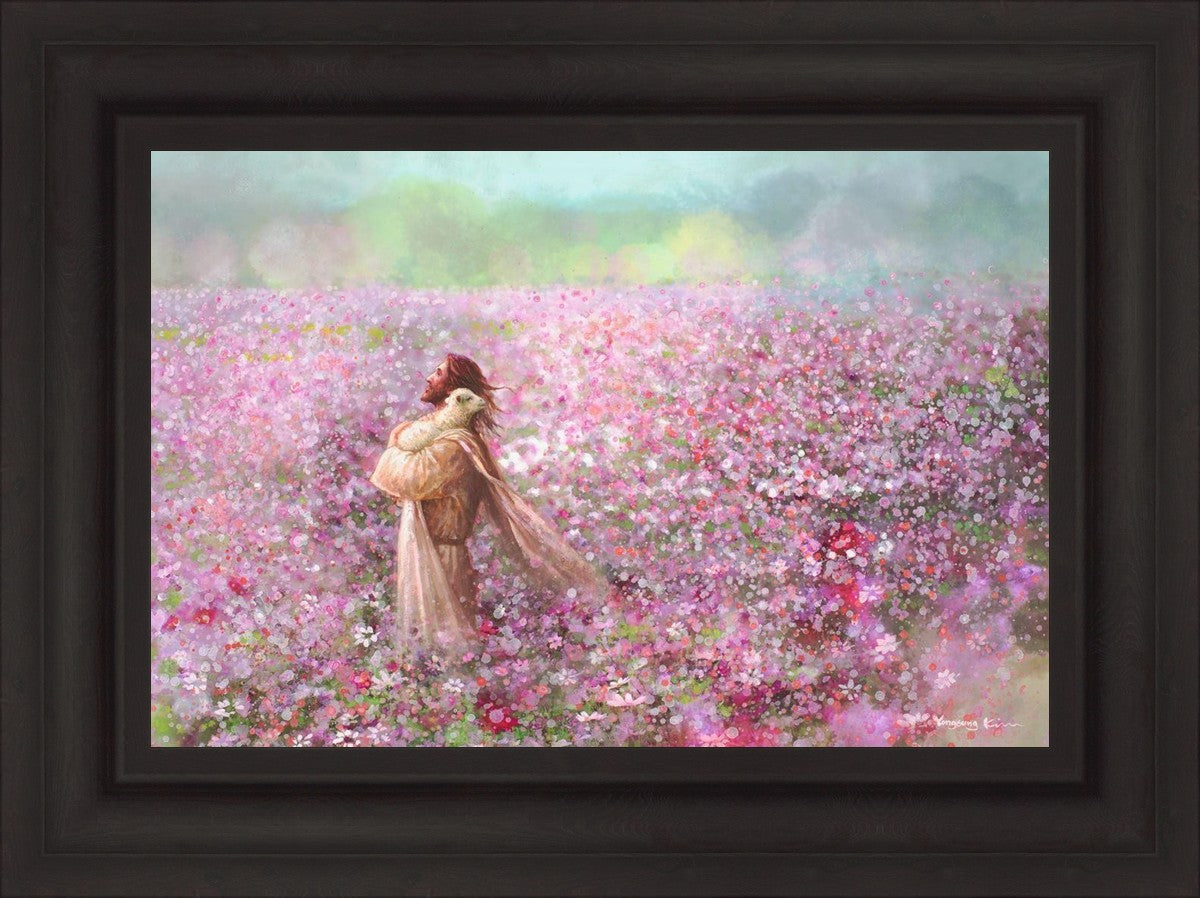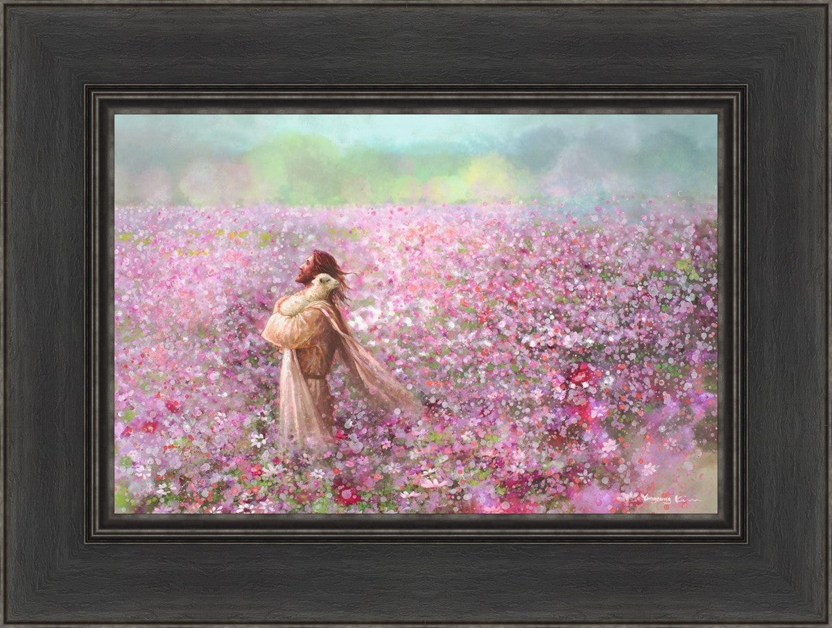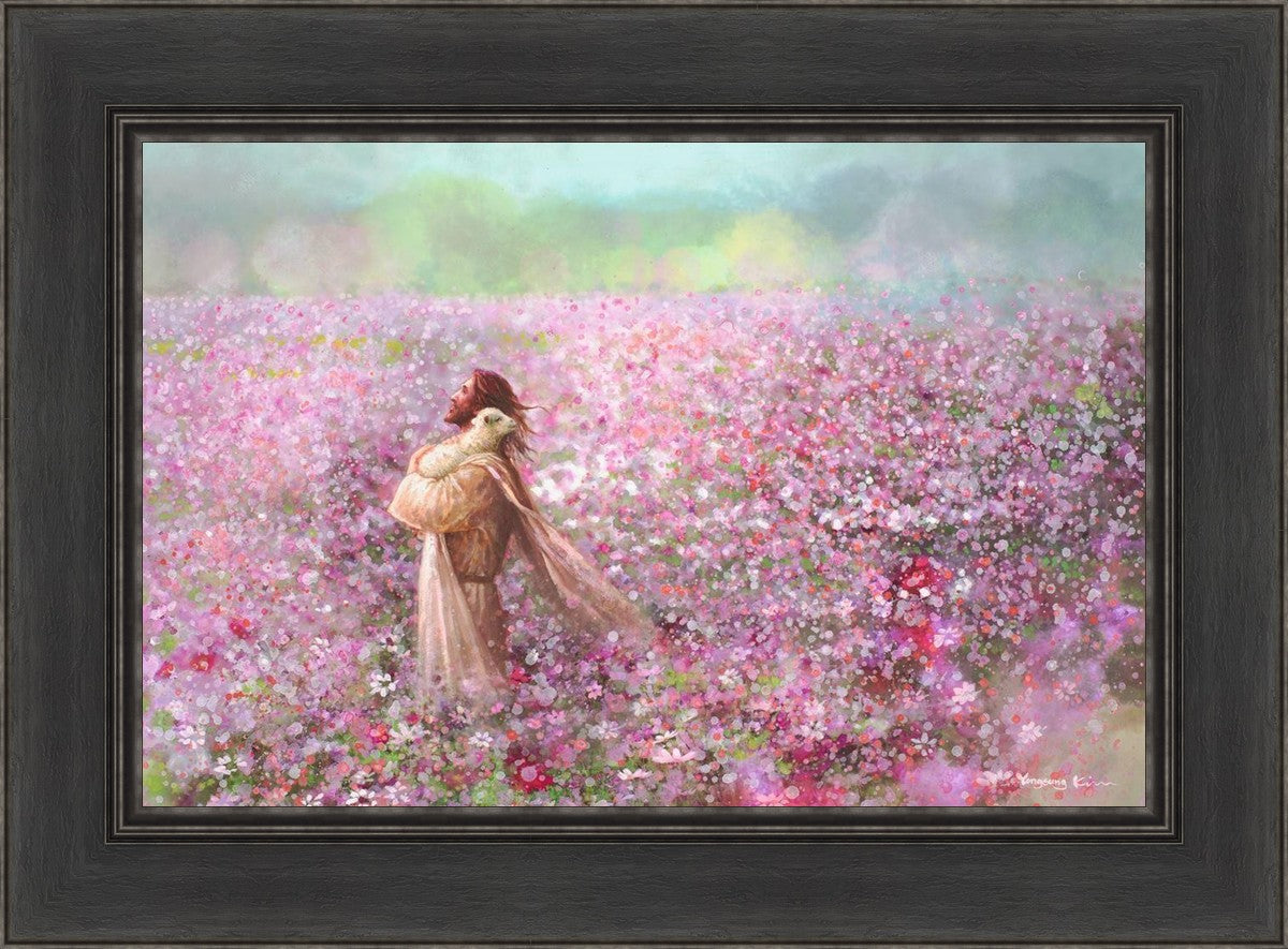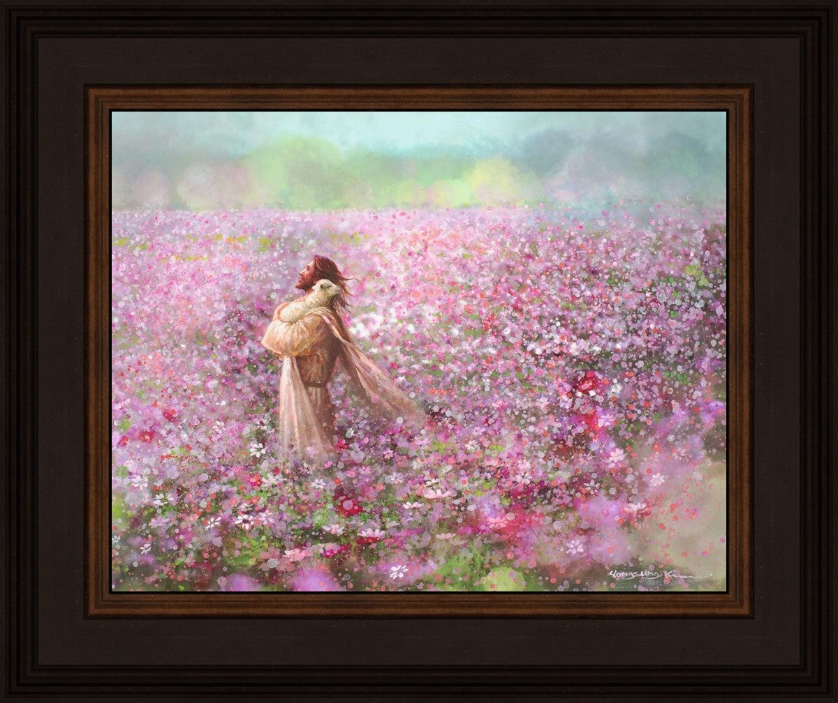 The Calming Embrace by Yongsung Kim is a painting depicts Jesus Christ holding a lost lamb in a field of pink and purple flowers. This painting by Yongsung Kim can help create calm in your own life and you imagine Christ embracing your personally.