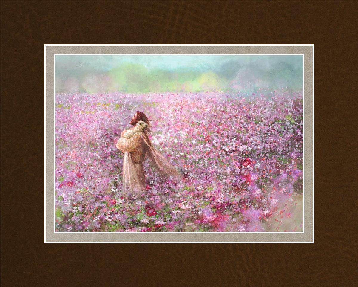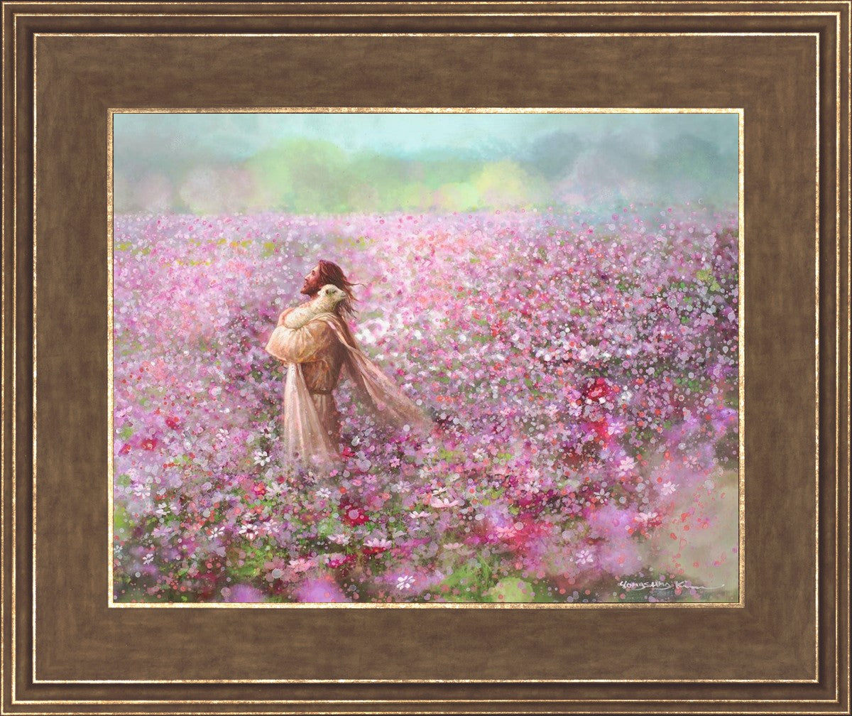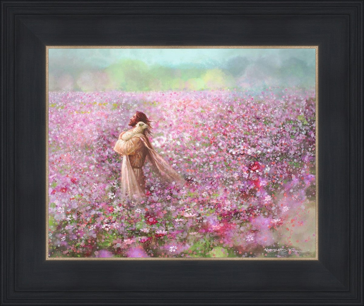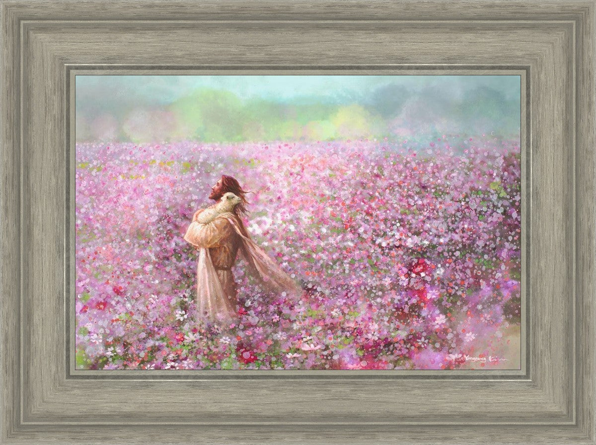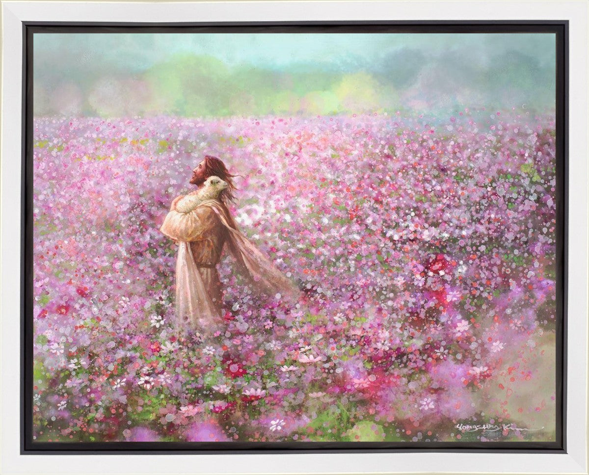 The Calming Embrace by Yongsung Kim is a painting depicts Jesus Christ holding a lost lamb in a field of pink and purple flowers. This painting by Yongsung Kim can help create calm in your own life and you imagine Christ embracing your personally.