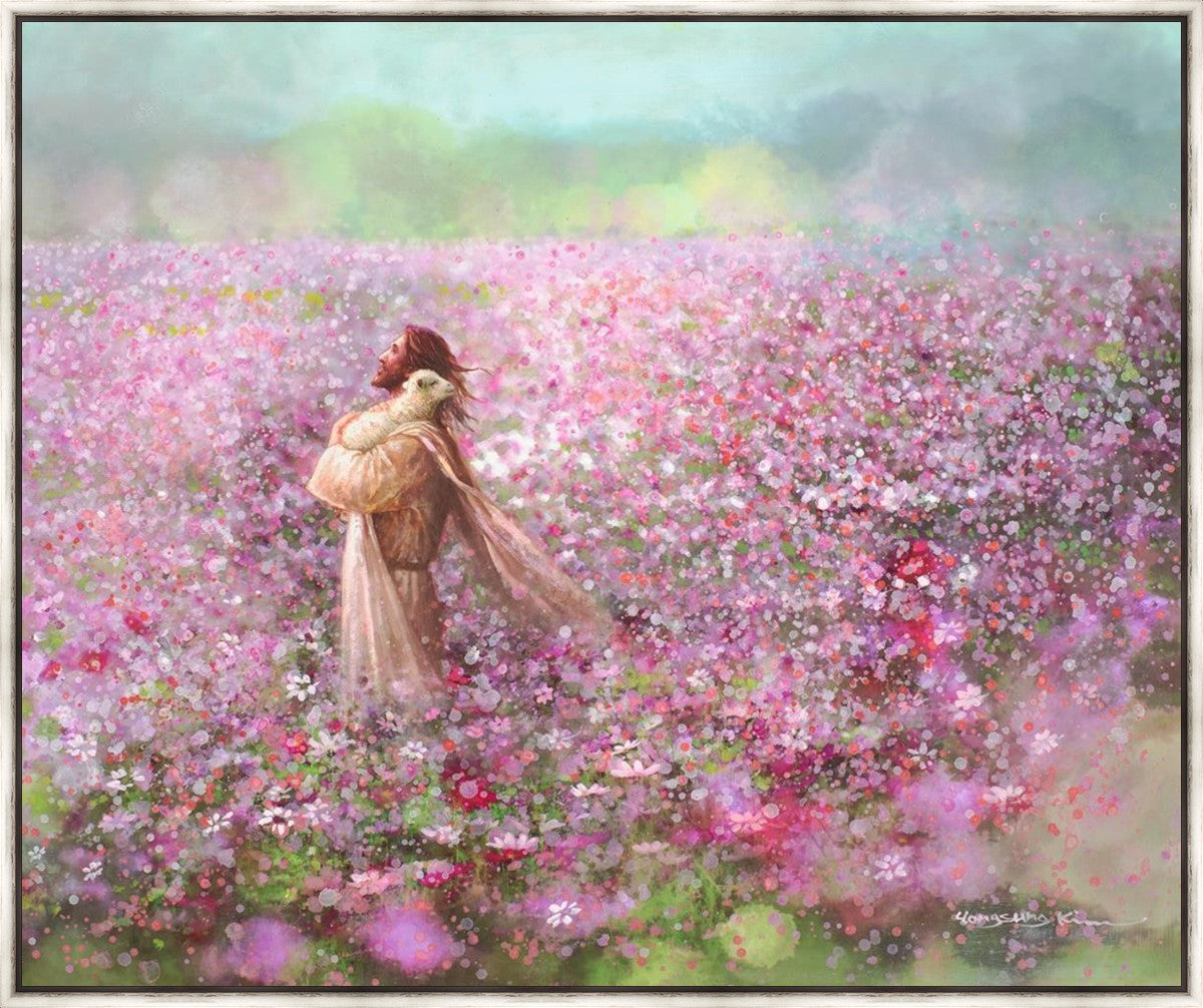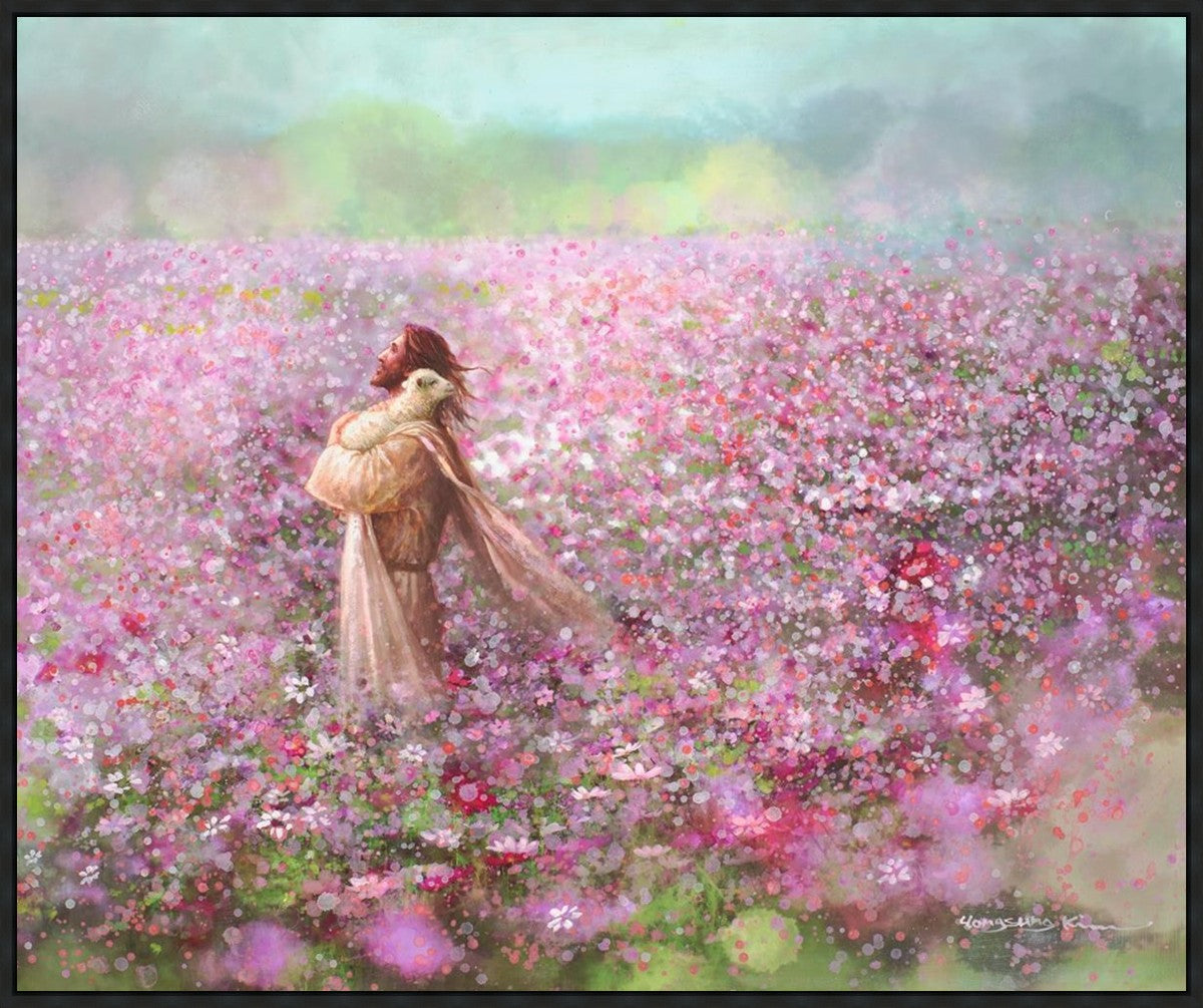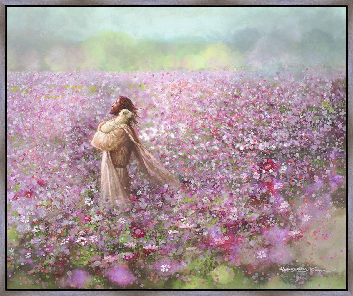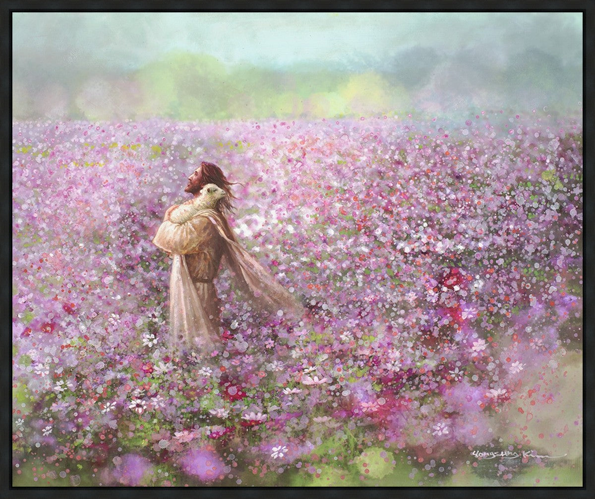 "Calming Embrace" by Yongsung Kim showcases Jesus Christ tenderly holding a lost lamb amidst a serene field of pink and purple flowers. This captivating artwork from Yongsung Kim evokes a calm, spiritual solace and reassurance, resonating with viewers seeking comfort and a deeper connection to their faith journey.