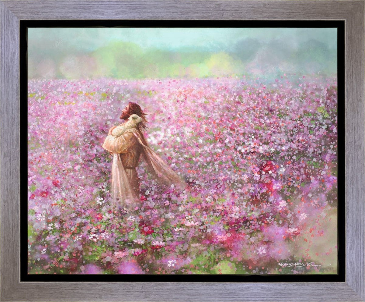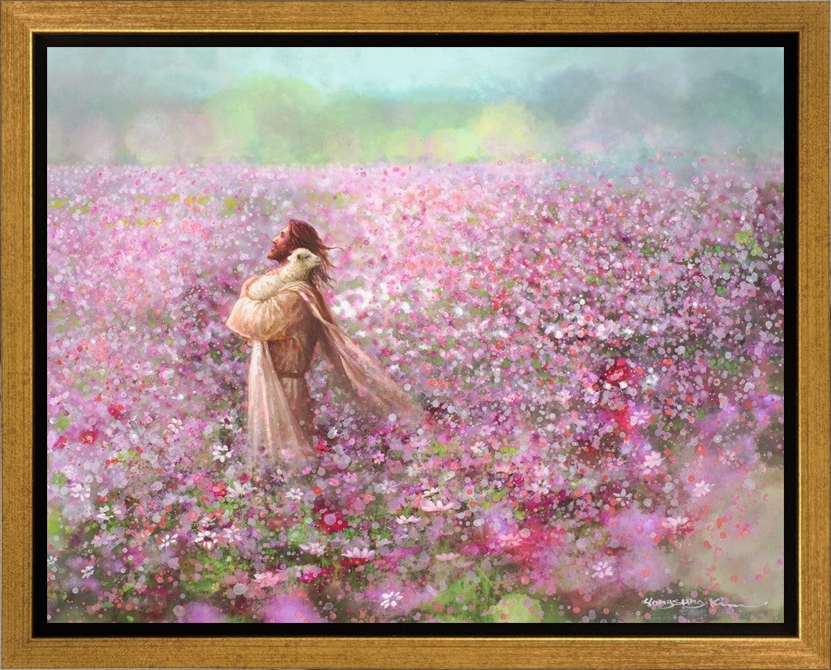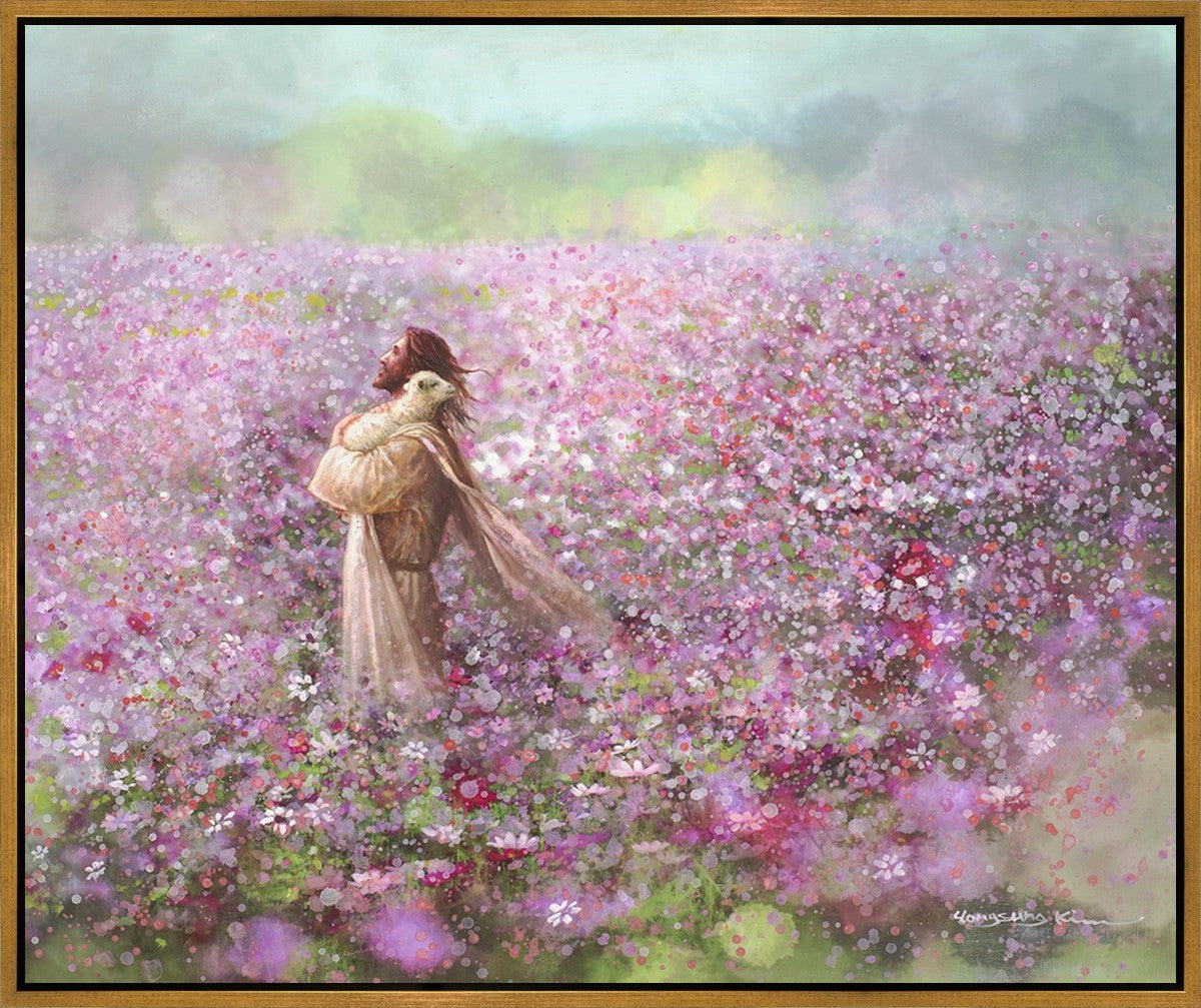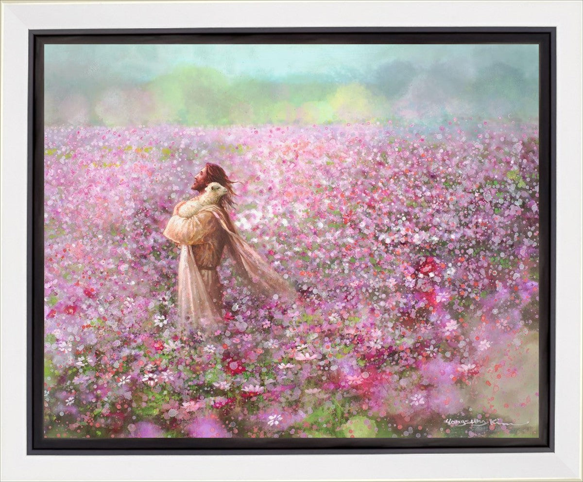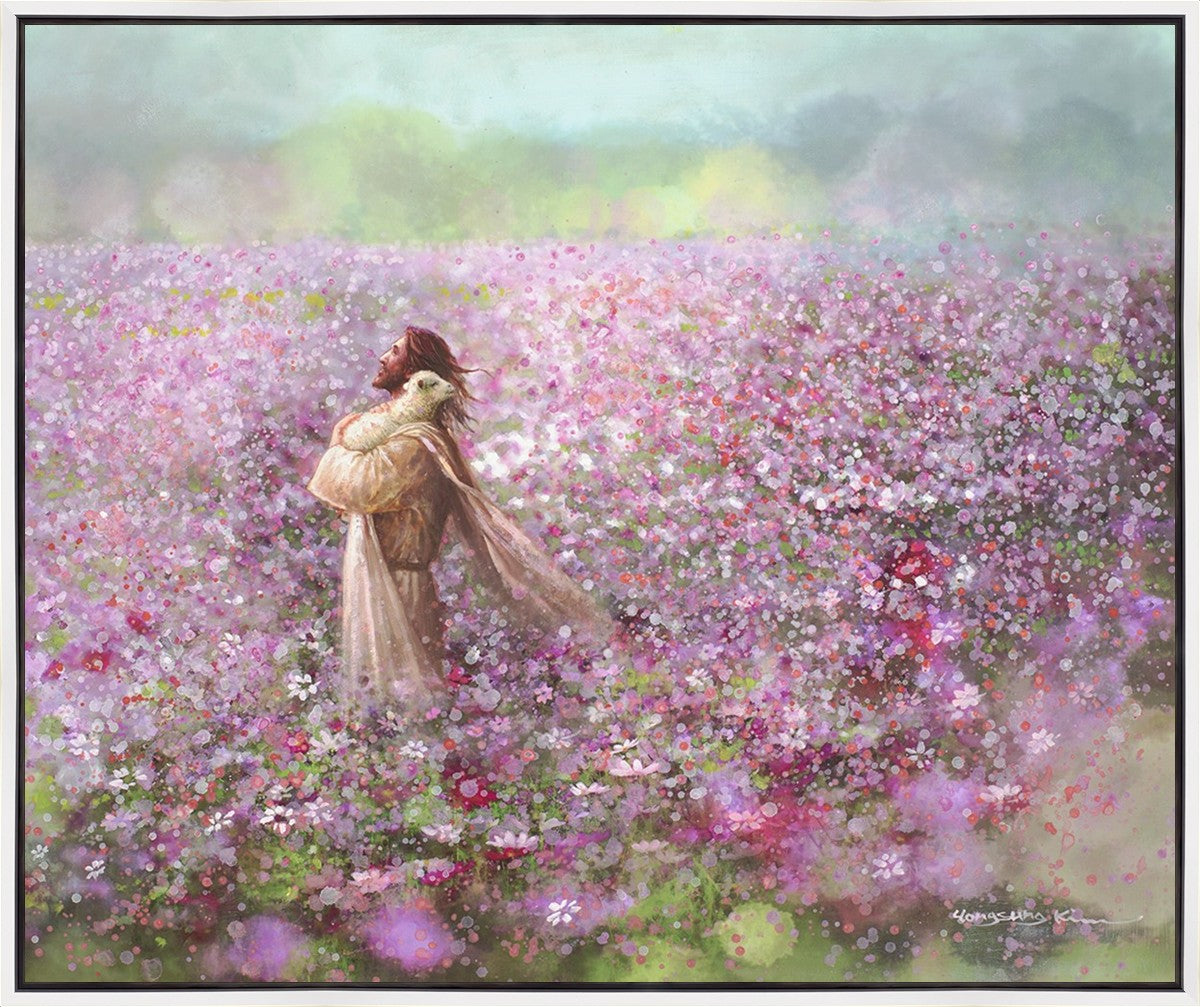 "Calming Embrace" by Yongsung Kim showcases Jesus Christ tenderly holding a lost lamb amidst a serene field of pink and purple flowers. This captivating artwork from Yongsung Kim evokes a calm, spiritual solace and reassurance, resonating with viewers seeking comfort and a deeper connection to their faith journey.