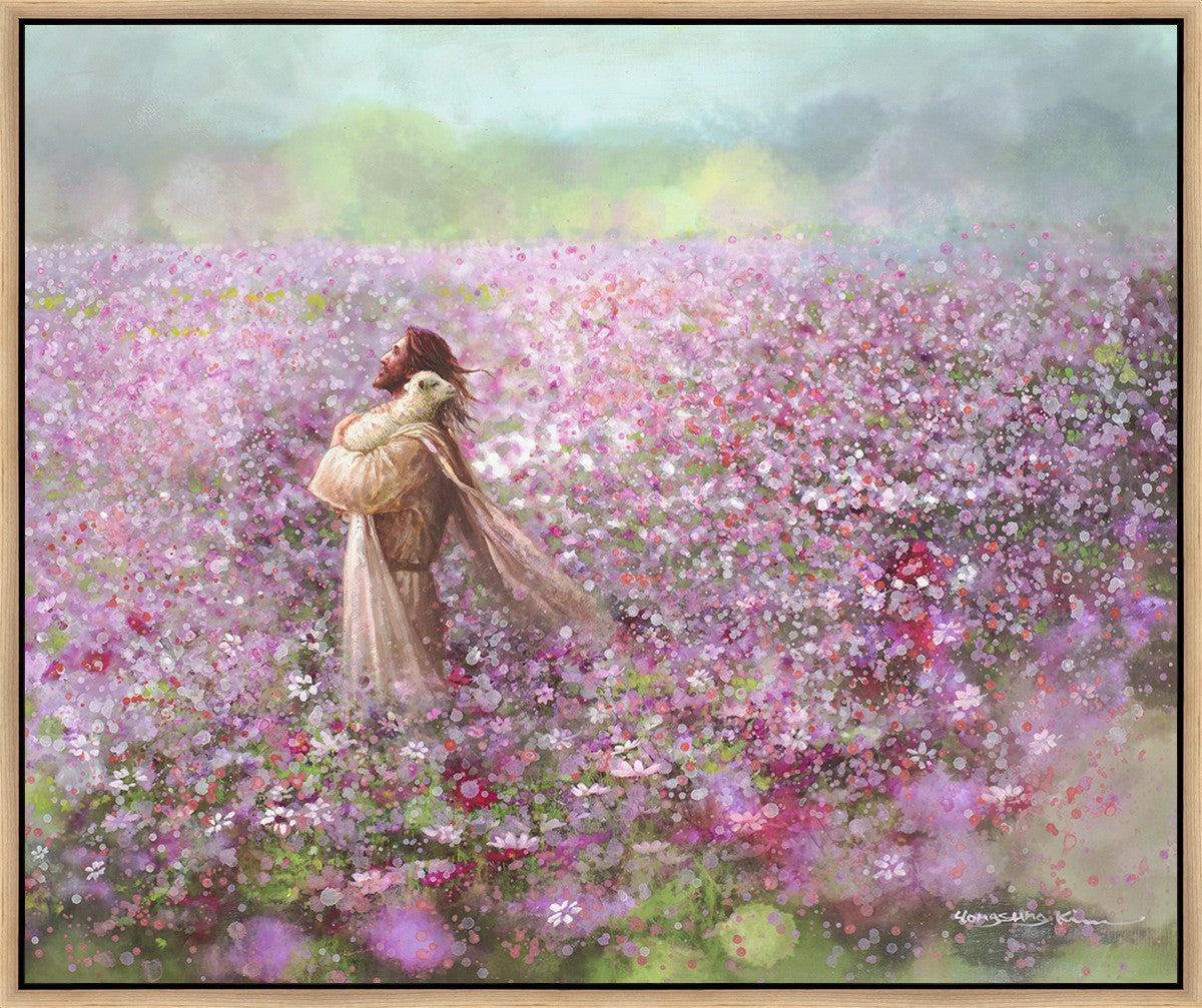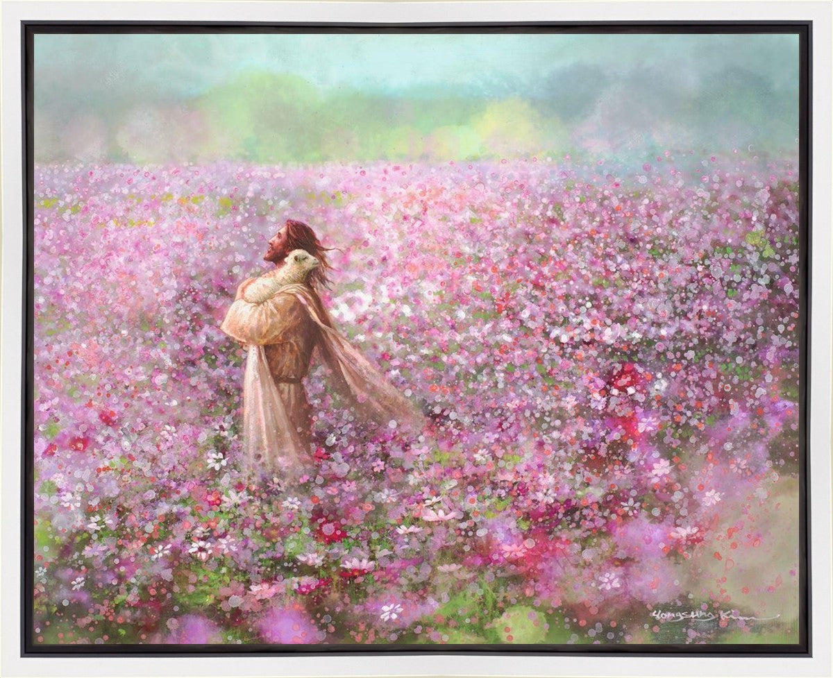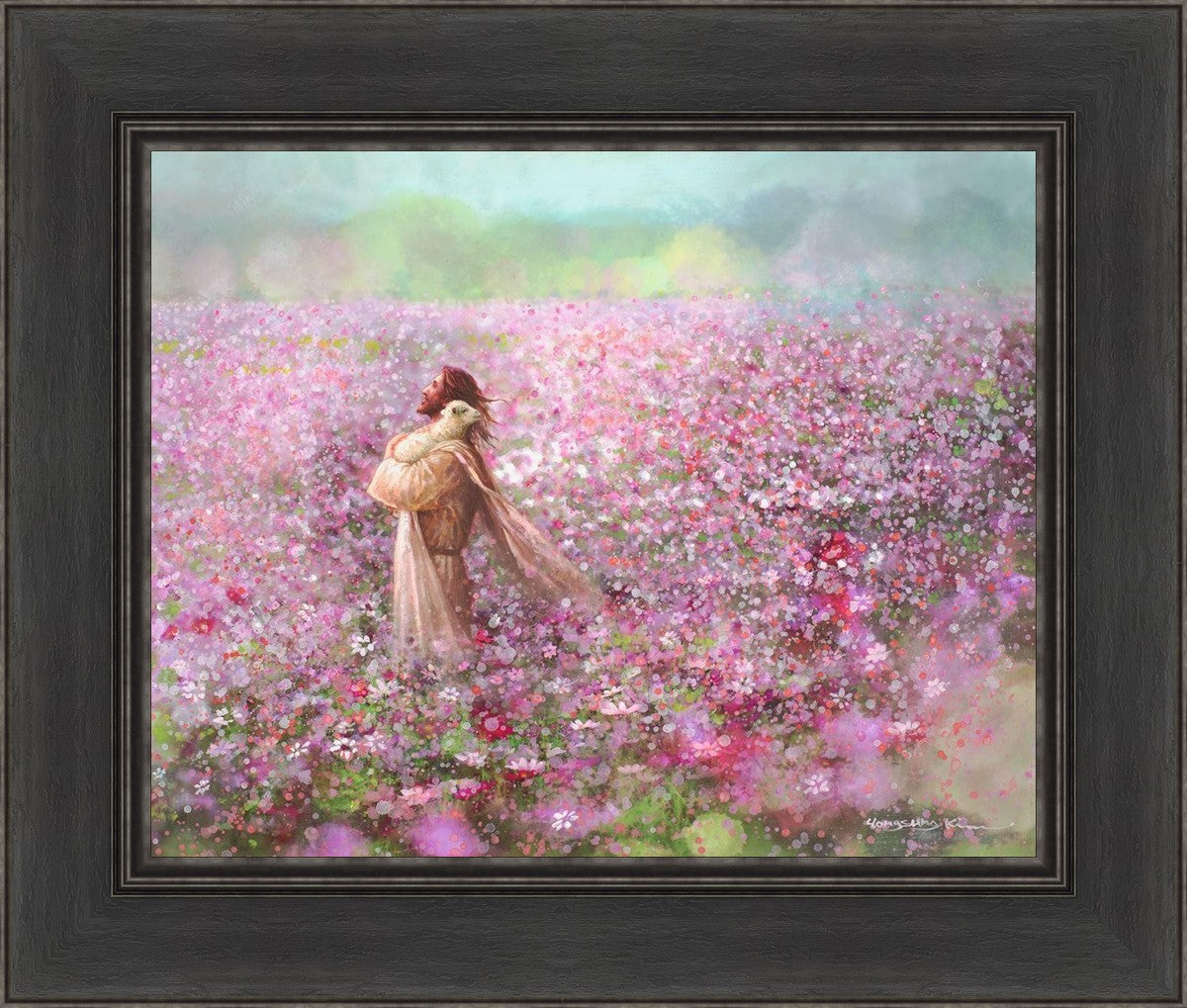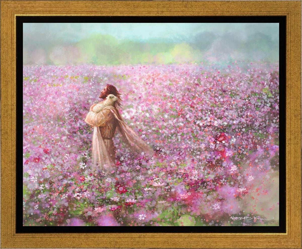 "Calming Embrace" by Yongsung Kim showcases Jesus Christ tenderly holding a lost lamb amidst a serene field of pink and purple flowers. This captivating artwork from Yongsung Kim evokes a calm, spiritual solace and reassurance, resonating with viewers seeking comfort and a deeper connection to their faith journey.
