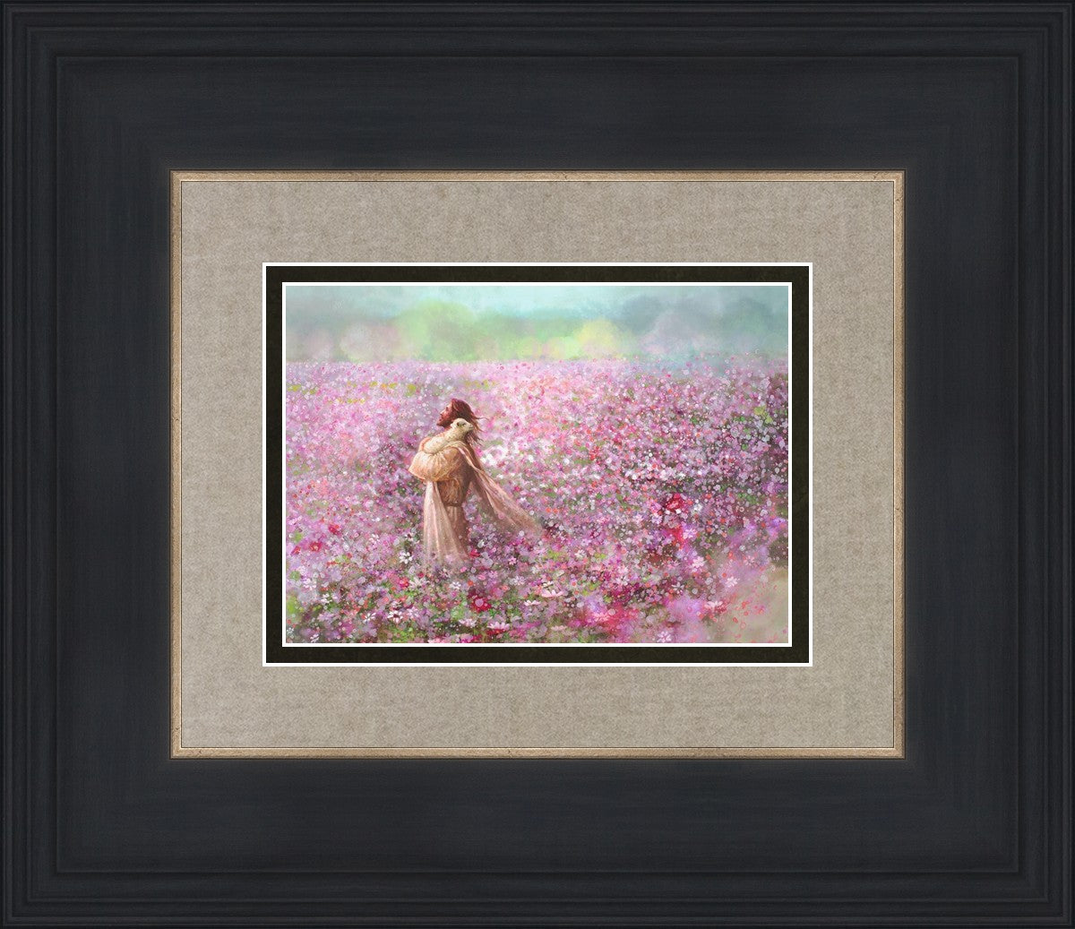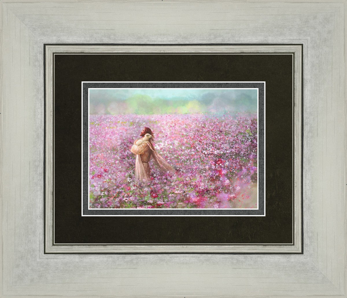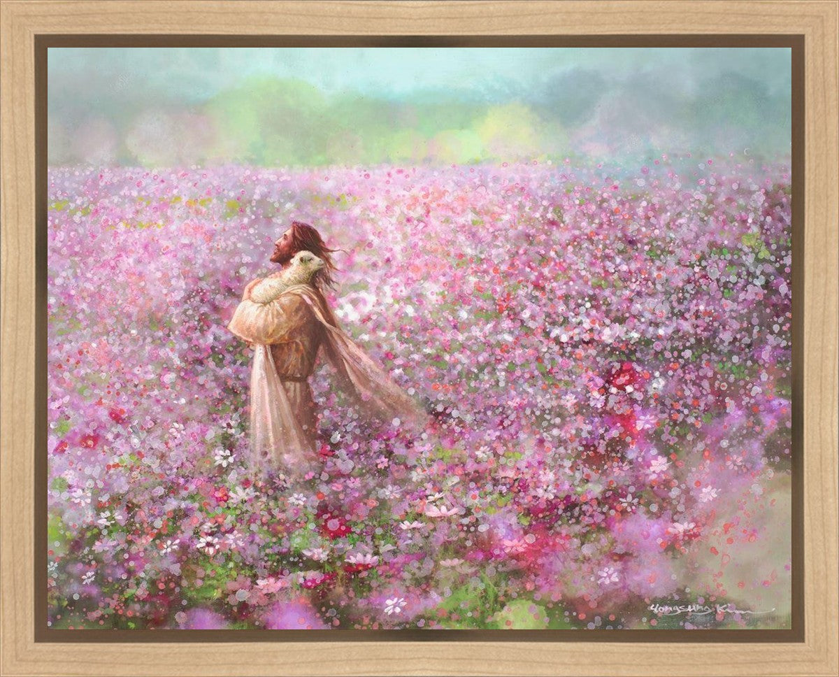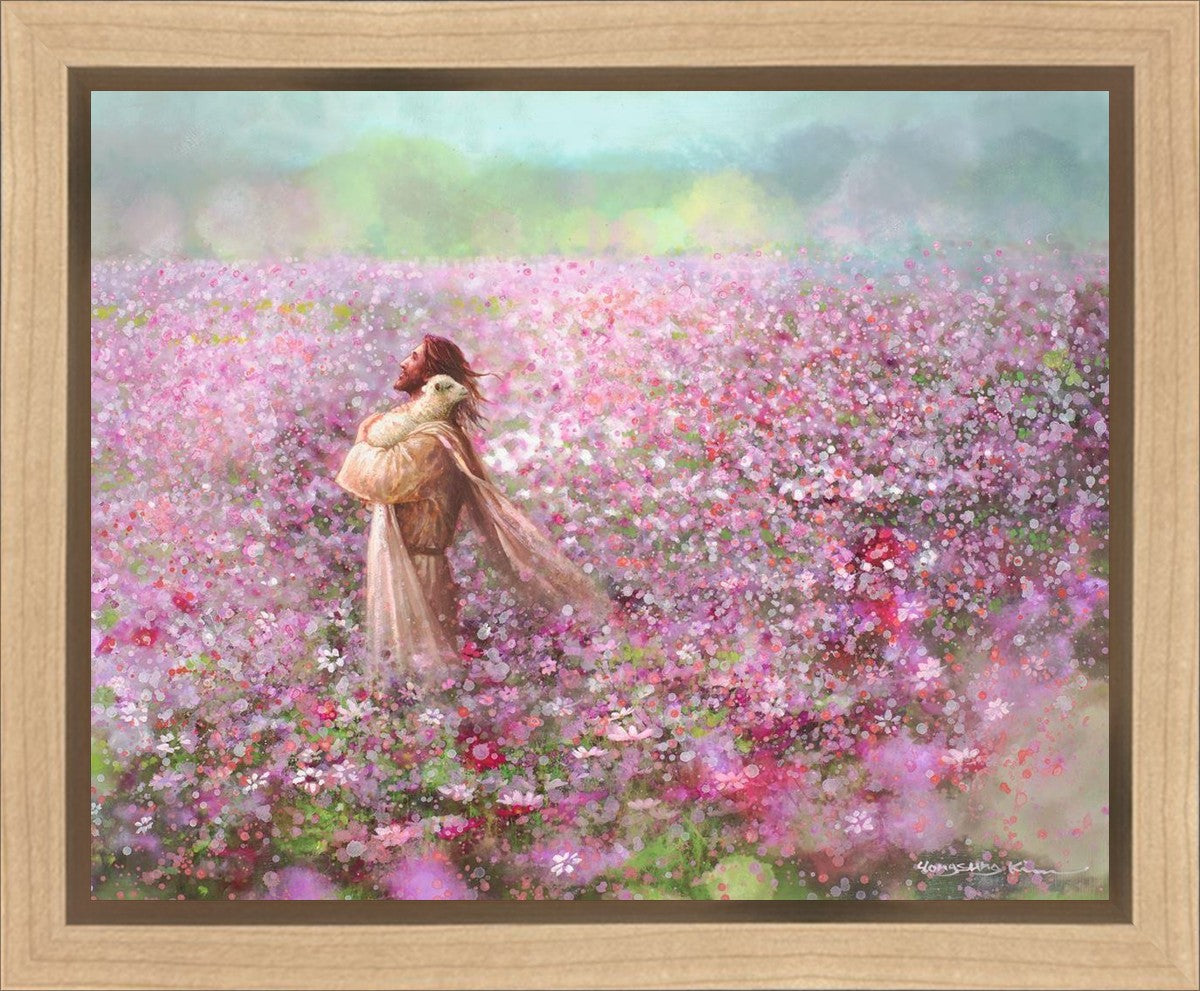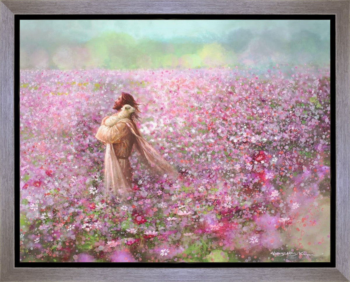 "Calming Embrace" by Yongsung Kim showcases Jesus Christ tenderly holding a lost lamb amidst a serene field of pink and purple flowers. This captivating artwork from Yongsung Kim evokes a calm, spiritual solace and reassurance, resonating with viewers seeking comfort and a deeper connection to their faith journey.