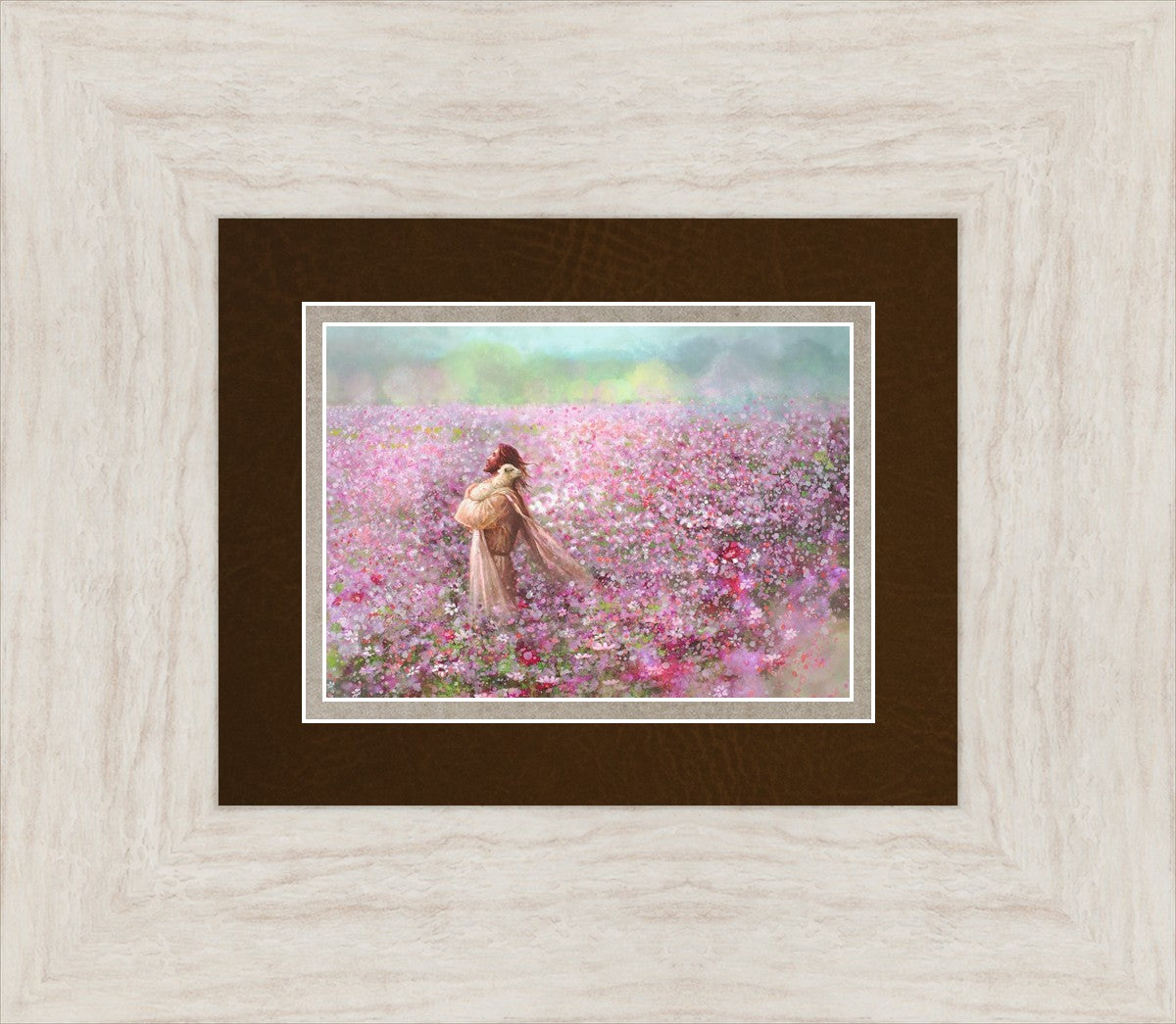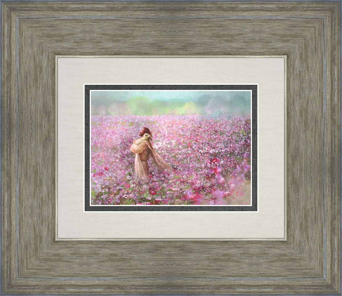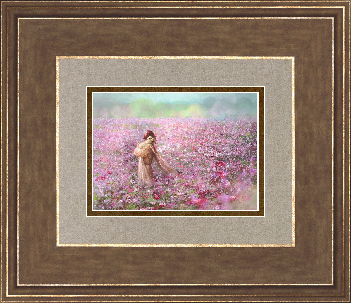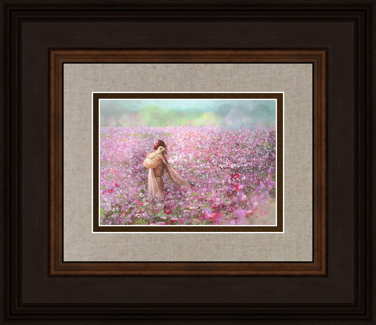 "Calming Embrace" by Yongsung Kim showcases Jesus Christ tenderly holding a lost lamb amidst a serene field of pink and purple flowers. This captivating artwork from Yongsung Kim evokes a calm, spiritual solace and reassurance, resonating with viewers seeking comfort and a deeper connection to their faith journey.
