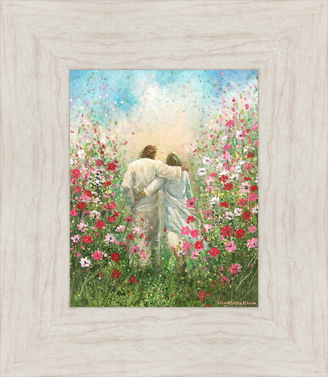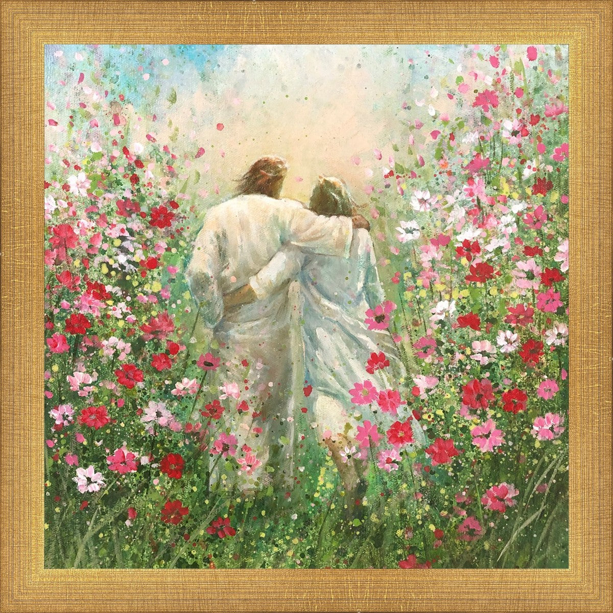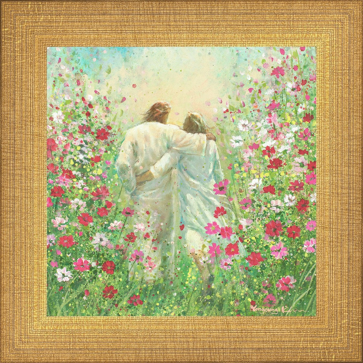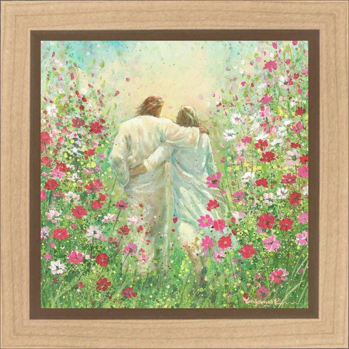 Divine Counselor by Yongsung Kim features Jesus Christ giving advice to a follower in white garments while walking arm in arm through a field of bright flowers