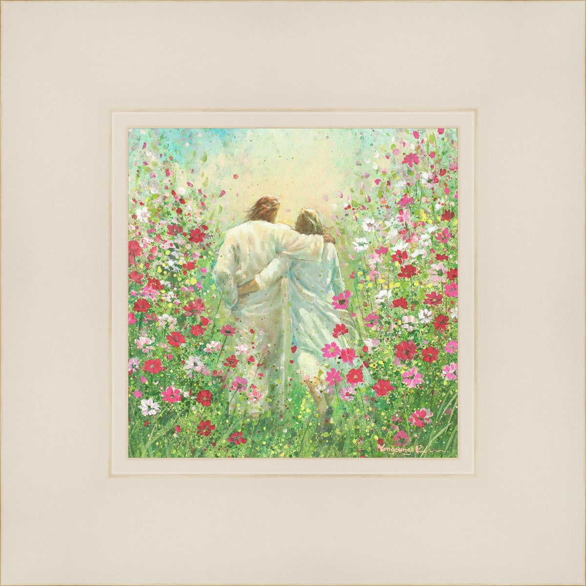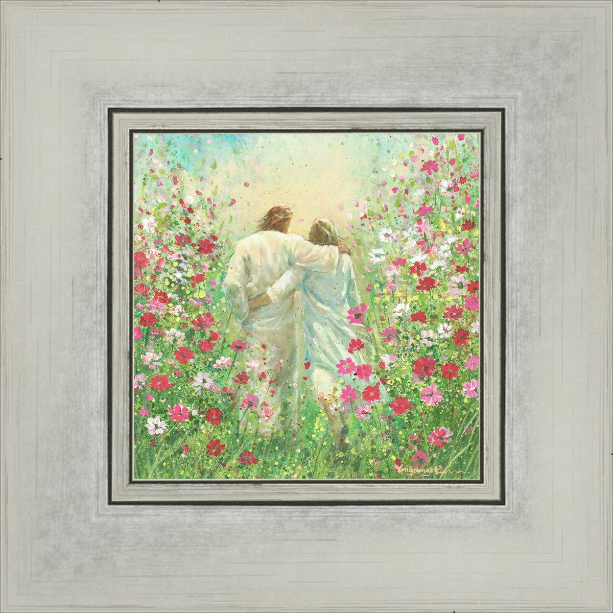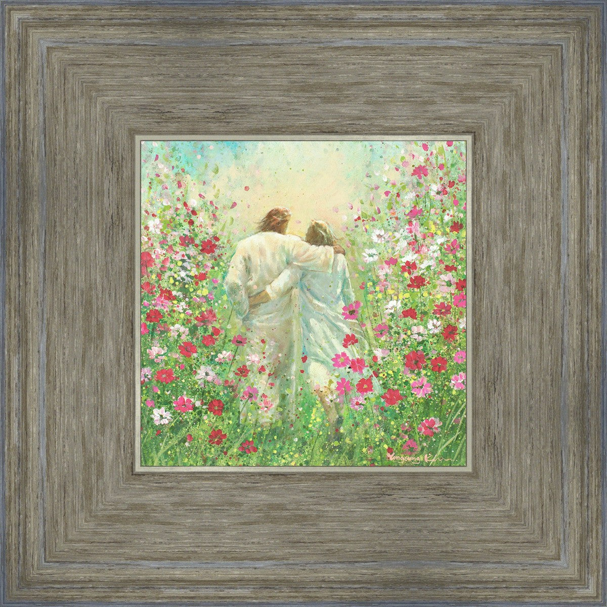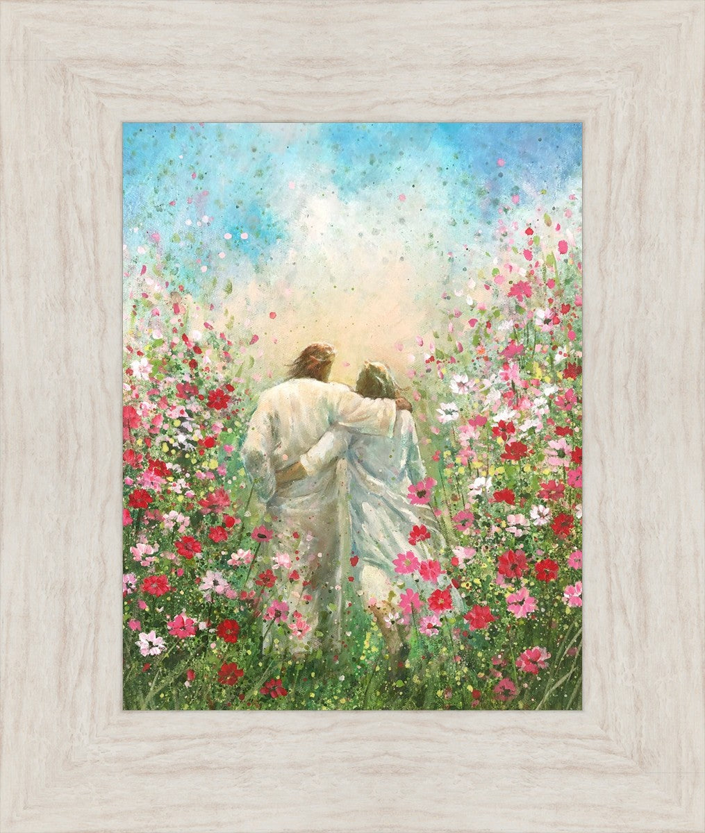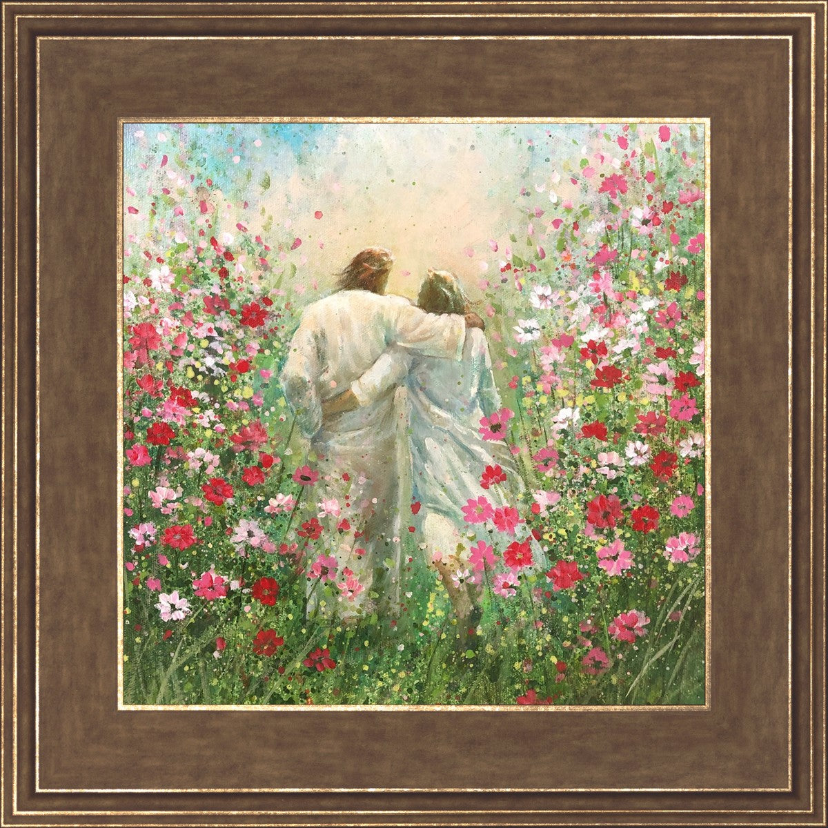 Divine Counselor by Yongsung Kim features Jesus Christ giving advice to a follower in white garments while walking arm in arm through a field of bright flowers