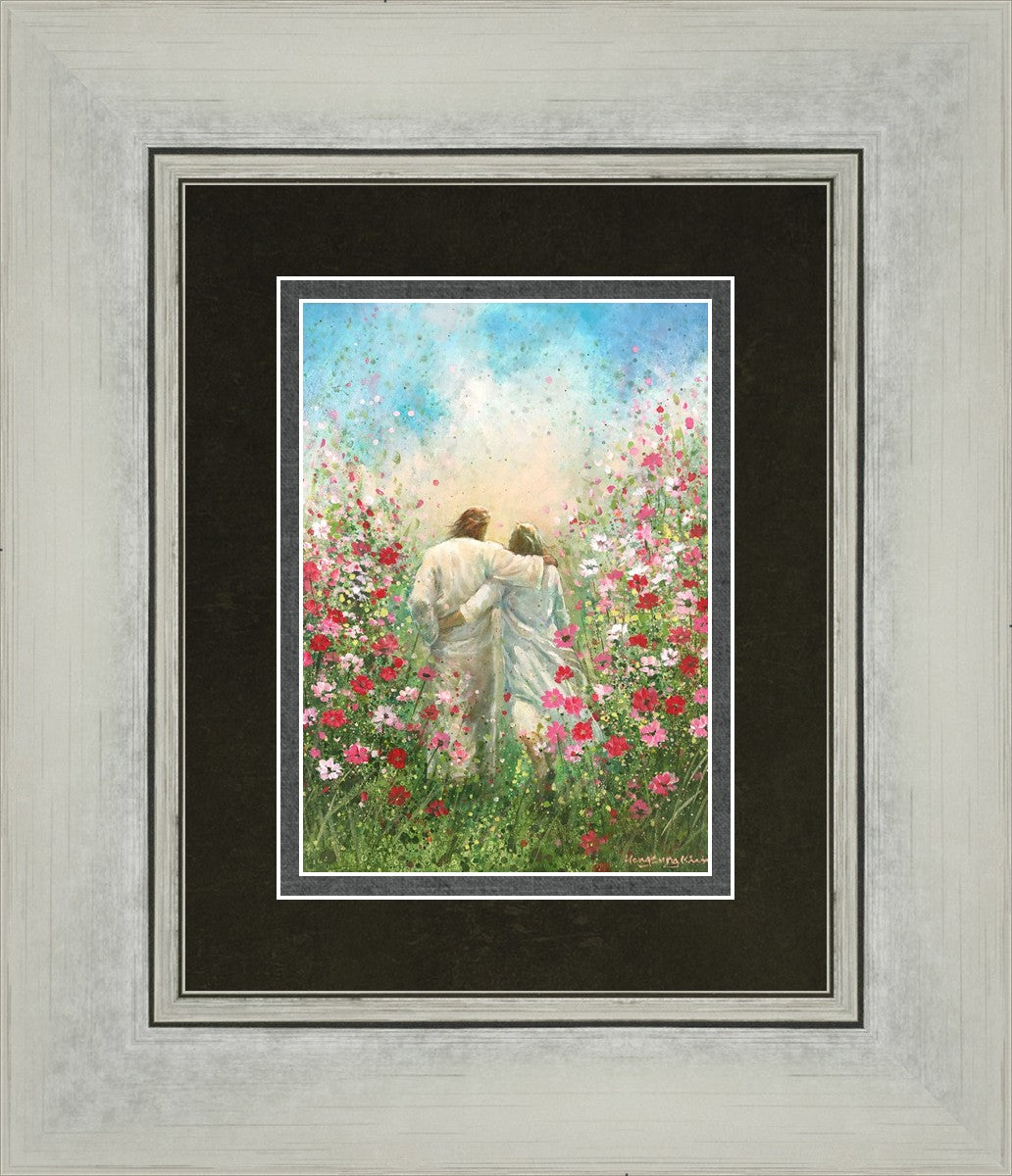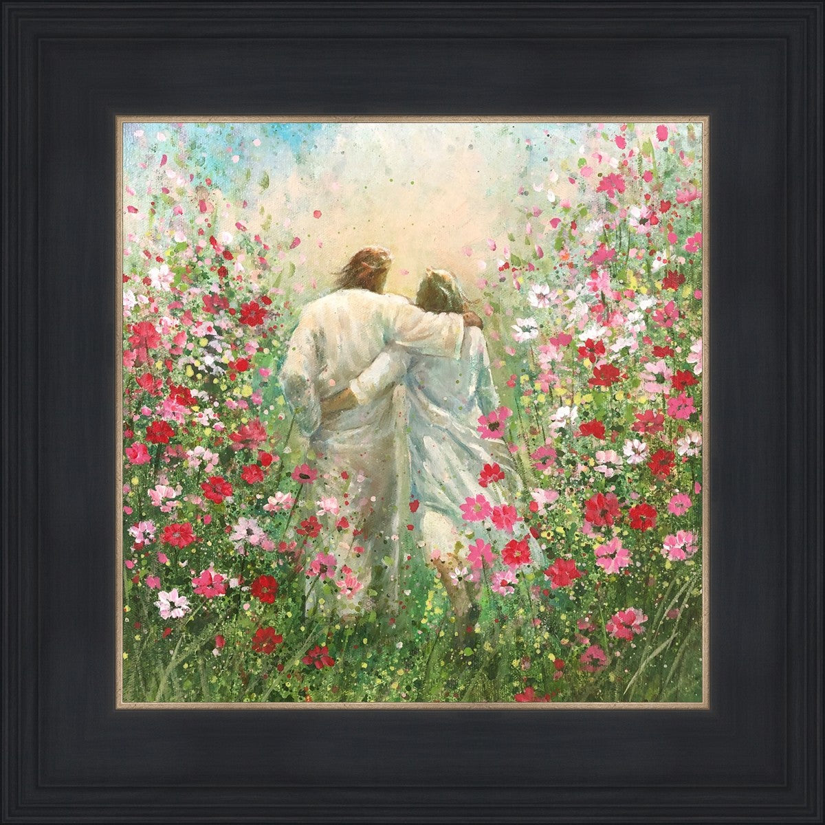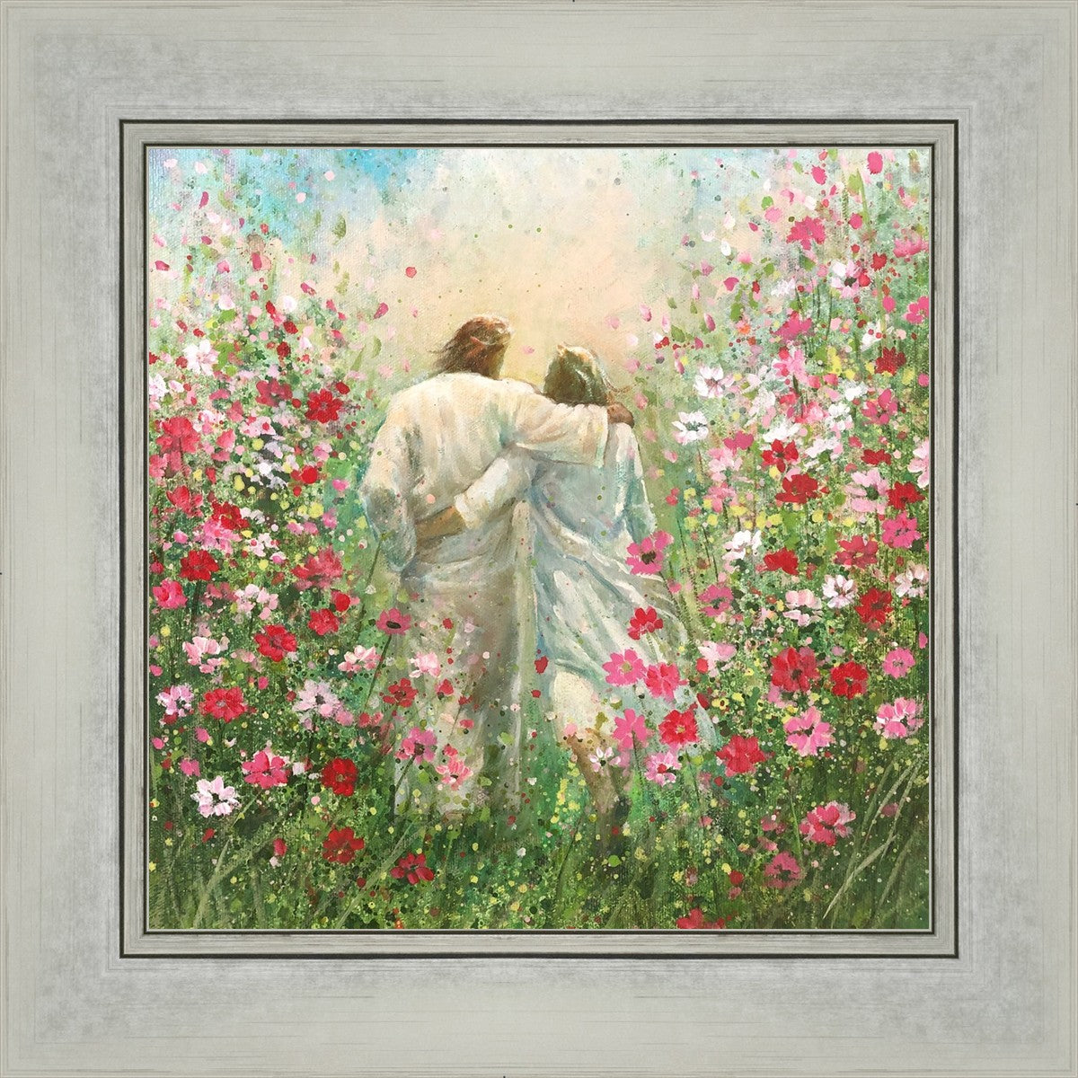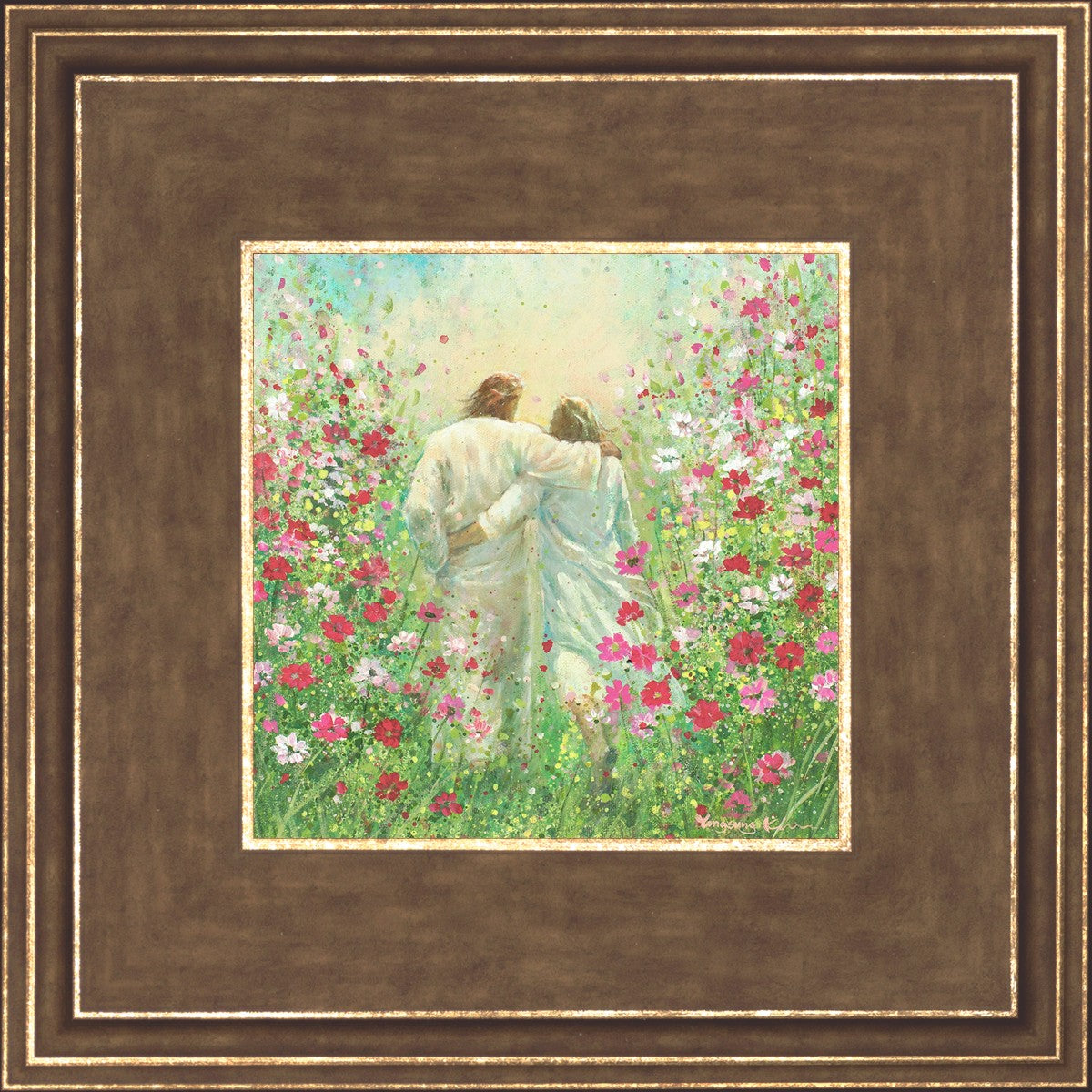 Divine Counselor by Yongsung Kim features Jesus Christ giving advice to a follower in white garments while walking arm in arm through a field of bright flowers
