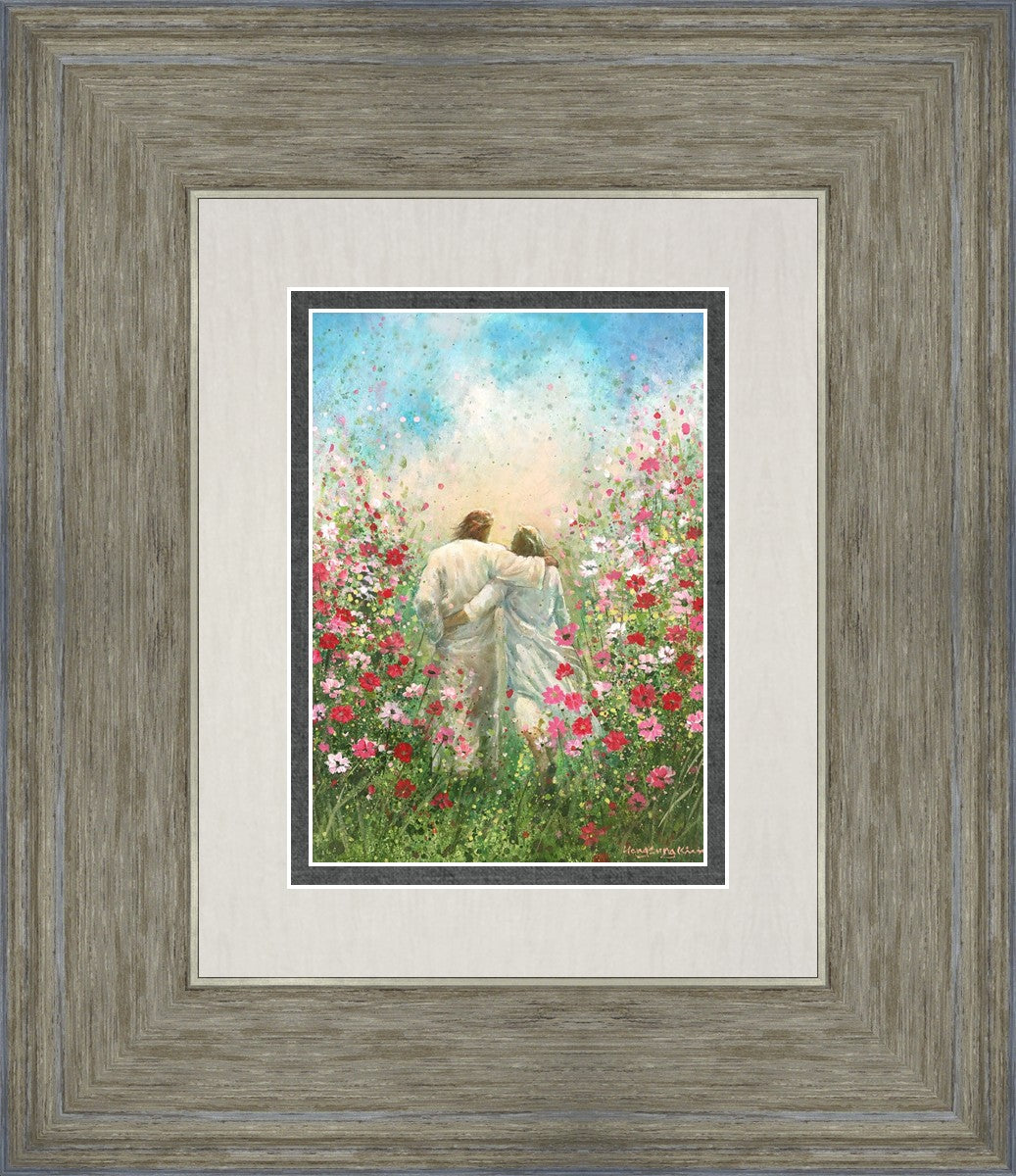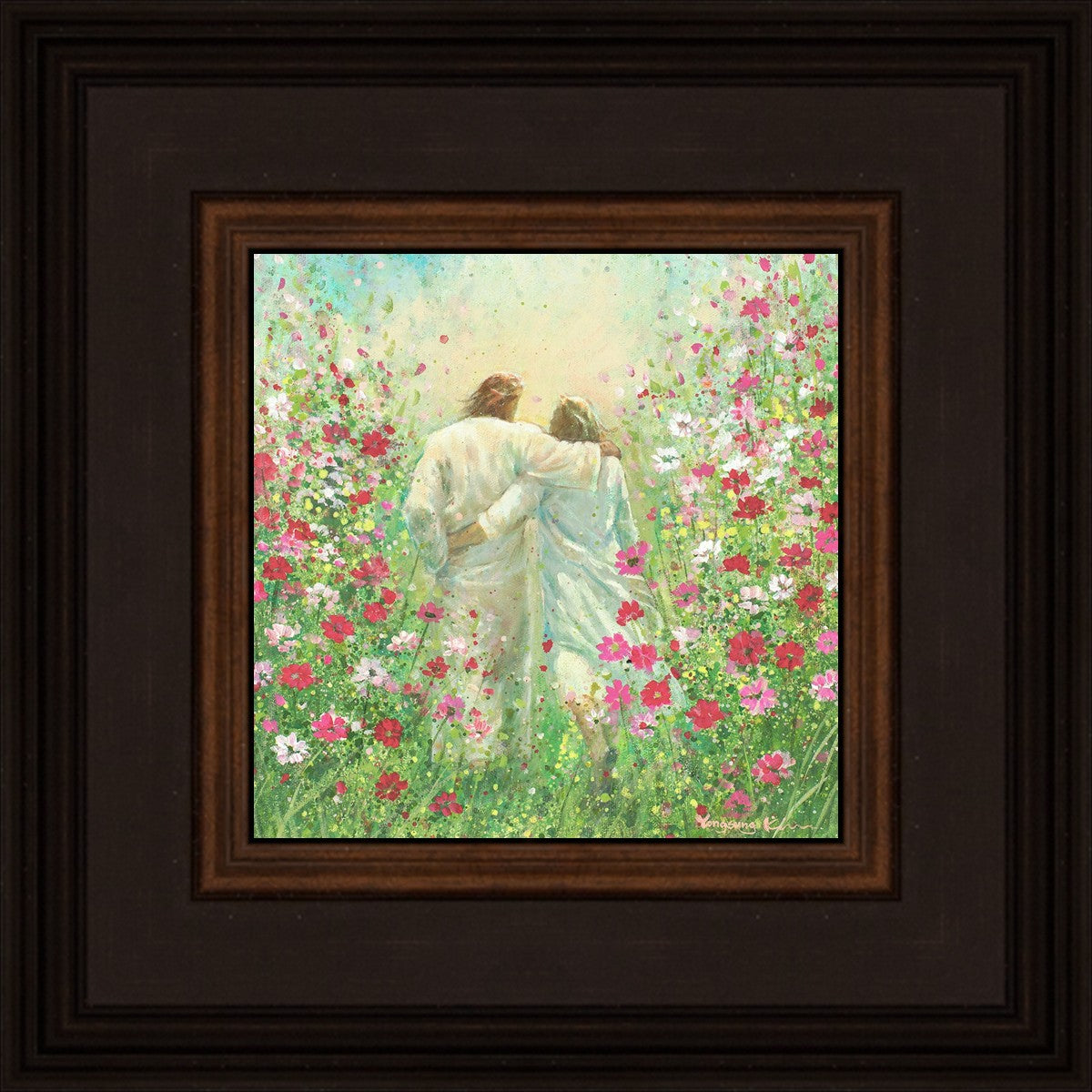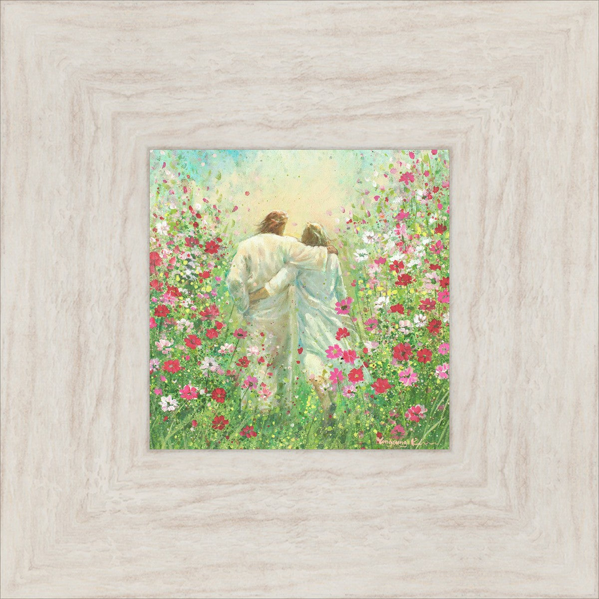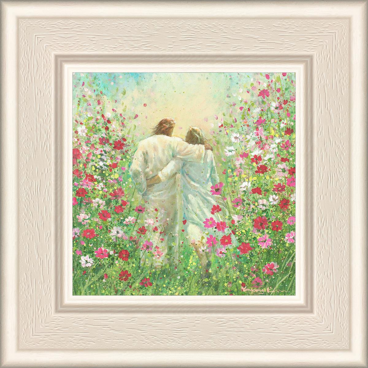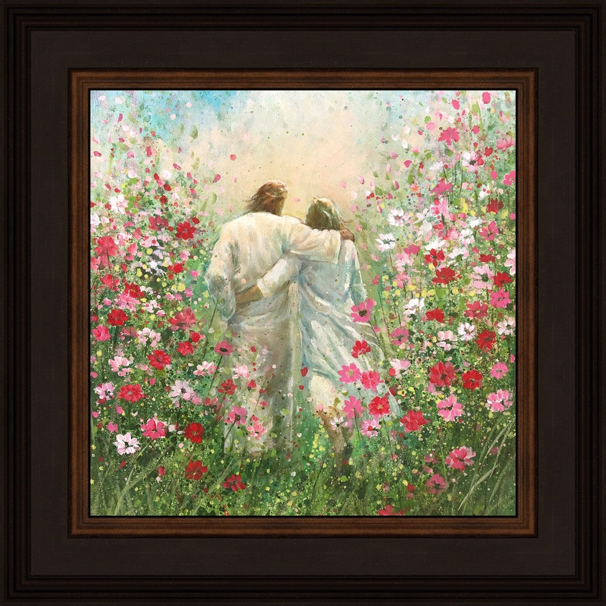 Divine Counselor by Yongsung Kim features Jesus Christ giving advice to a follower in white garments while walking arm in arm through a field of bright flowers
