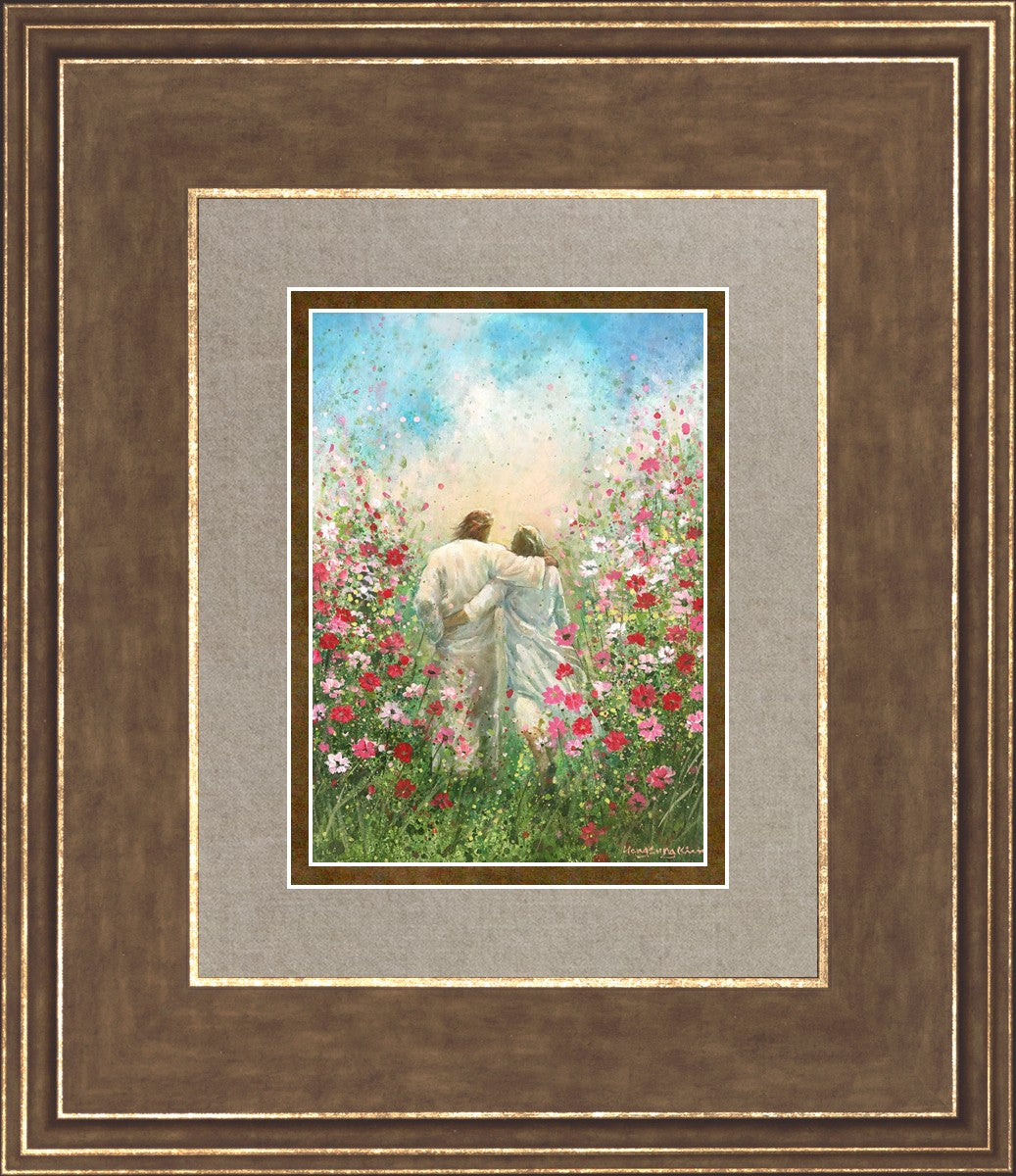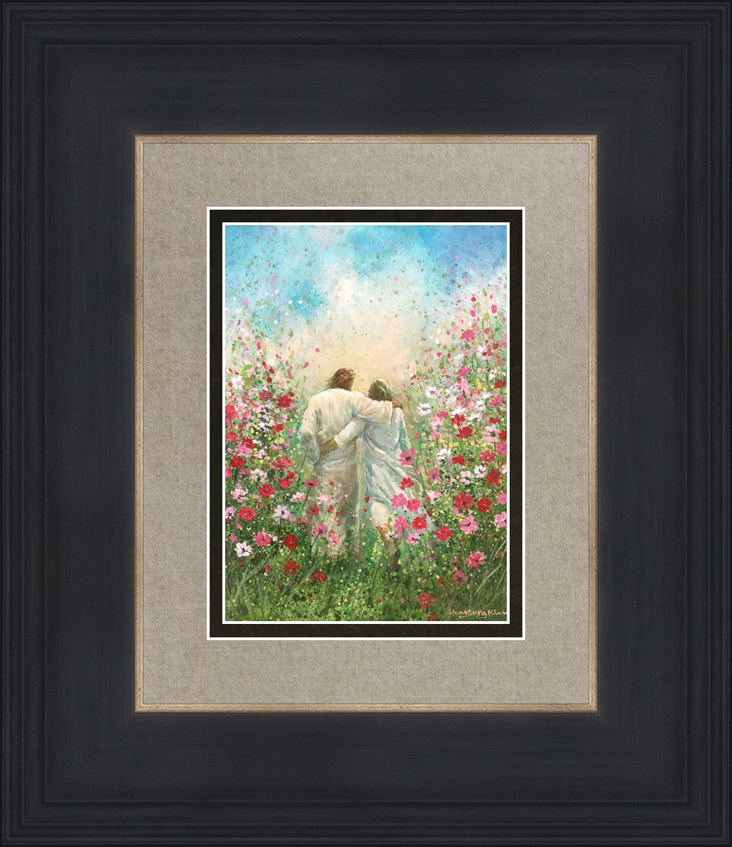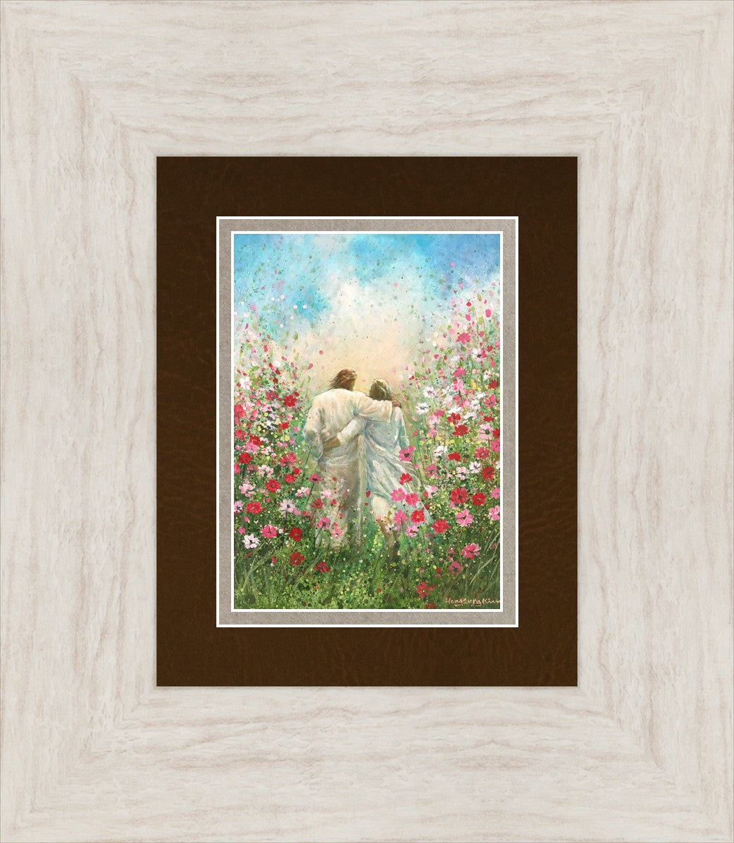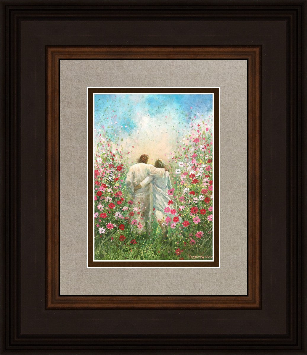 Divine Counselor by Yongsung Kim features Jesus Christ giving advice to a follower in white garments while walking arm in arm through a field of bright flowers