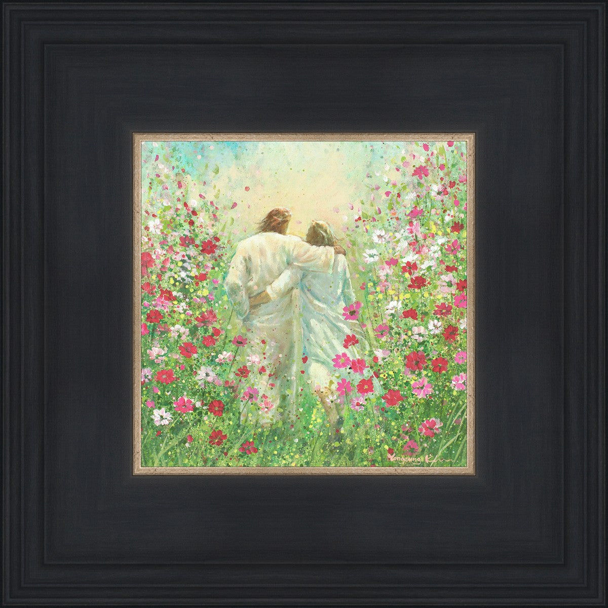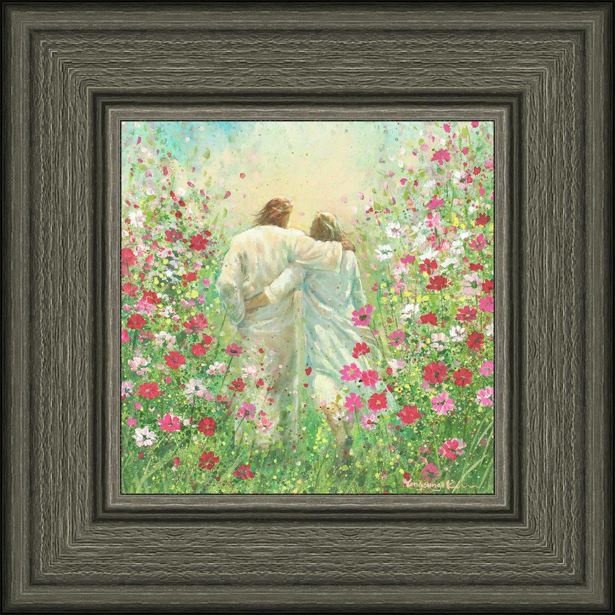 "Divine Companion" by Yongsung Kim portrays Jesus Christ offering guidance to a follower in a vibrant field of flowers. This piece captures the essence of faith, guidance, and the beauty of walking with Christ.