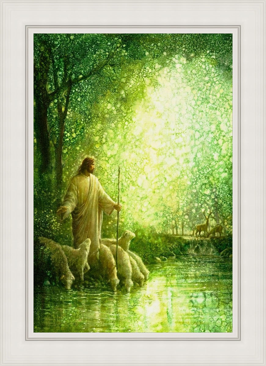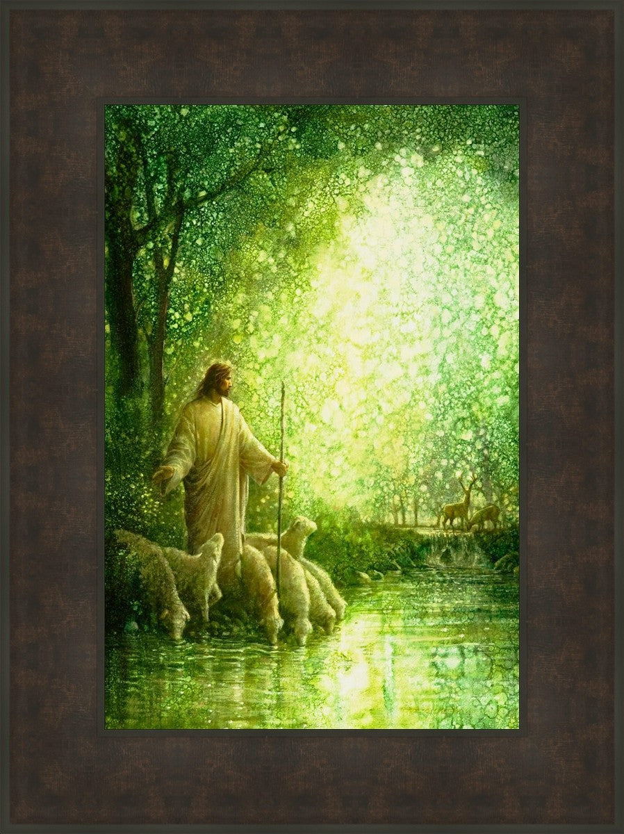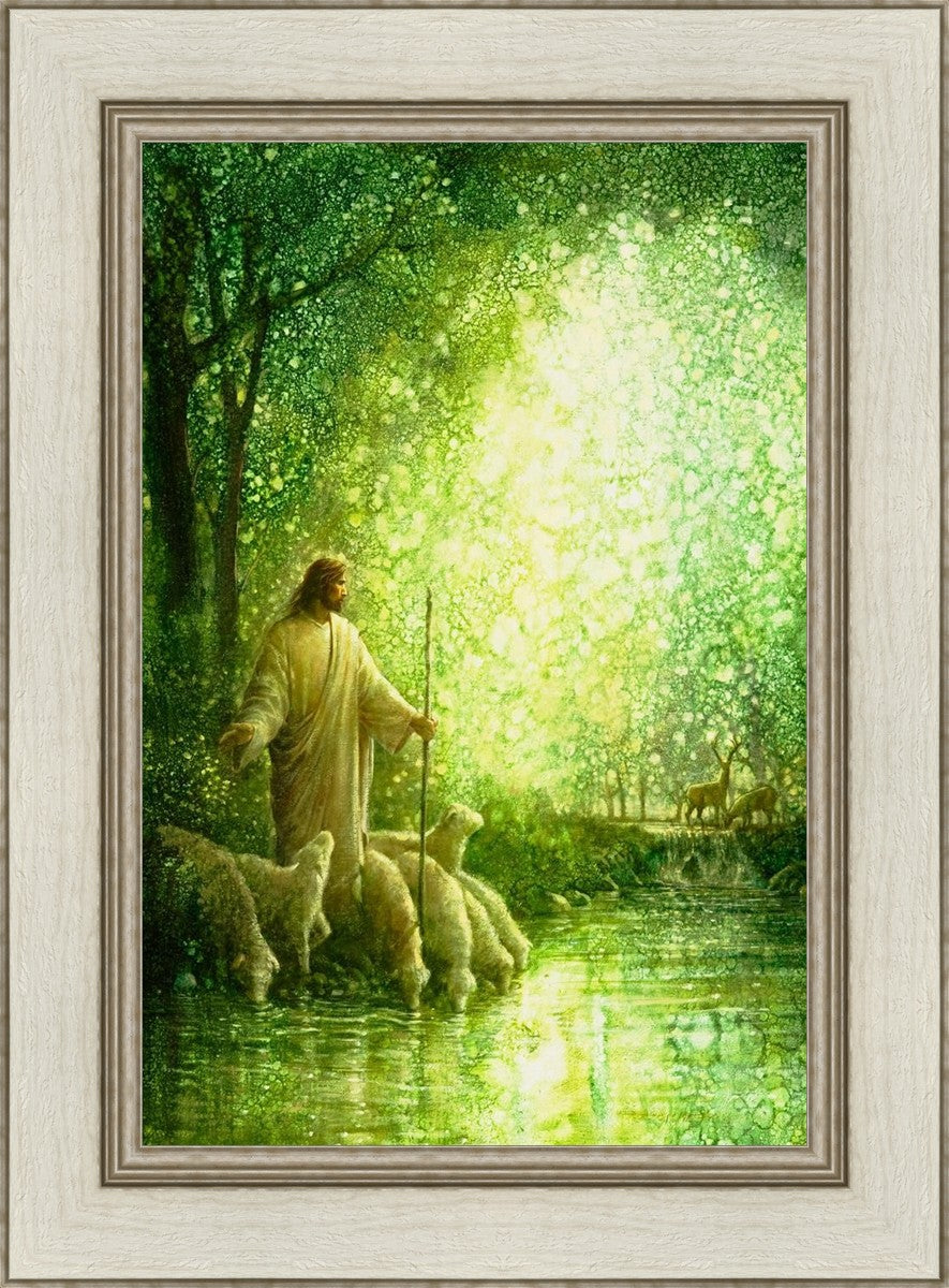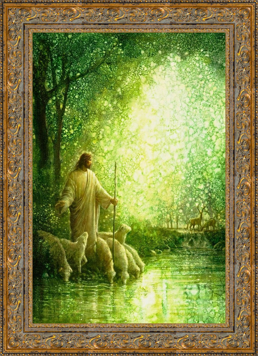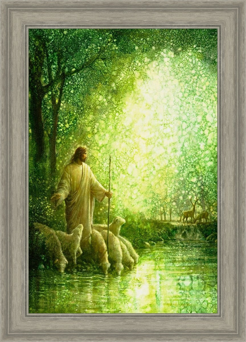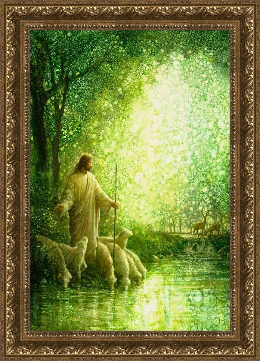 Feed My Sheep is a painting by Yongsung Kim. This painting depicts Jesus Christ watching over His flock while drinking at a pond.