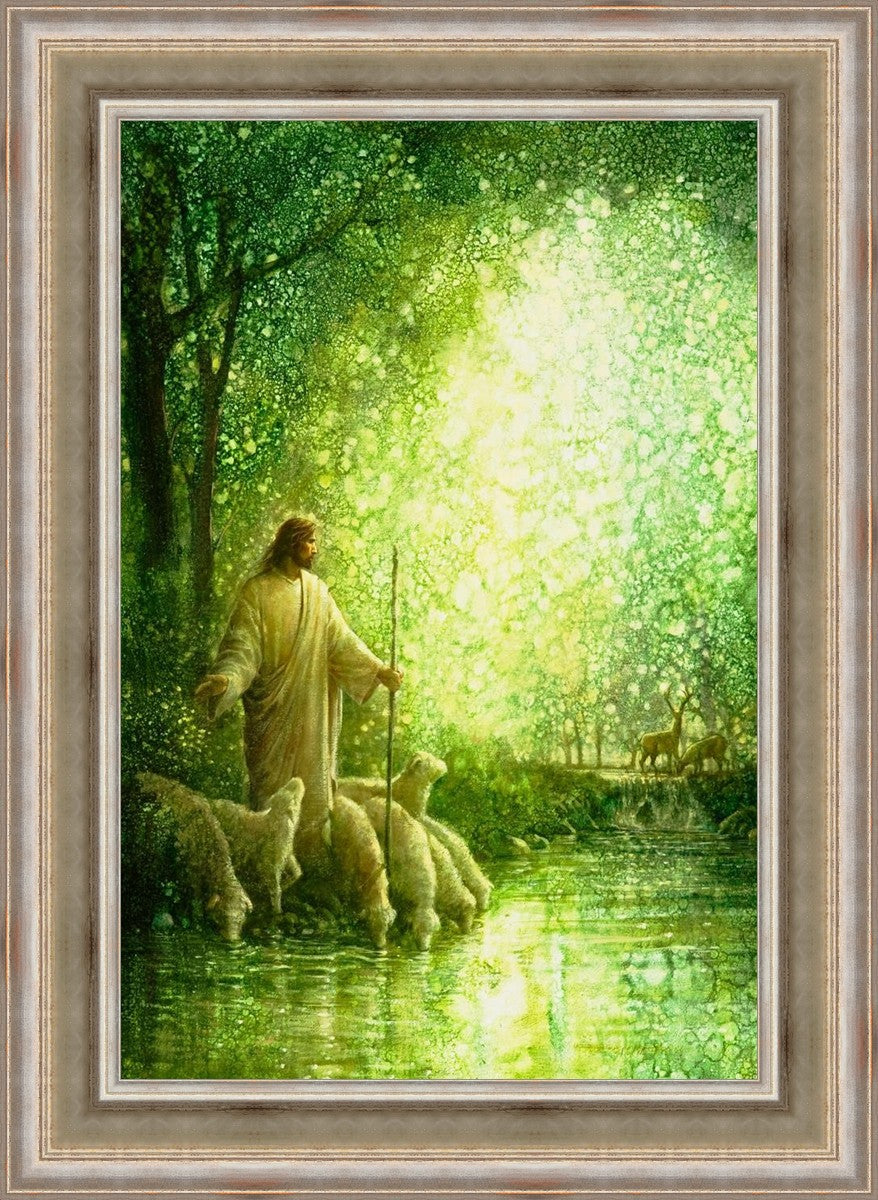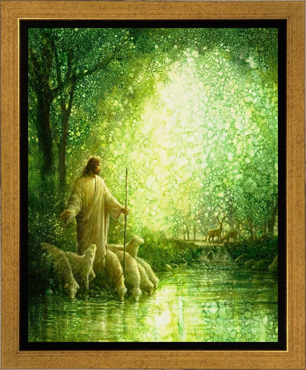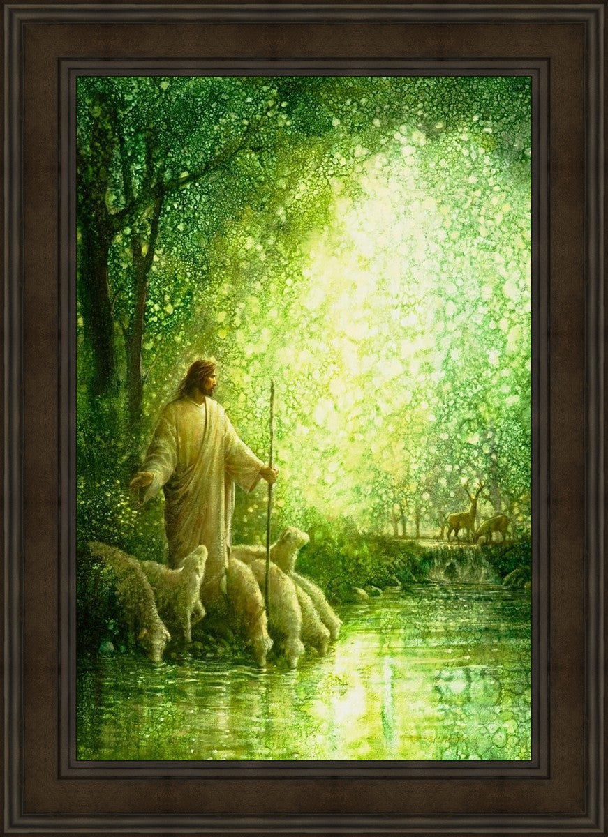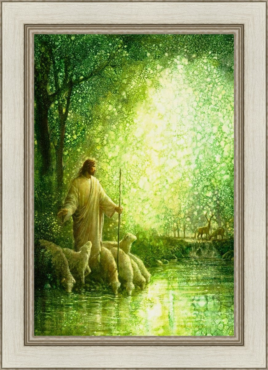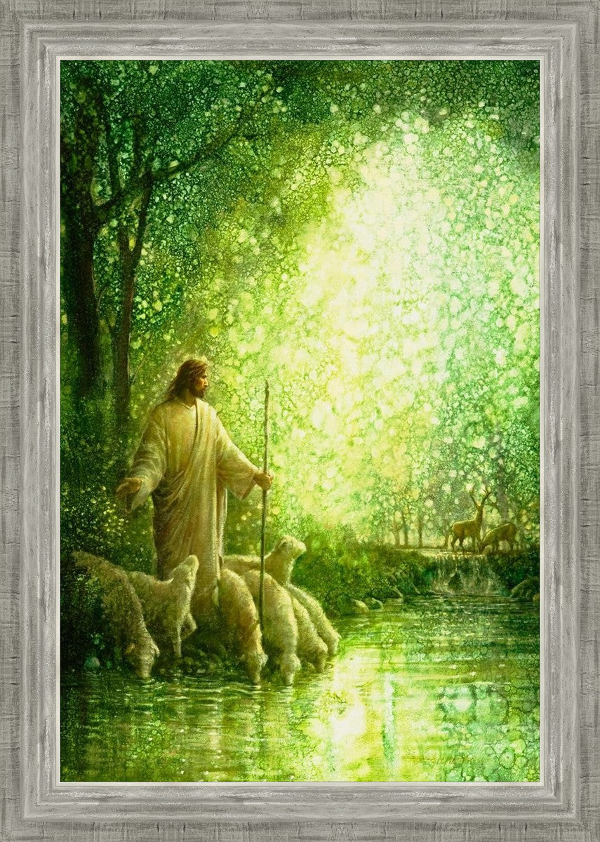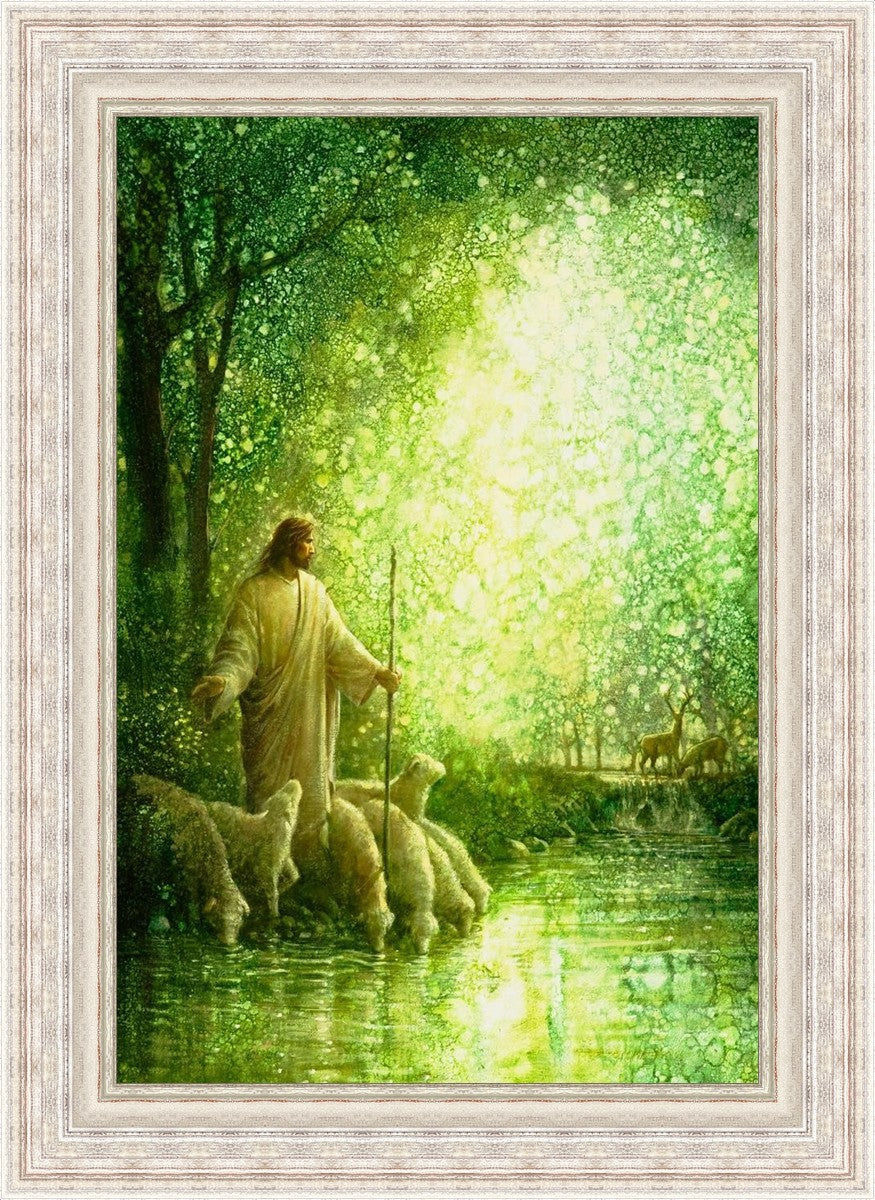 Feed My Sheep is a painting by Yongsung Kim. This painting depicts Jesus Christ watching over His flock while drinking at a pond.