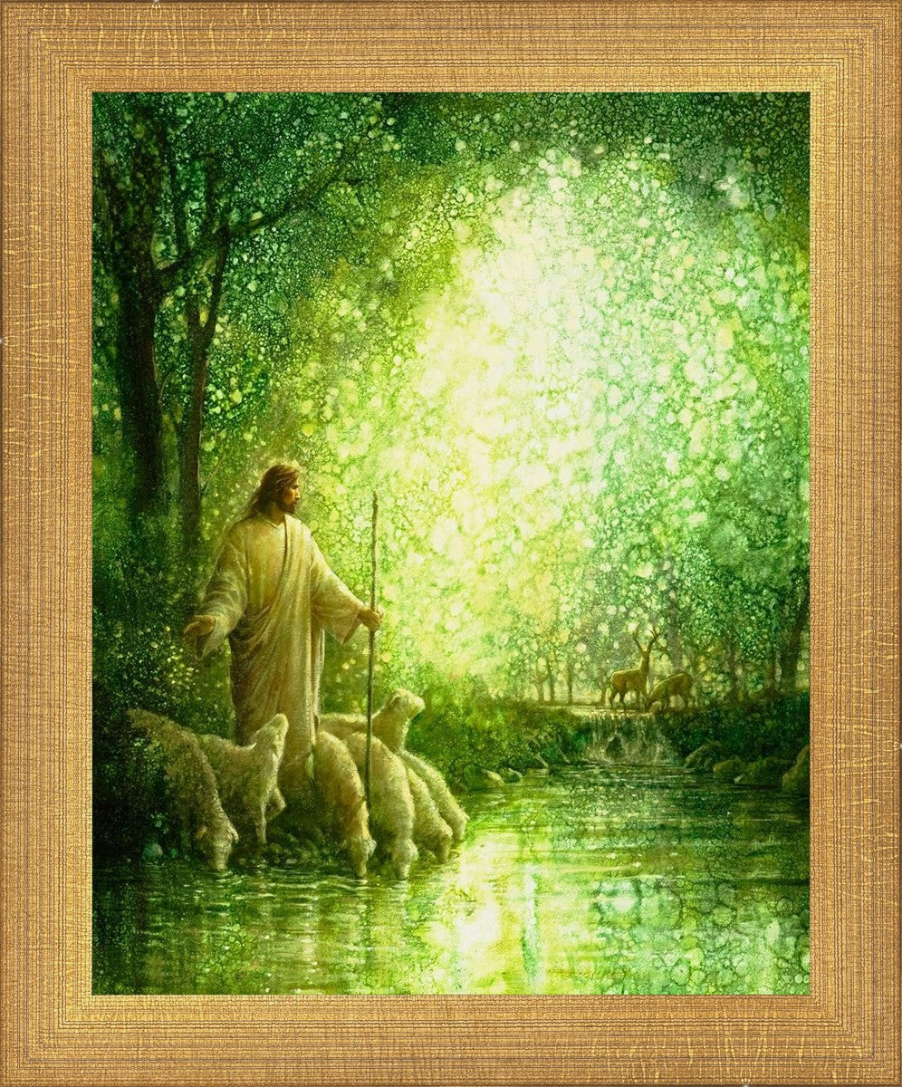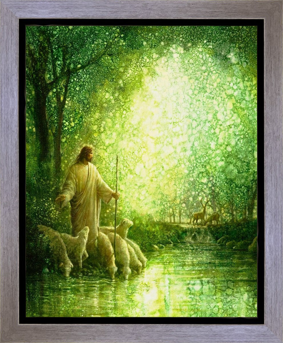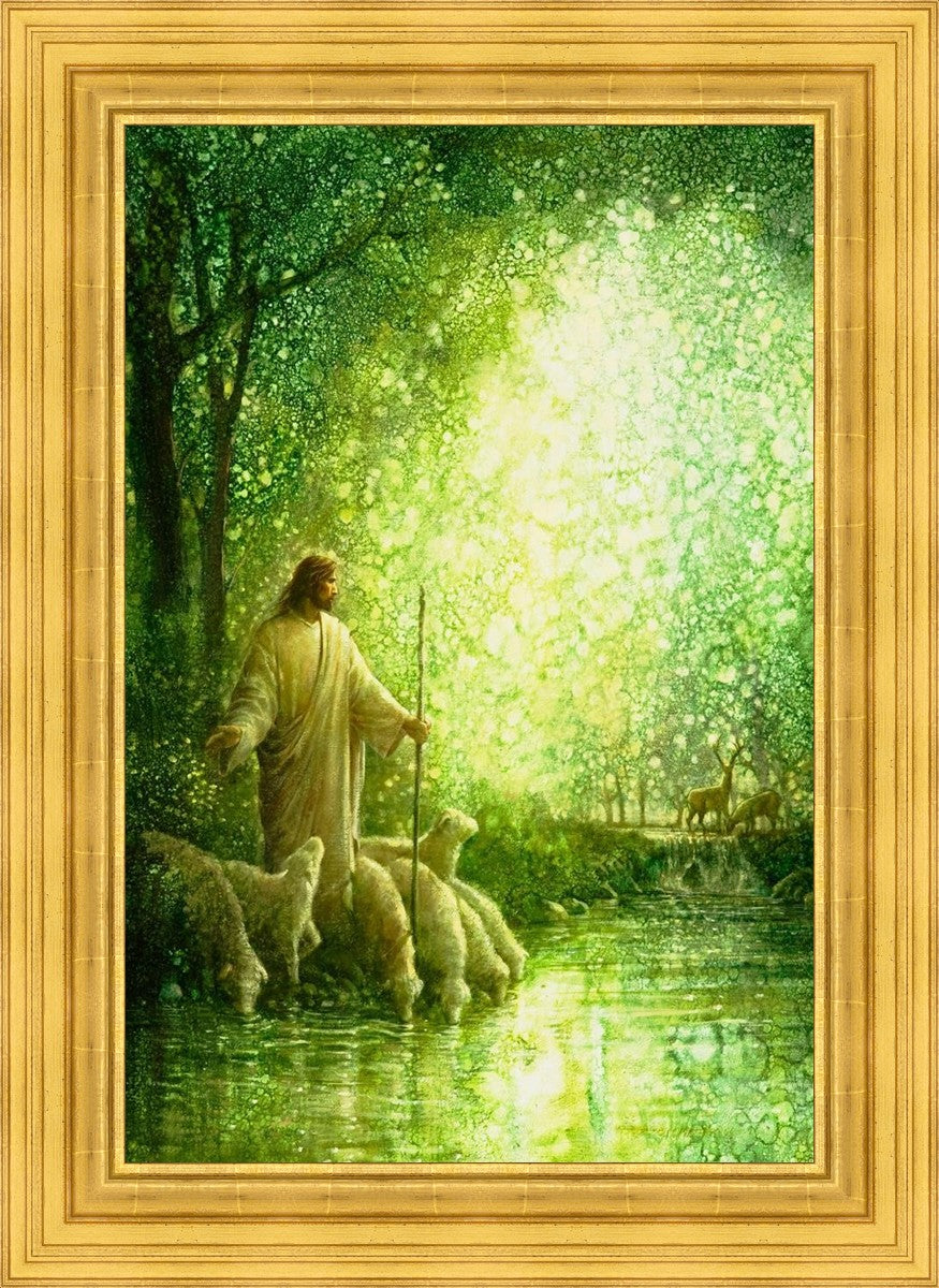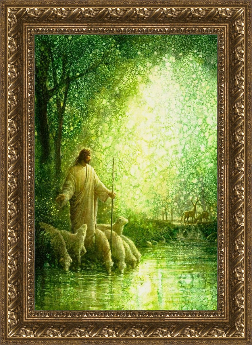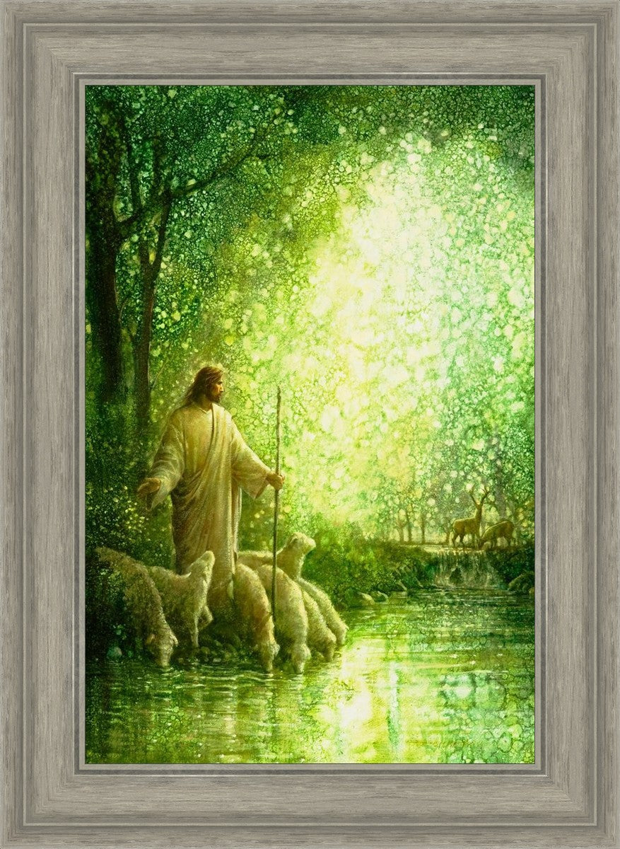 Feed My Sheep is a painting by Yongsung Kim. This painting depicts Jesus Christ watching over His flock while drinking at a pond.