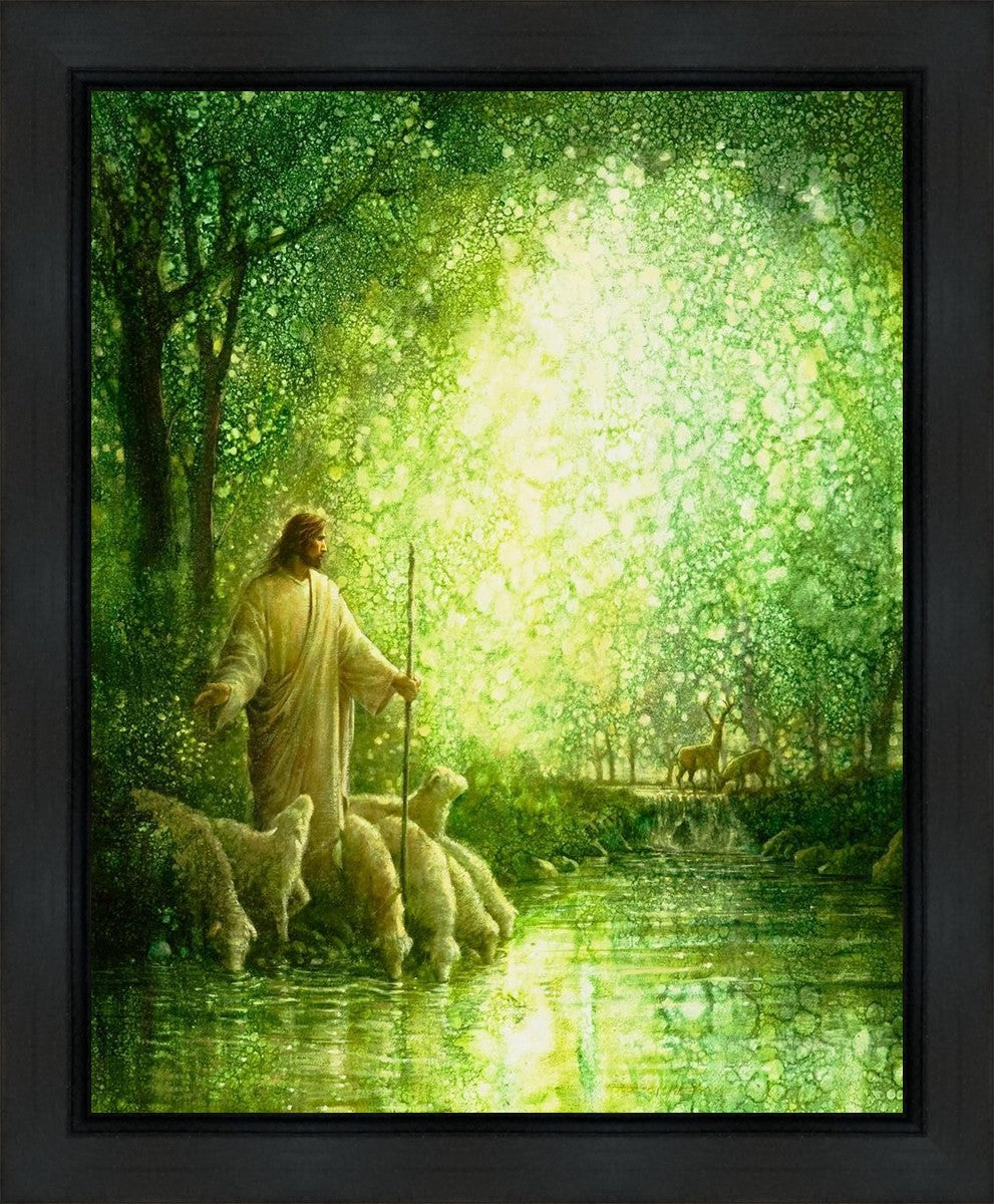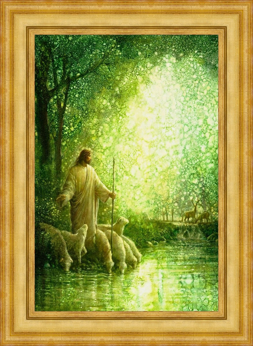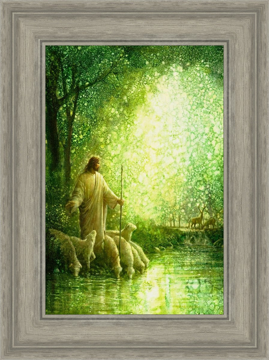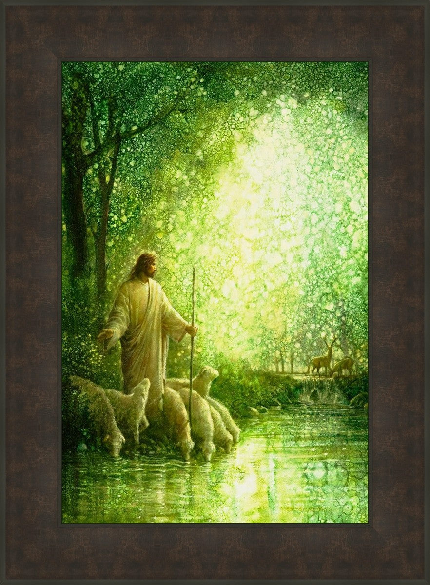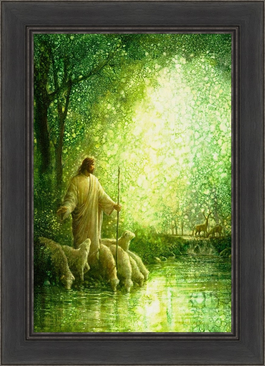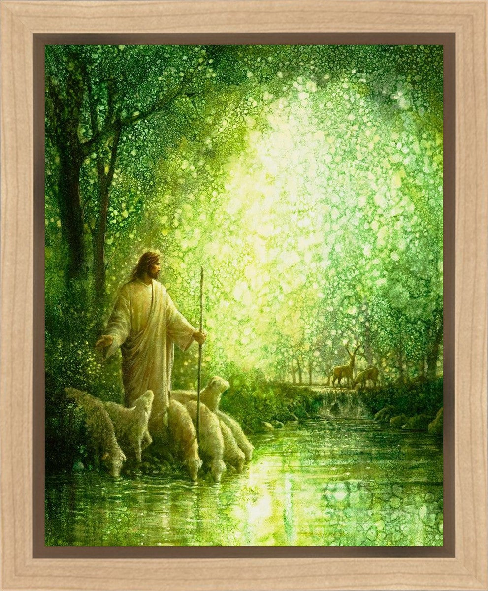 Feed My Sheep is a painting by Yongsung Kim. This painting depicts Jesus Christ watching over His flock while drinking at a pond.