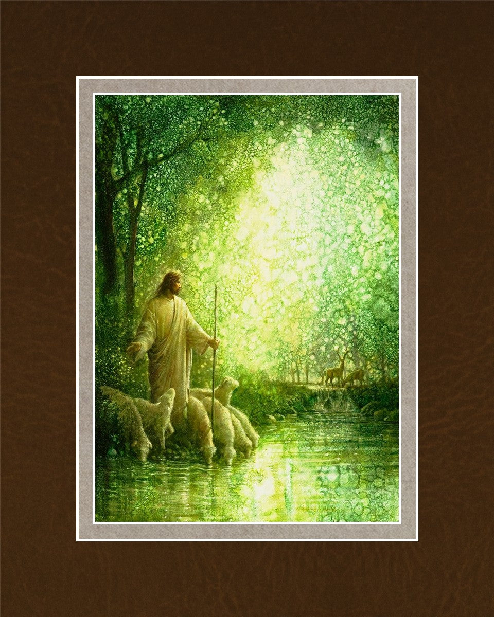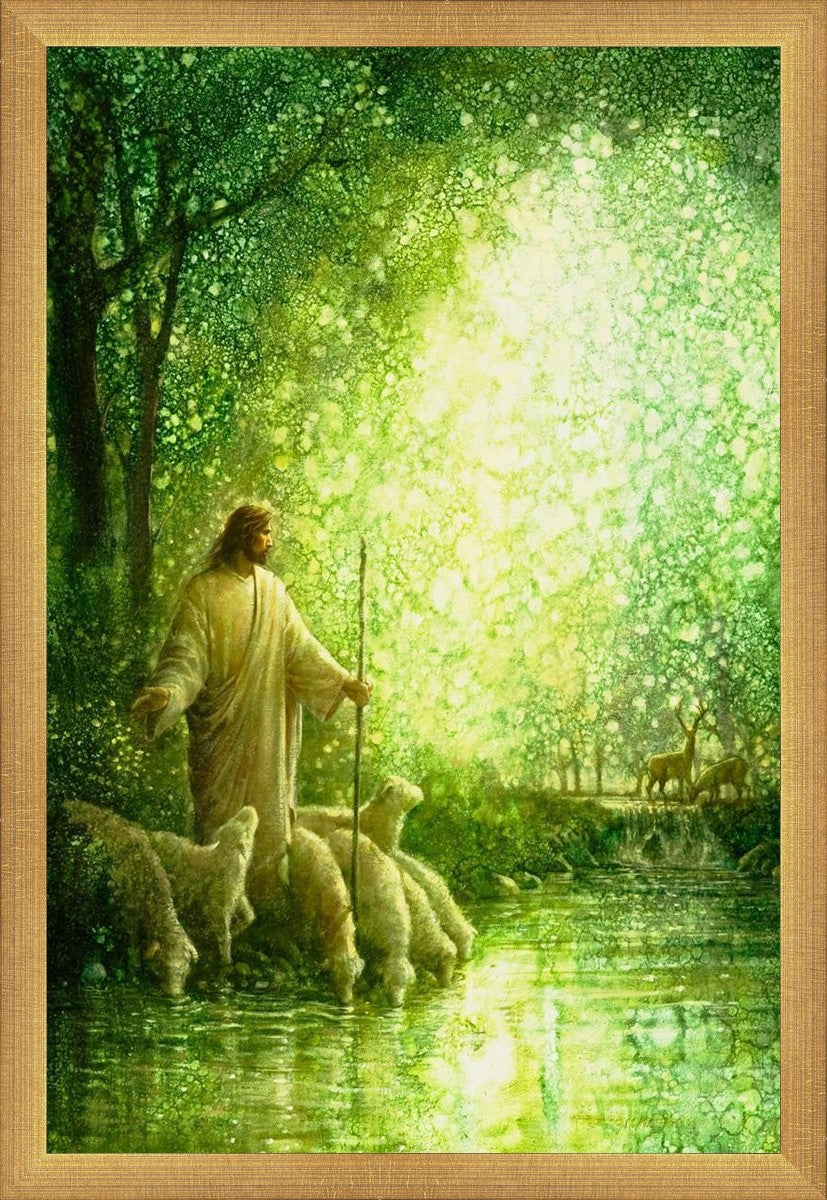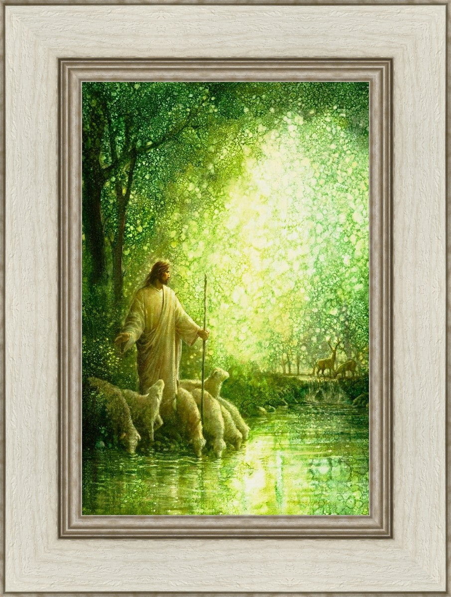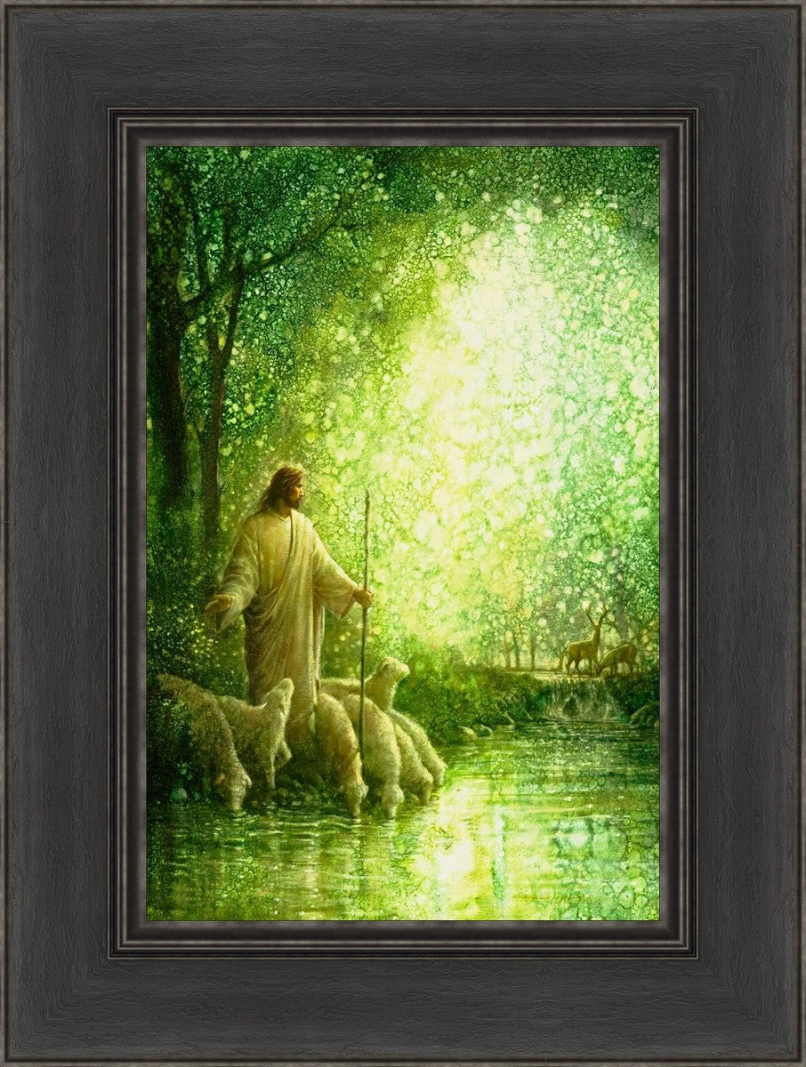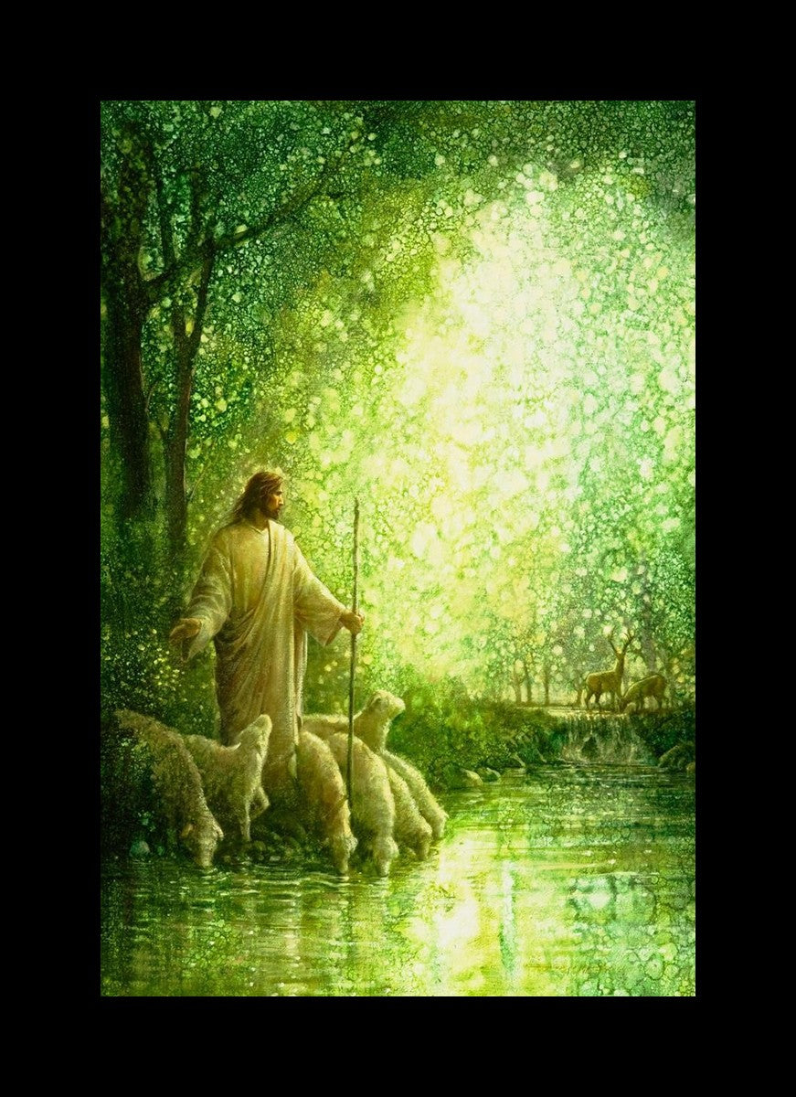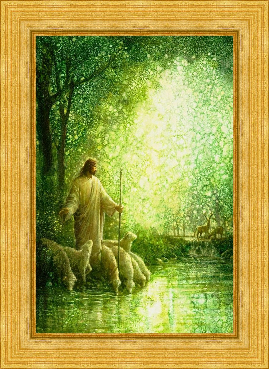 Feed My Sheep is a painting by Yongsung Kim. This painting depicts Jesus Christ watching over His flock while drinking at a pond.