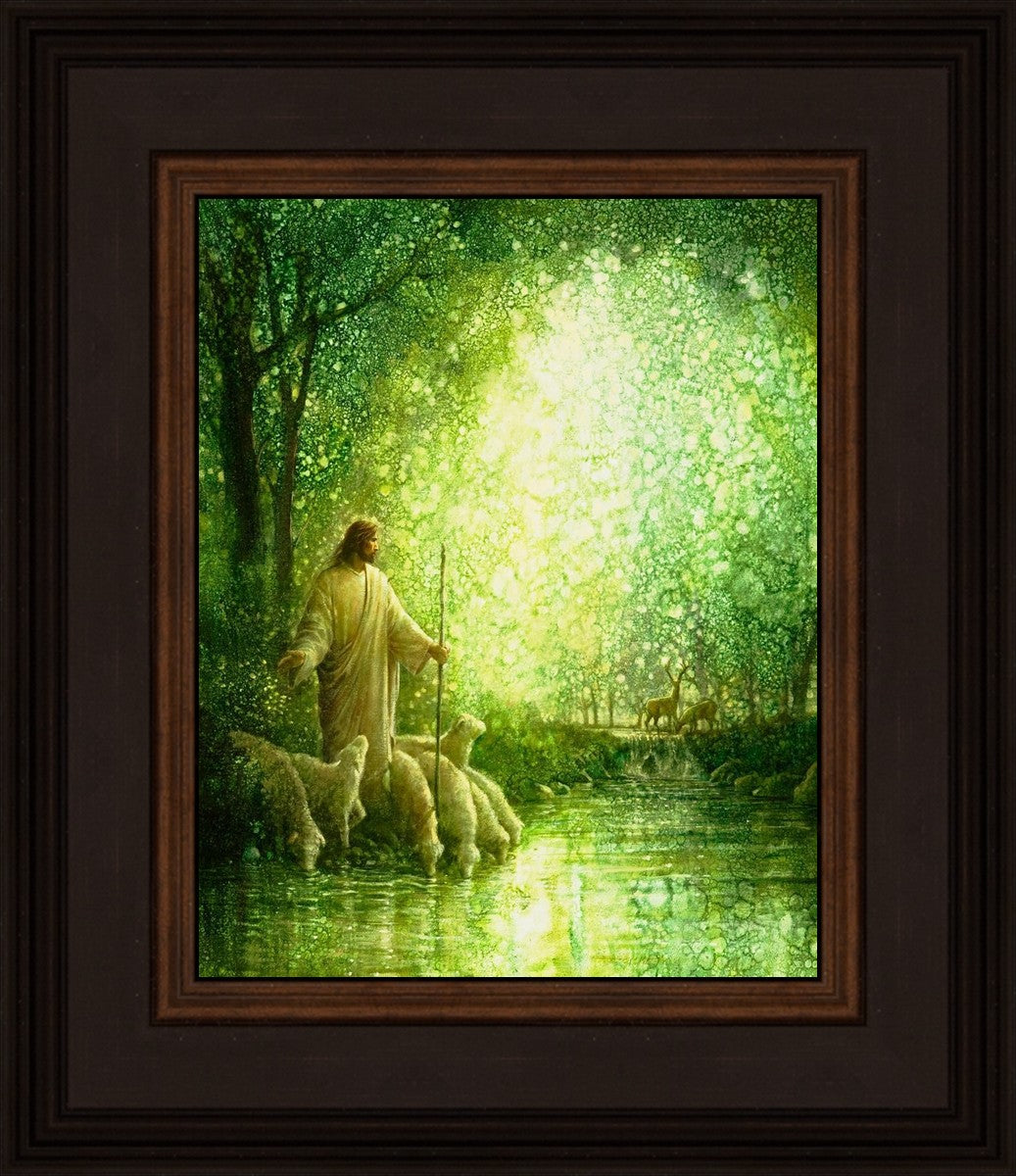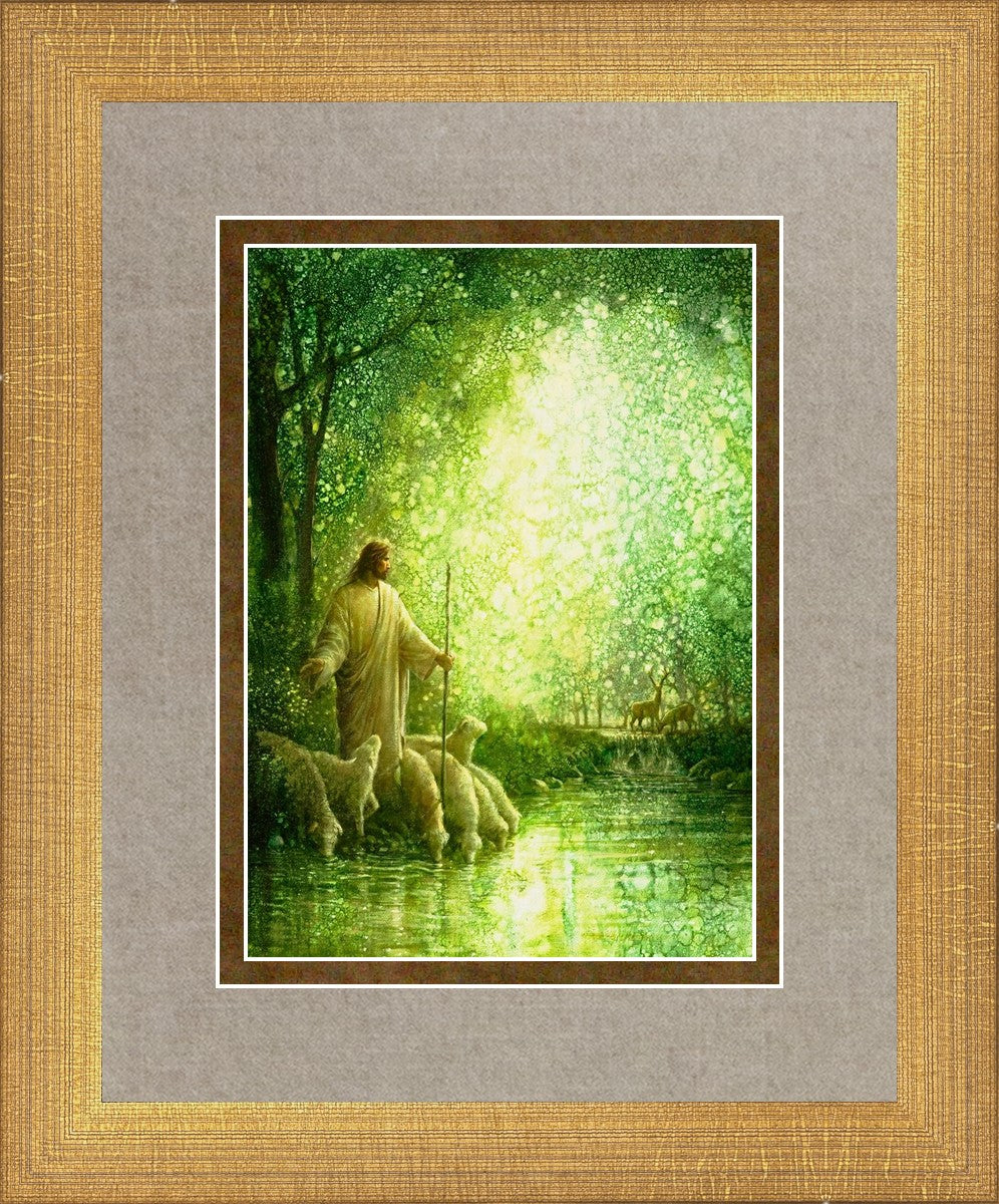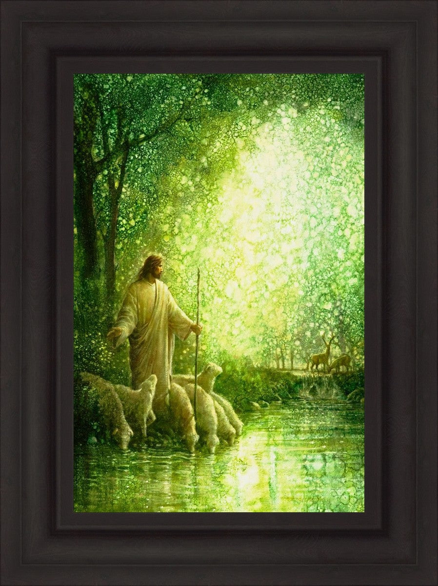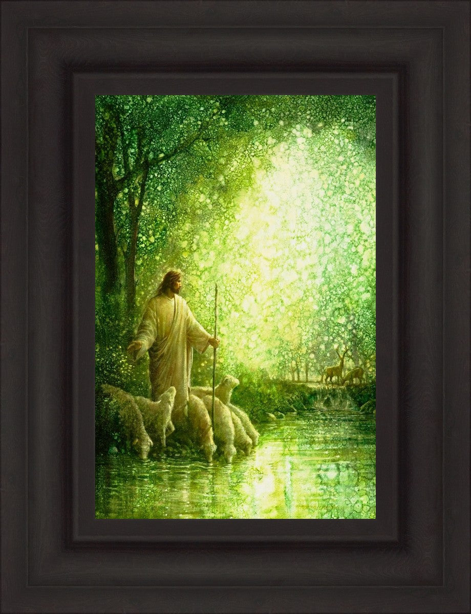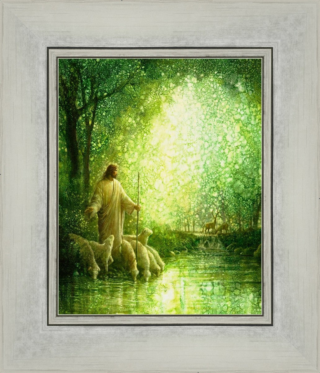 Feed My Sheep is a painting by Yongsung Kim. This painting depicts Jesus Christ watching over His flock while drinking at a pond.