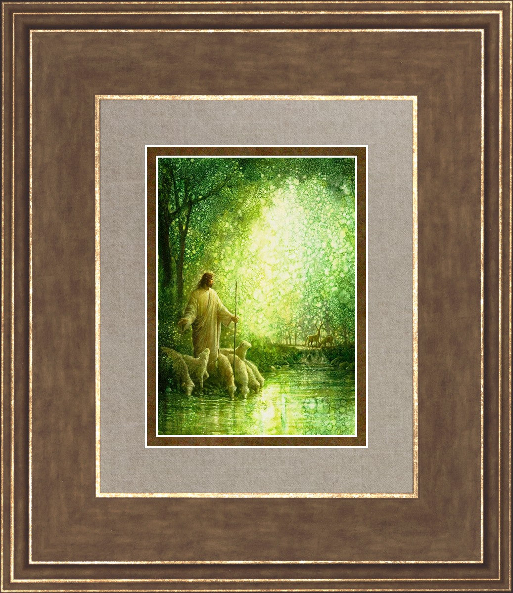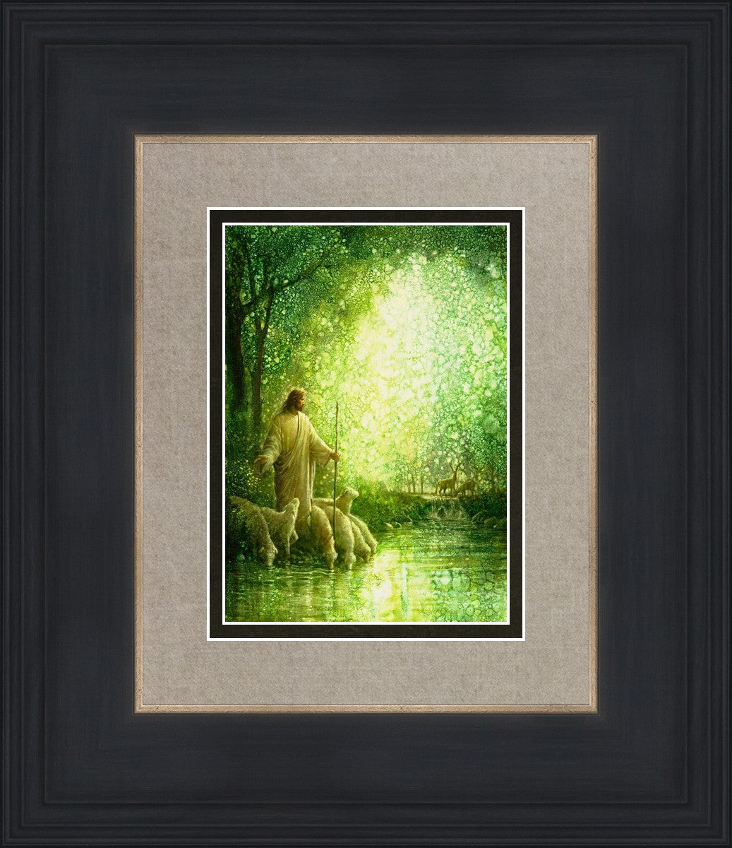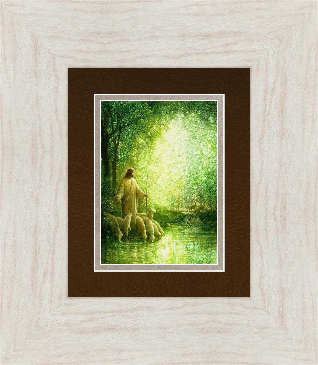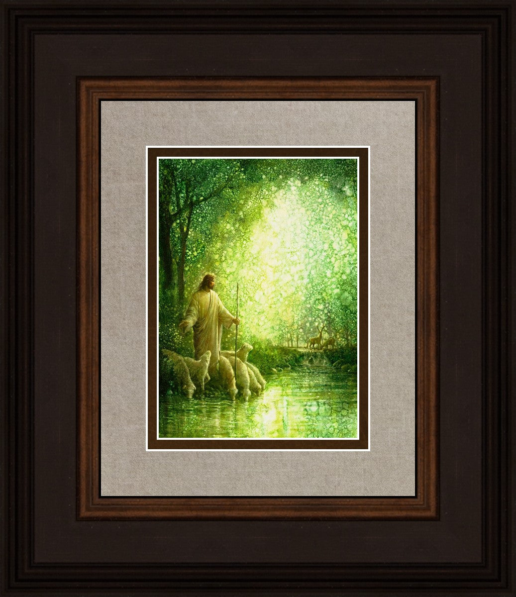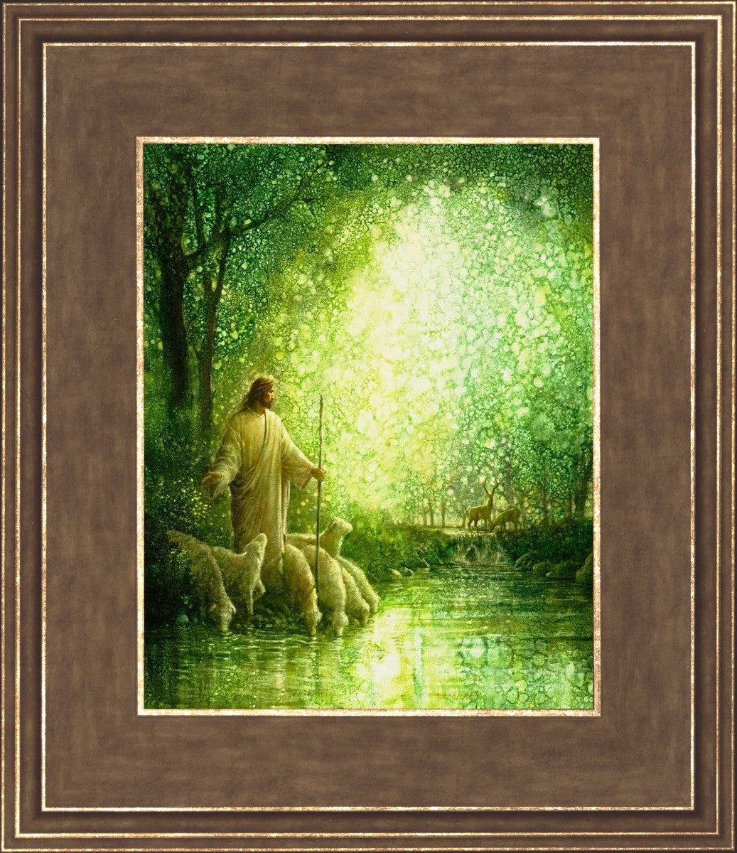 Feed My Sheep is a painting by Yongsung Kim. This painting depicts Jesus Christ watching over His flock while drinking at a pond.