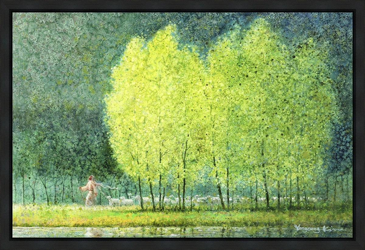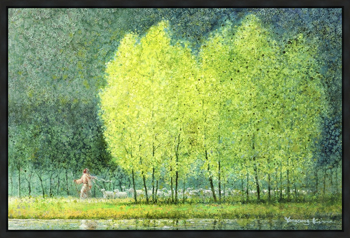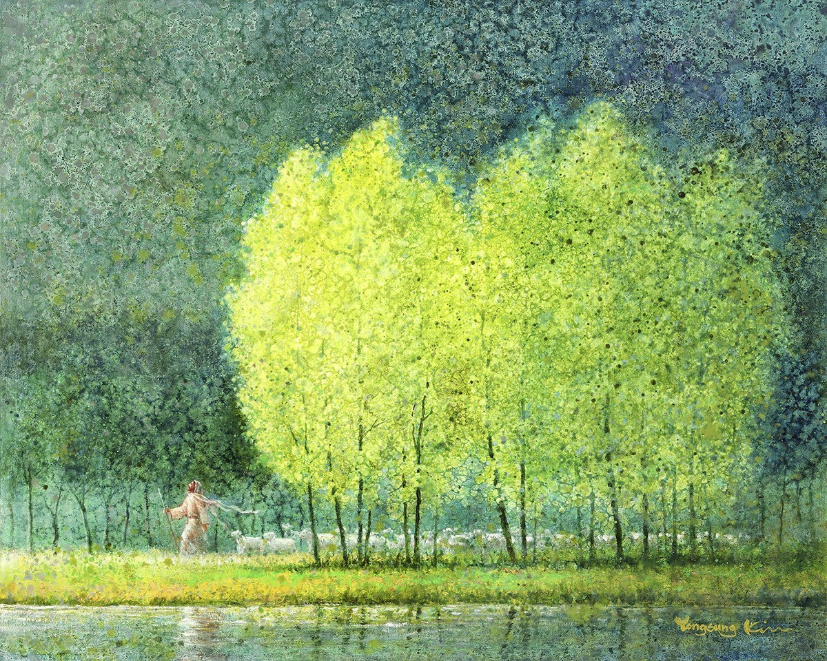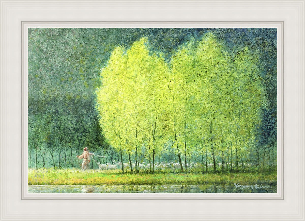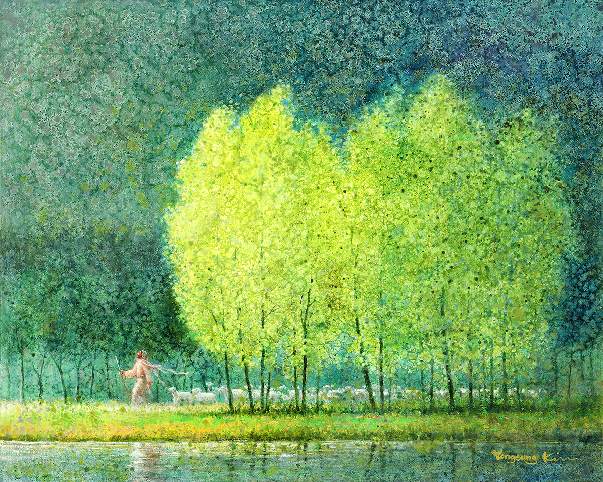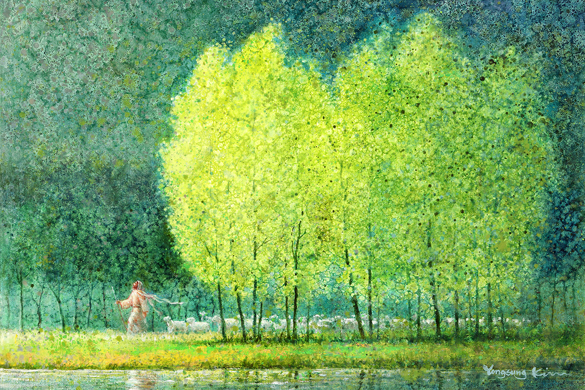 Painting of Follow In His Footsteps by Yongsung Kim featuring Jesus Christ guiding his flock of sheep through a grove of greens and blues