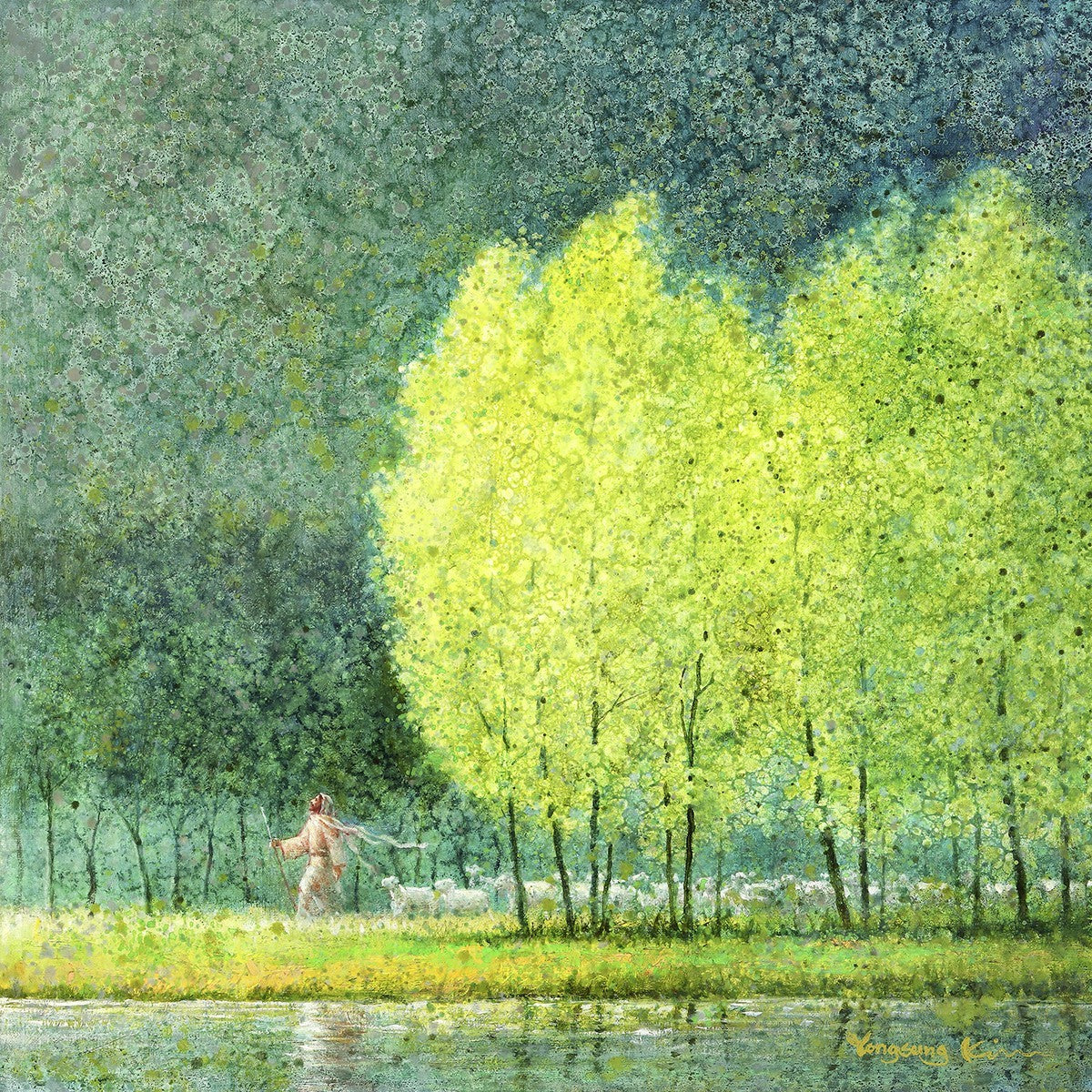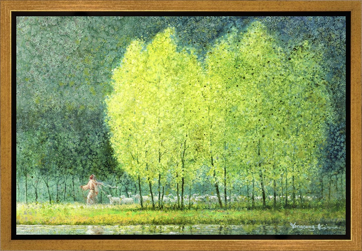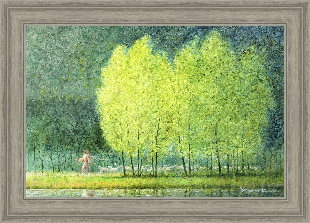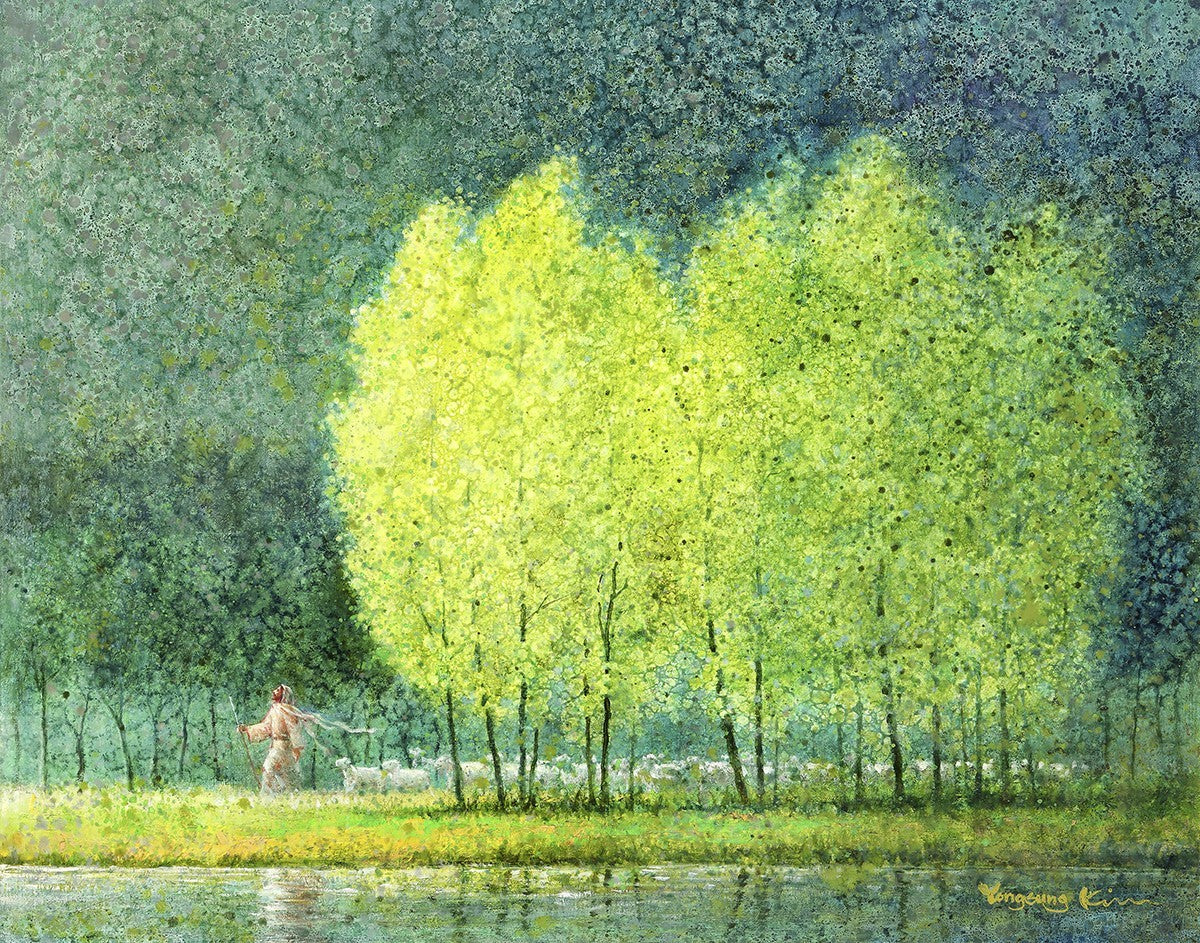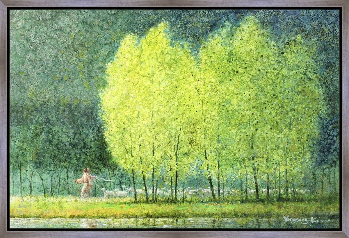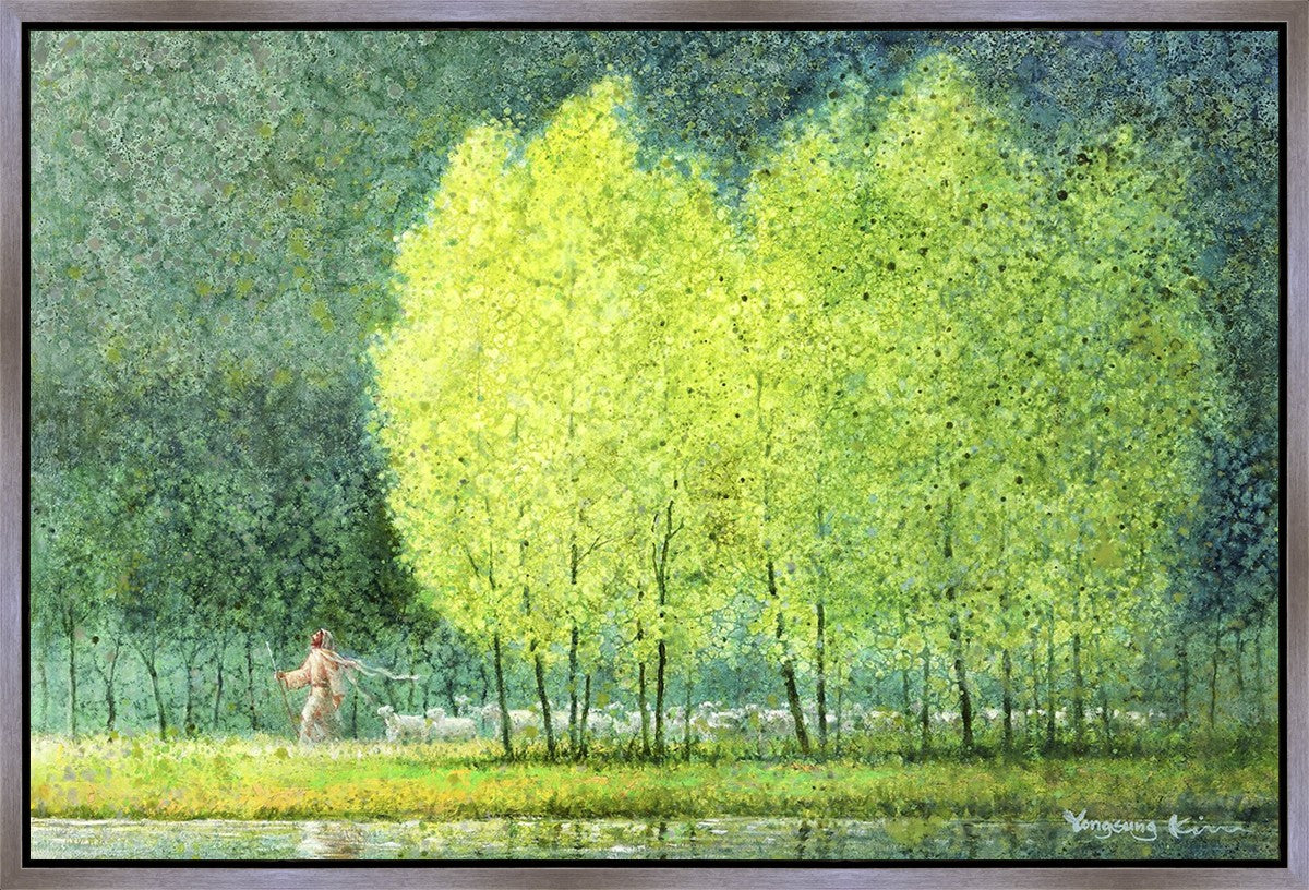 Painting of Follow In His Footsteps by Yongsung Kim featuring Jesus Christ guiding his flock of sheep through a grove of greens and blues